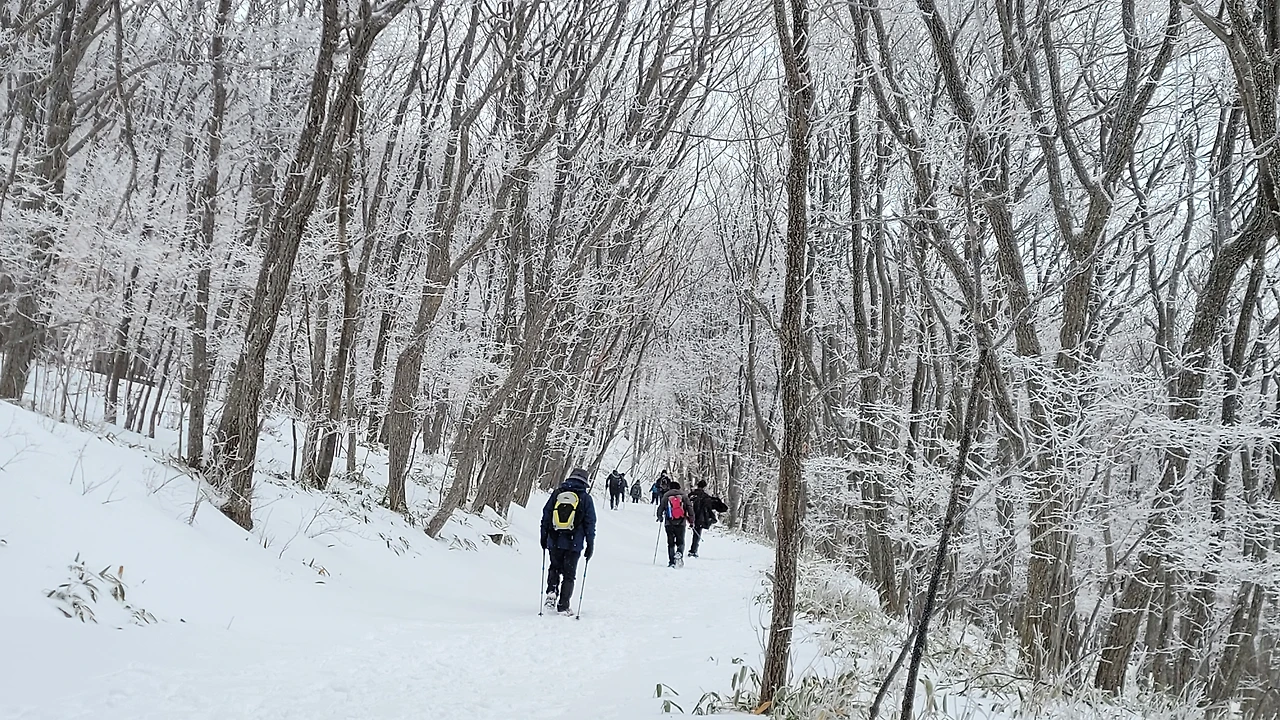 행로는 오르내린다. 확실히 오르는 길에는 호흡이 가빠진다. 푹푹 빠지는 눈 속을 걷는 것이 평지보다 에너지를 많이 쓰게 된다. 아무리 밟아도 순결함 그대로인 깨끗한 눈에 마음을 빼앗긴다. 습기를 머금지 않은 눈은 마구 밟아도 흩어질 뿐 다져지지 않는다. 내린 모습 그대로 정결하다. 떼는 발걸음마다 정신이 맑게 깨어난다. 지칠 법도 하지만 비슷한 것 같아도 조금씩 달라지는 주변 경관과 새로움에 대한 호기심으로 계속 길을 간다.