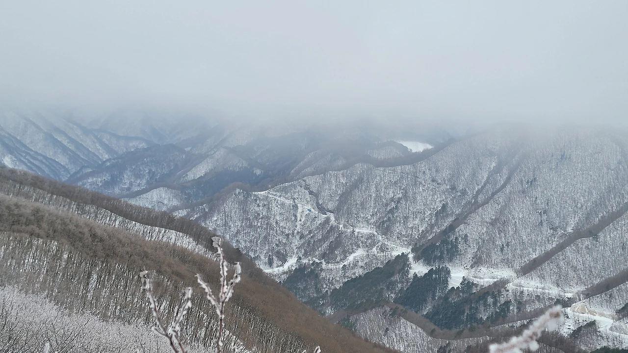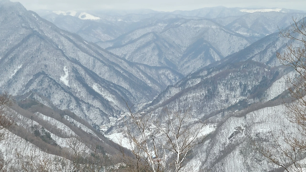 깊은 산중이지만 멀리 보이는 경치는 기대를 넘어서지 못했다. 벌목 작업을 한 흔적도 보이고 산세도 생각보다 평범하다. 계속 걸으며 주위를 둘러보지만 눈에 띄는 장면이 없다. 그러다 풍경 하나가 눈길을 끈다. 회화처럼 굵은 선으로 윤곽을 선명히 그린 중첩된 산의 경치가 들어온다. 나무에 시야가 가려 전망이 좋은 곳을 찾아 제대로 된 경관을 사진에 담는다. 그림 한 점을 얻은 기분이다.
