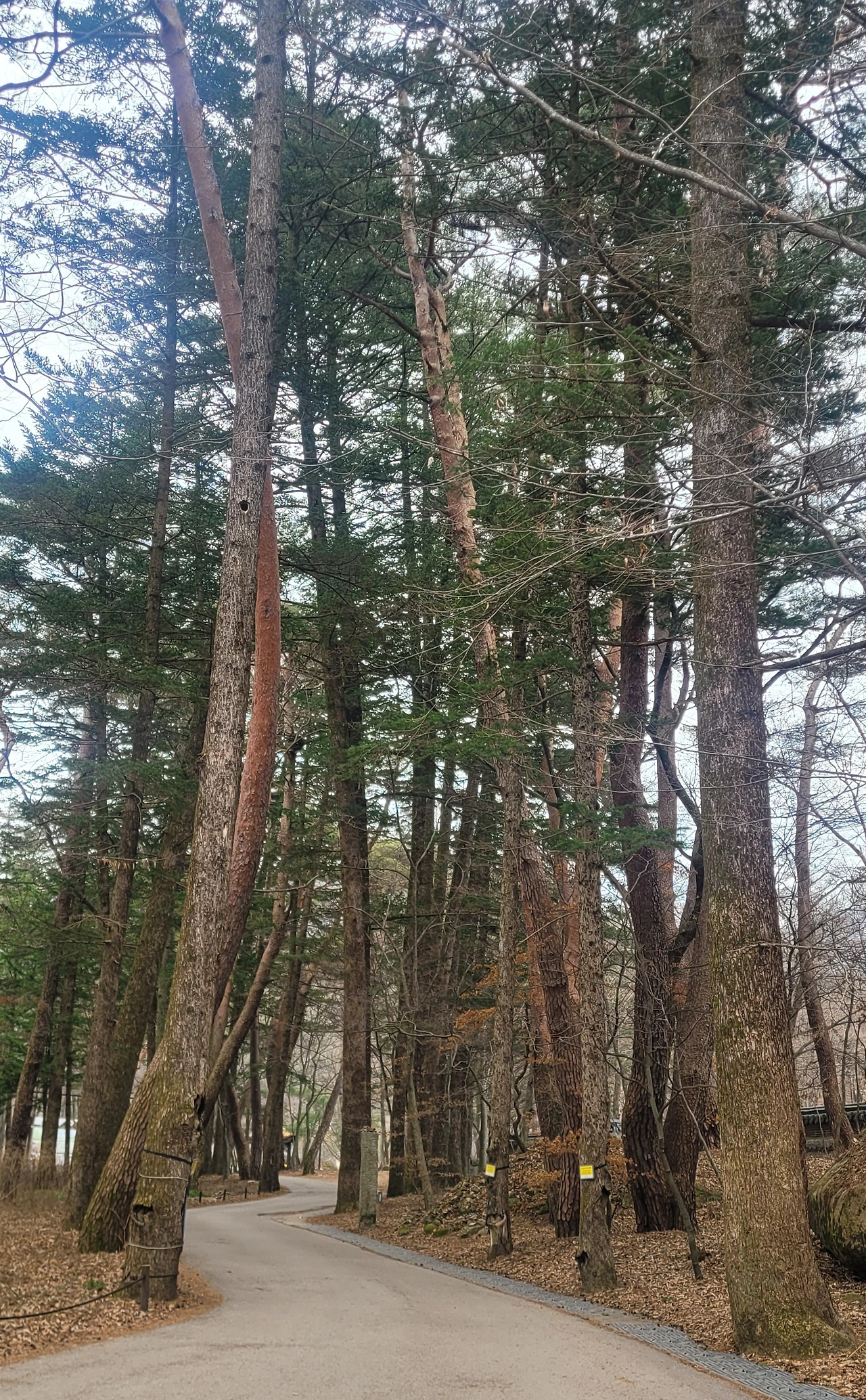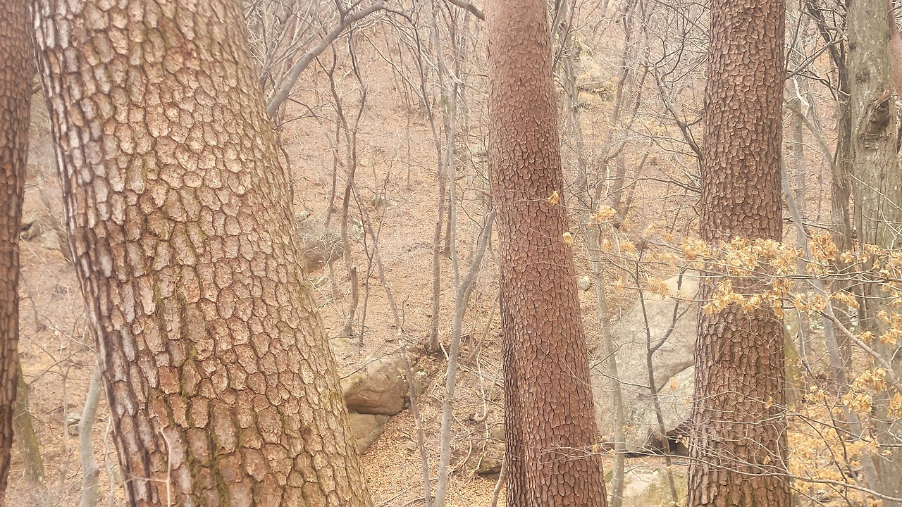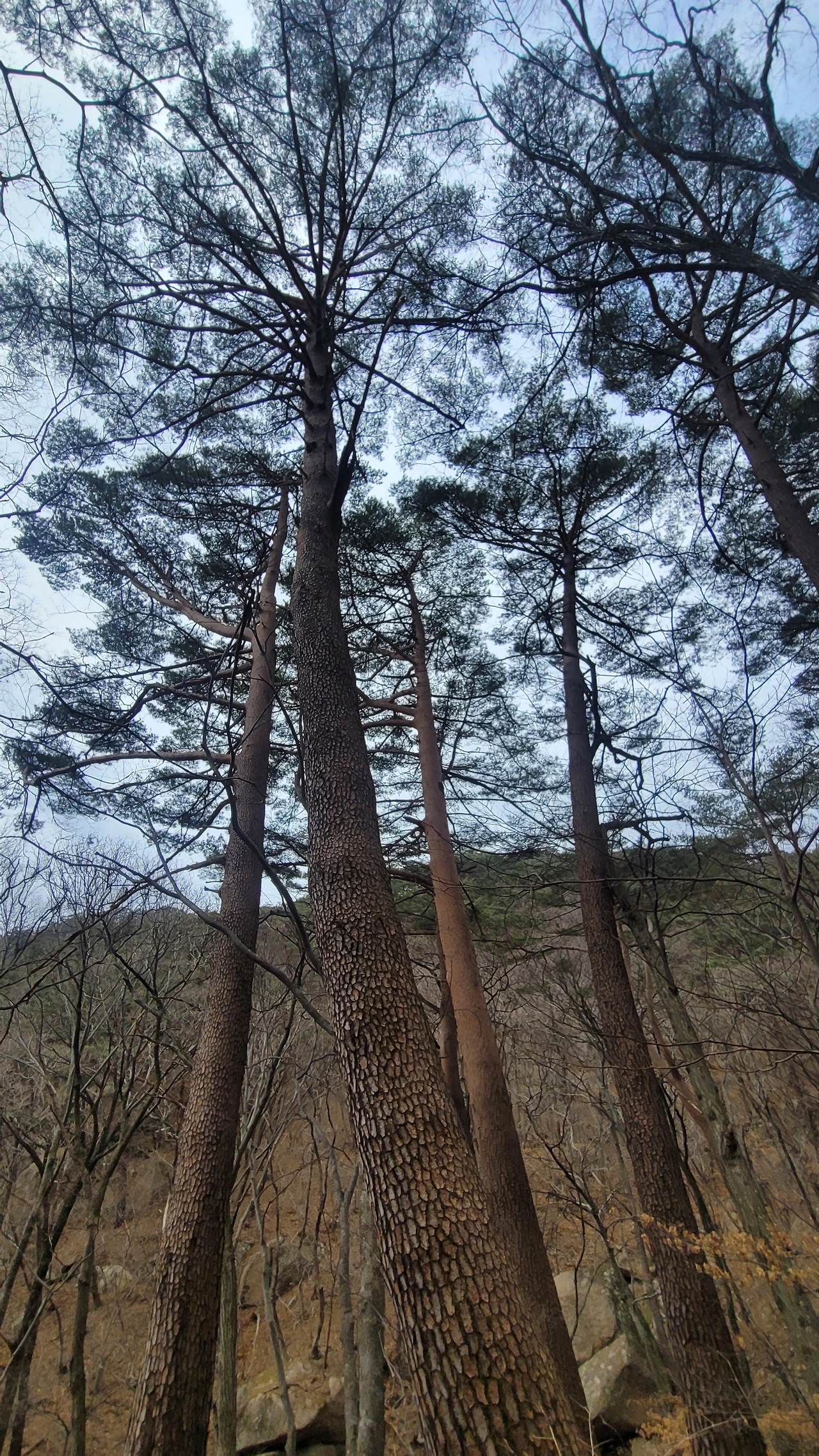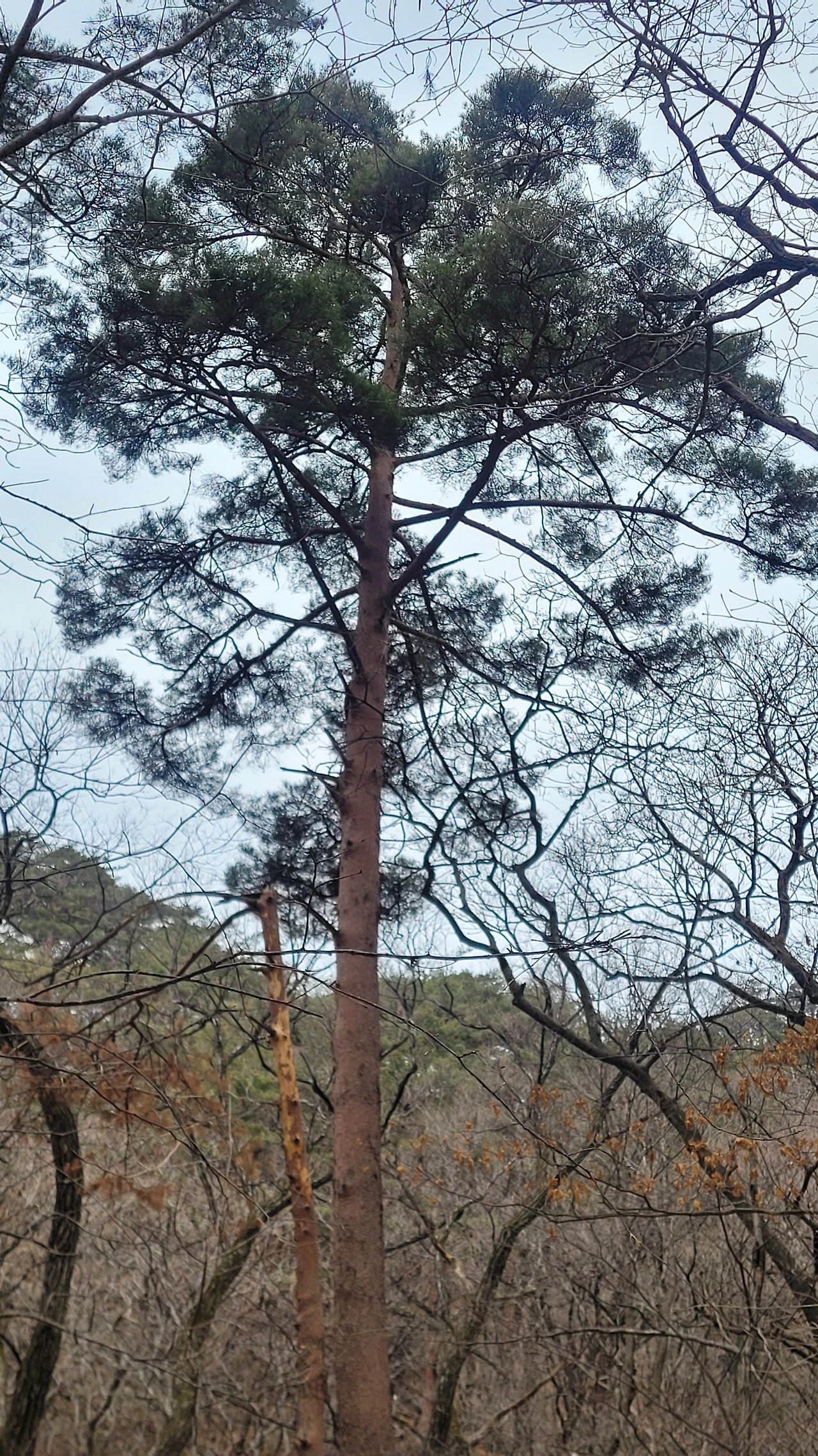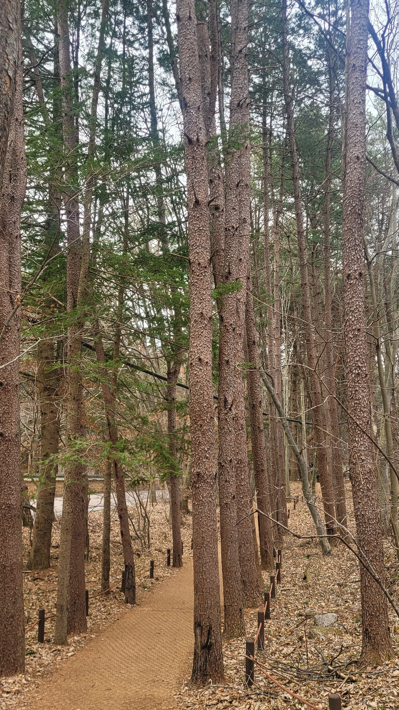 산길이 마냥 단조롭지 않은 것은 늘 푸른 나무들이 있어서다. 앙상한 갈색 겨울나무 사이로 소나무, 전나무, 잣나무가 생기 있는 푸른 잎들로 우리를 반긴다. 이곳은 특히 미인송들이 심심치 않게 자란다. 단정하고 규칙적인 수피가 붉은 고운 빛을 머금고 굵은 몸통이 늘씬하게 빠진 소나무가 아름답다. 푸른 솔잎들도 그에 한몫을 하고 있다.