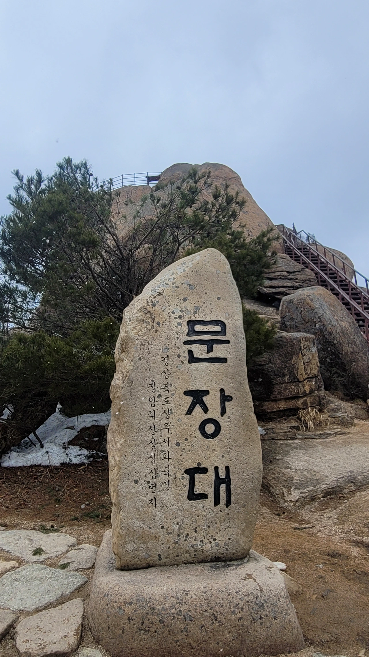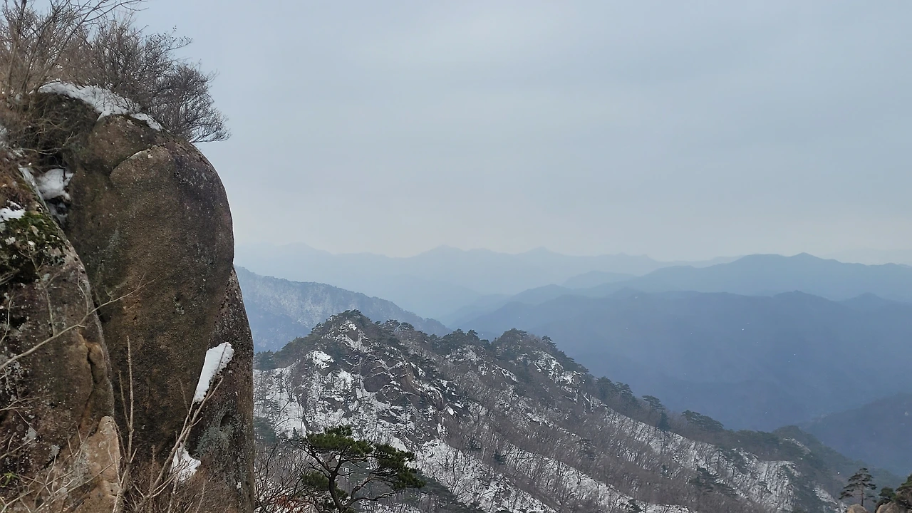 문장대에 올라 탁 트인 사방을 돌아보는 쾌감을 누린다. 굽이치는 산자락이 드넓게 펼쳐져 있다. 눈이 아주 시원하고 가슴도 상쾌해진다. 북쪽에는 눈 쌓인 산봉우리가 아직도 겨울이다. 흰 눈과 암석과 소나무가 빚는 설경이 빛난다. 아마도 마지막으로 즐기는 겨울의 풍광이 아닐까 싶다.