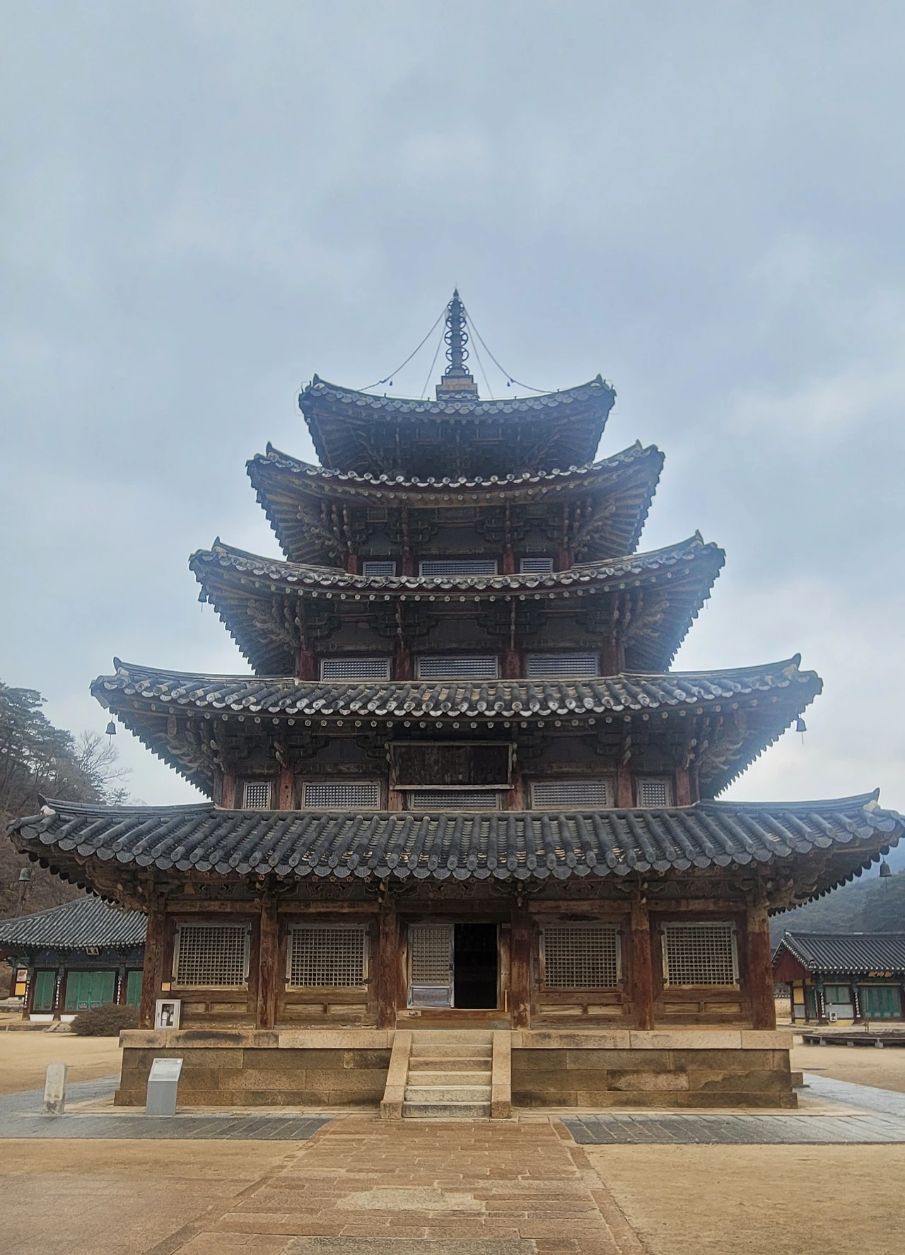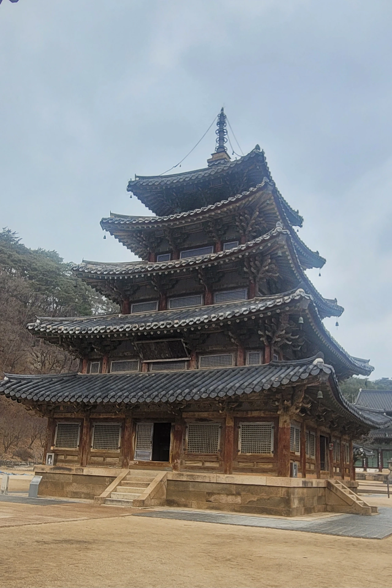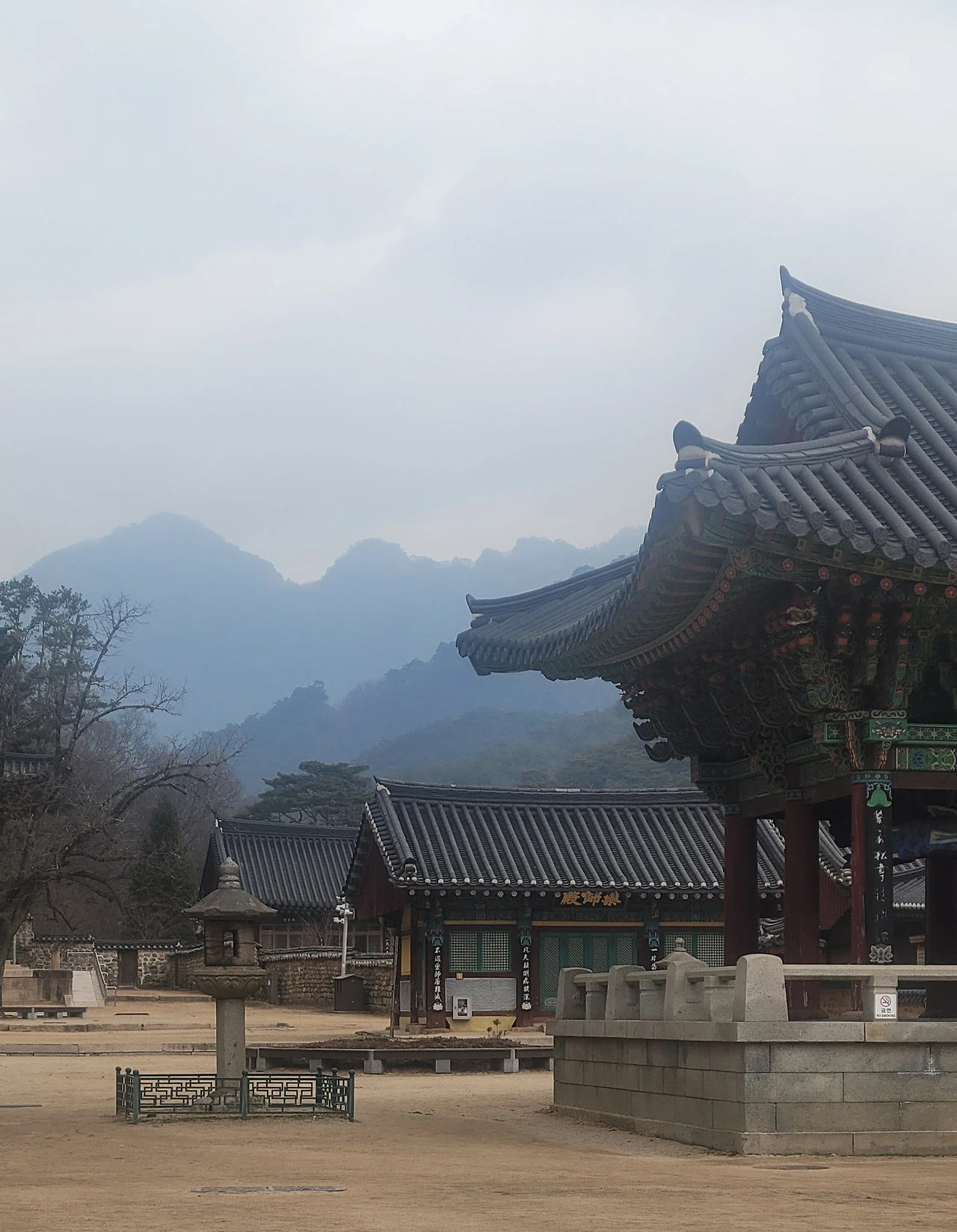 등산길 끝자락에는 천년 고찰 법주사가 있다. 우리나라 유일한 목탑인 팔상전, 석련지, 쌍사자 석등 같은 국보를 비롯한 많은 문화재와 유물이 있는 유서 깊은 절이다. 어마어마한 규모의 금동미륵대불도 눈길을 끈다. 푸근하고 넉넉한 미소가 인상적이다. 멀리 산자취가 아련한 아래 고즈넉한 가람 풍광이 마음에 깃든다. 가랑비가 뿌리는 음울한 날이지만 오히려 고요한 절의 분위기와 잘 어울린다. 선명한 풍경을 사진에 담을 수 없어 아쉽다. 하지만 멜랑코리 한 분위기는 괜찮아 보인다.