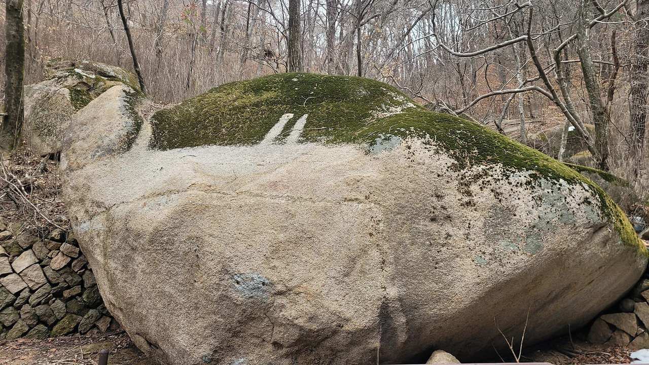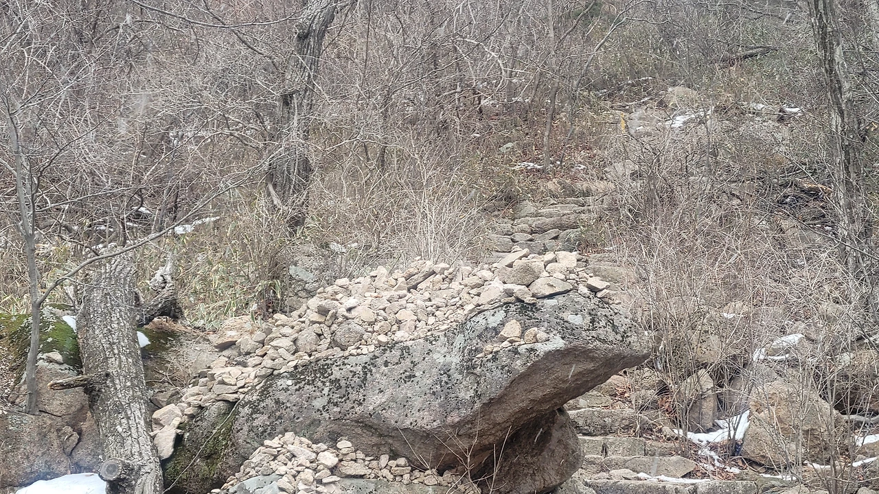 산자락에 큰 암석이 많이 포진해 있다. 마치 트롤이 웅크리고 있는 듯 커다랗고 둥그런 바위들이 눈에 들어온다. 첩첩이 포개놓은 것 같은 큰 기암들도 산기슭에 자리하고 있다. 산 전체가 돌로 구성된 산의 모습이다. 여기에 소나무가 자라나 잘 어울린다.