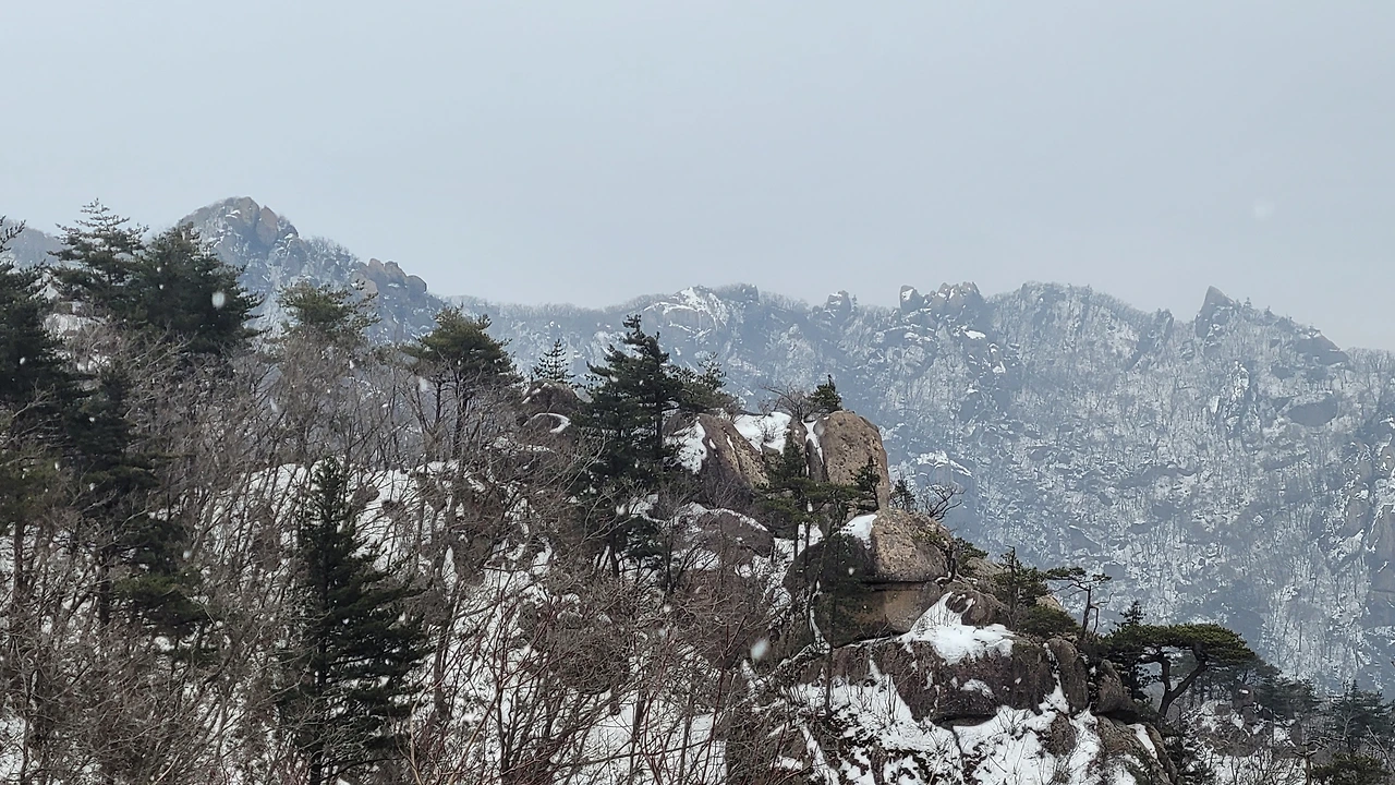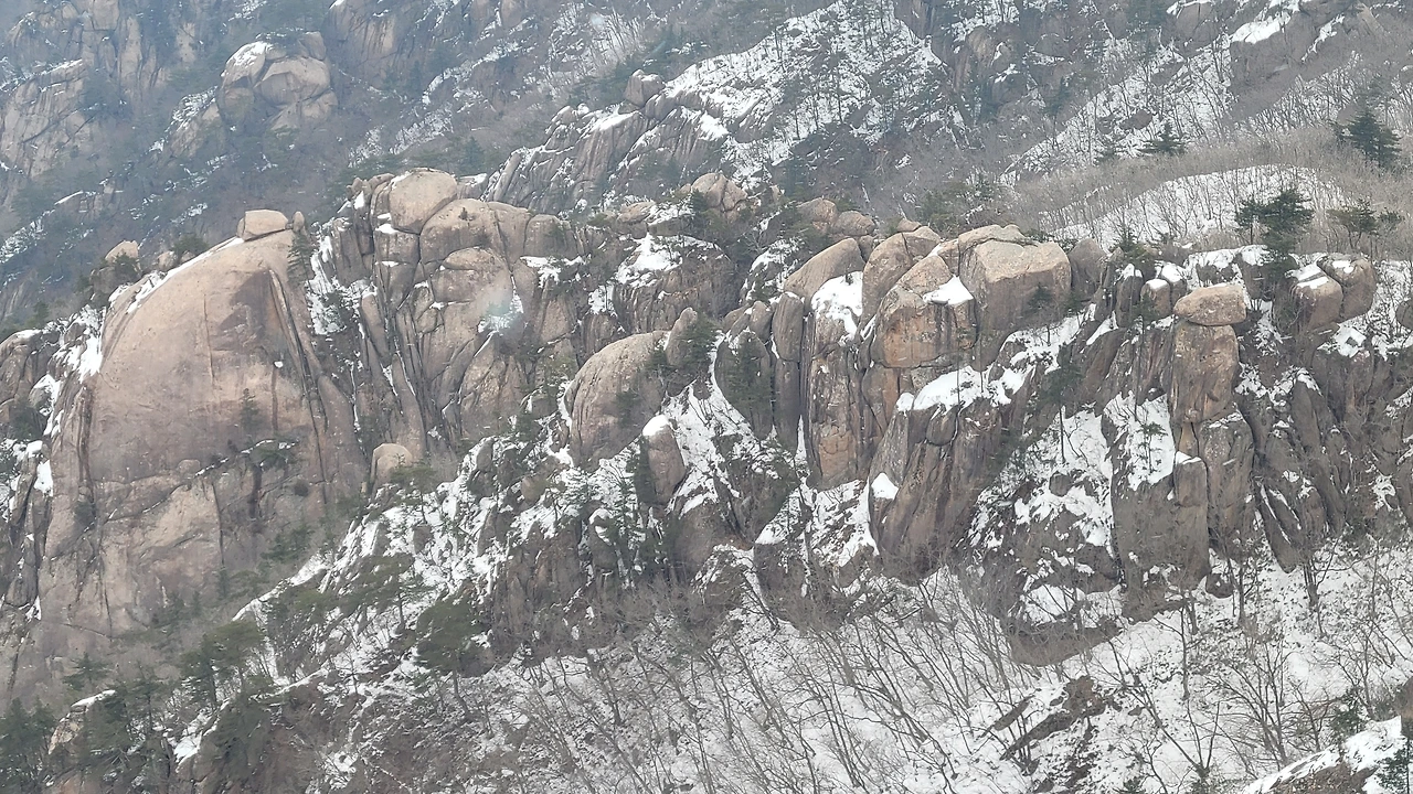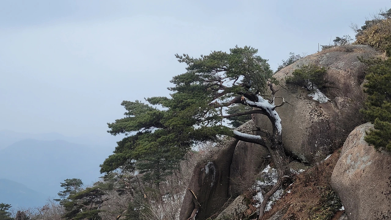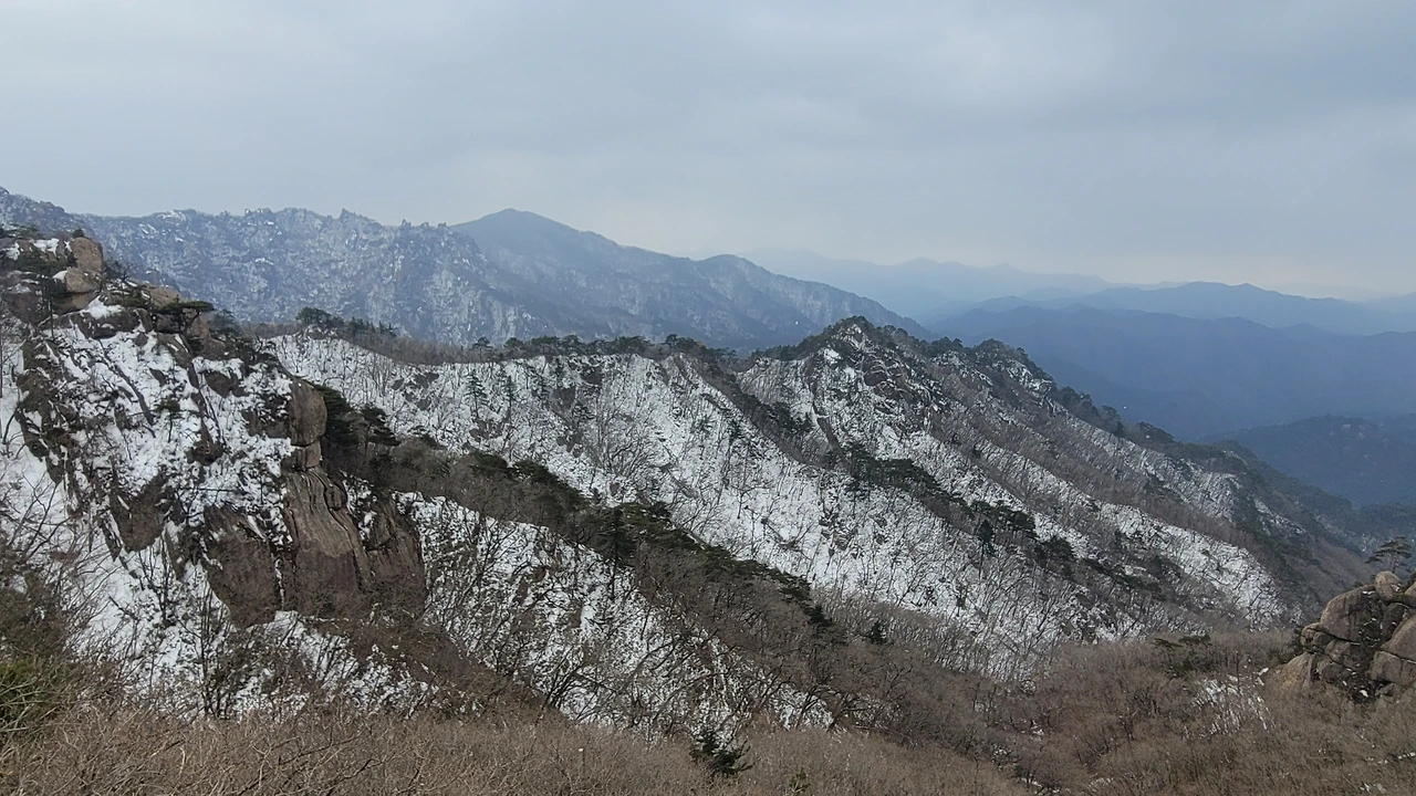 한참을 산을 오른다. 올라가는 길목마다 넘어진 나무들이 보인다. 큰 나무들이 뿌리째 뽑히고 처참하게 가지가 부러졌다. 자연이 지닌 거친 힘을 느낀다. 산마루에 다다르니 북쪽을 향한 산기슭에는 눈이 여전히 남아있다. 남사면과는 확연히 다른 풍경이다. 걸어가는 길목에도 눈이 있다. 정상에 가까이 오른 것이다. 꽤 쌓인 눈이라 내려올 때는 아이젠이 필요할 듯하다. 앞만 보고 마냥 걷다가 뒤돌아 보면 미처 보지 못했던 멋진 풍광이 자리하고 있다. 밑에서는 볼 수 없는 풍경이다. 우리가 힘들여 산을 오르는 이유다.