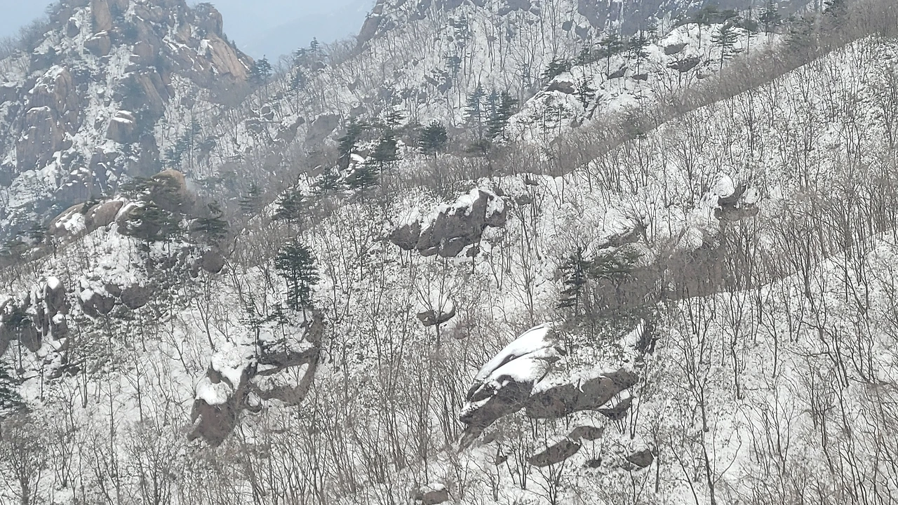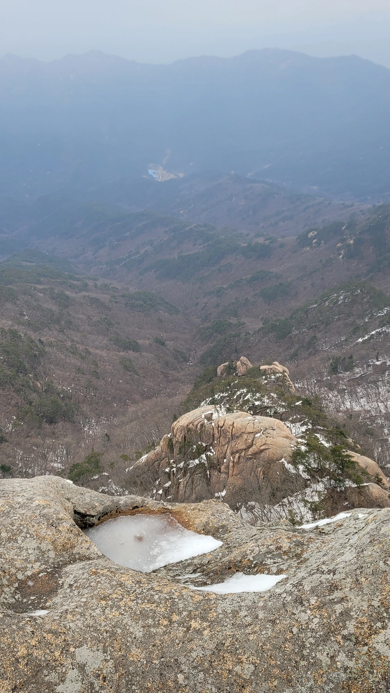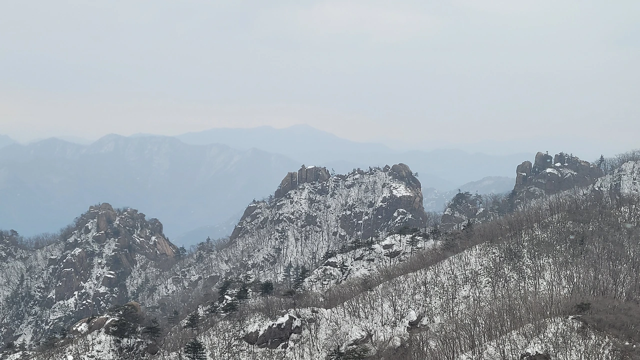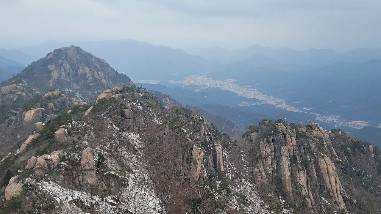 한참을 산을 오른다. 올라가는 길목마다 넘어진 나무들이 보인다. 큰 나무들이 뿌리째 뽑히고 처참하게 가지가 부러졌다. 자연이 지닌 거친 힘을 느낀다. 산마루에 다다르니 북쪽을 향한 산기슭에는 눈이 여전히 남아있다. 남사면과는 확연히 다른 풍경이다. 걸어가는 길목에도 눈이 있다. 정상에 가까이 오른 것이다. 꽤 쌓인 눈이라 내려올 때는 아이젠이 필요할 듯하다. 앞만 보고 마냥 걷다가 뒤돌아 보면 미처 보지 못했던 멋진 풍광이 자리하고 있다. 밑에서는 볼 수 없는 풍경이다. 우리가 힘들여 산을 오르는 이유다.