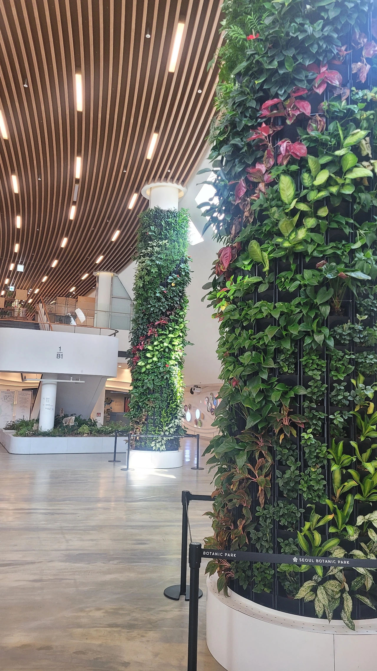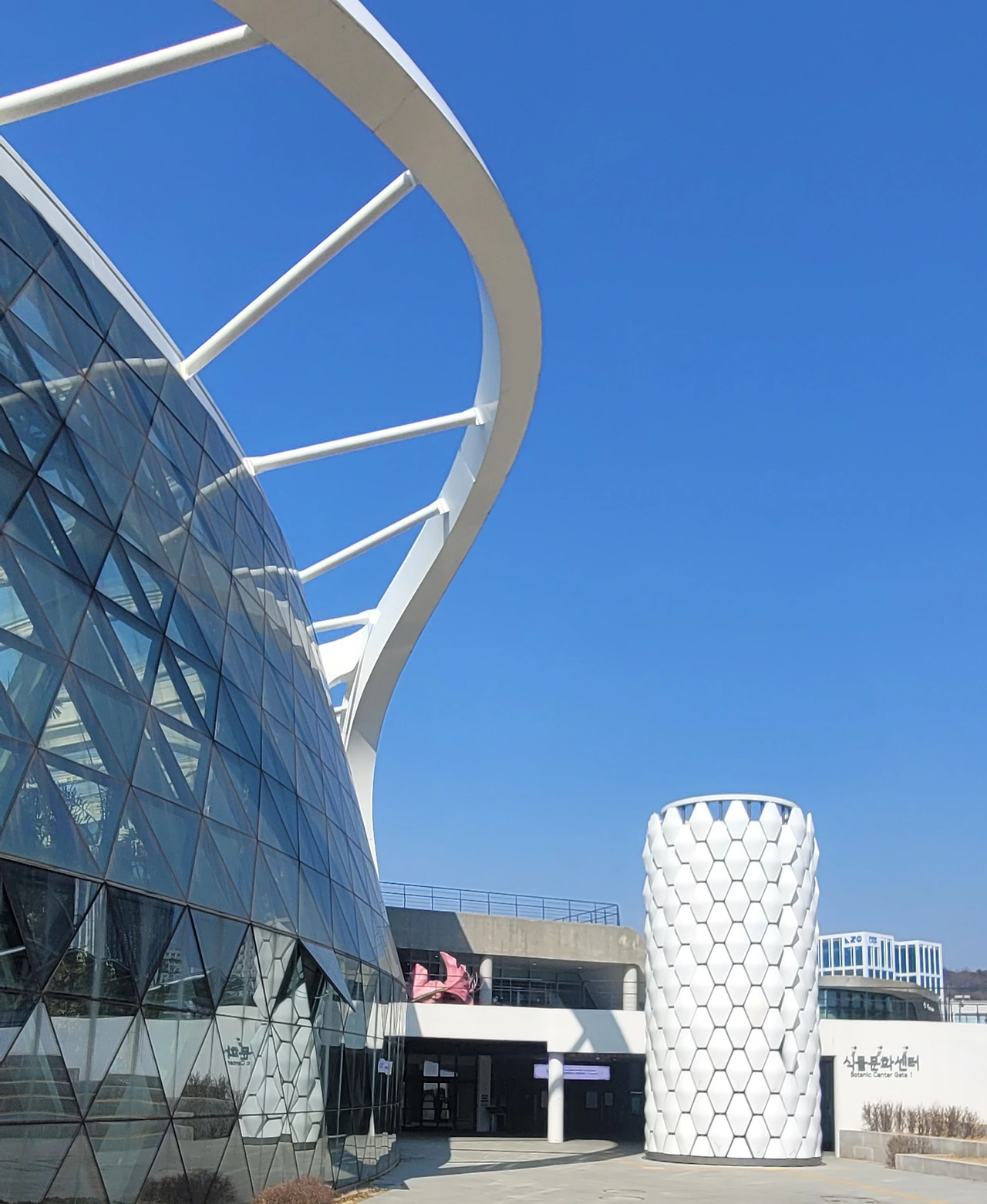 식물문화센터(온실)는 흰색 구조물이 두르고 전면이 통유리로 된 원형의 건물로 모던하고 세련된 모습을지녔다. 실내에 들어서면 사철 푸른 식물들이 식재된 기다란 기둥이 관람객을 맞는다. 입구에 들어서자마자 온실의 열기가 훅 끼친다. 한겨울 복장으로는 거의 극기훈련 수준이라 곧바로 두꺼운 옷을 벗어야 했다.