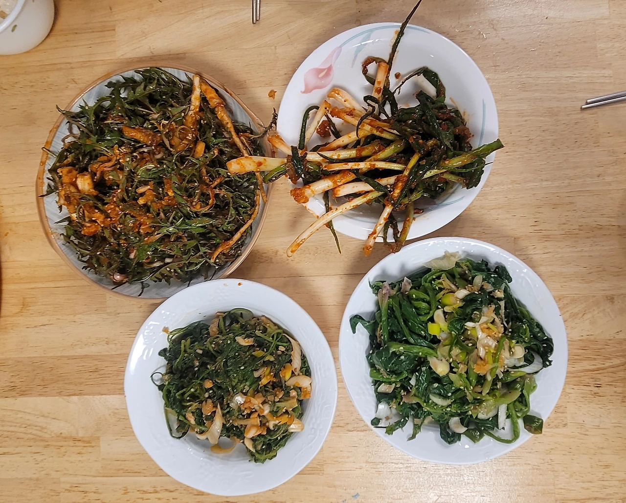 반갑게 처형부부를 뵙고 저녁은 나물로 식탁을 차렸다. 쑥과 엉겅퀴와 냉이를 넣고 된장국을 끓였고 민들레는 고추장으로 새콤달콤하게 생으로 무쳤다. 개망초와 머위는 삶아 된장으로 맛을 내고 쑥부쟁이는 간장으로 버무렸다.