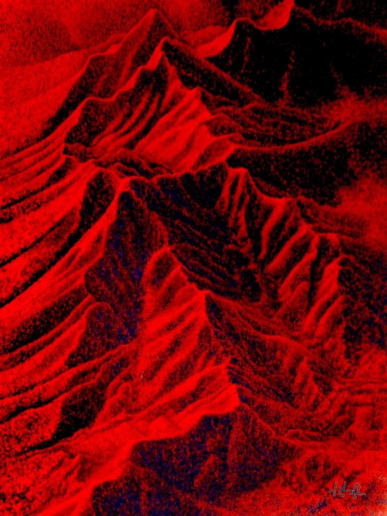 복수초가 화폭 가득히 담긴 작품은 물감으로 그려져 전혀 다른 분위기를 풍긴다. 한 세상을 건넌 피안의 세계일까? 북한산 추경을 그린 붉은 톤의 그림도 아주 강렬하다. 온통 붉은빛으로 물들어 완전히 딴 세상을 보여 주지만 굽이치는 낯익은 산자락은 아주 분명하게 이 땅의 산이라고 깨우친다. 태백산을 그린 작품도 압권이다. 눈 쌓인 산자락이 능선을 따라 굽이치고 명암으로 갈린 산의 단면은 추상의 세계로 인도한다. 자연이 지닌 숭고함이 넘쳐나 옷깃을 여미게 한다.