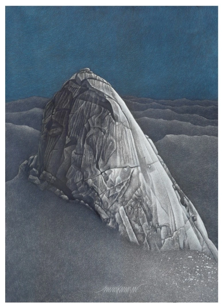 가장 인상적인 그림은 인수봉을 그린 작품이다. 대작으로 바위의 질감을 그대로 살려내면서도 비구상의 느낌이 살아있다. 이 작품에도 작가의 고요한 분위기는 여전하다. 푸른 하늘 아래 아름드리 우뚝 솟은 거대한 봉우리, 산자락은 파도처럼 발아래 물결치고 빛의 반영을 도드라지게 살려 영험한 기운까지 풍긴다. 어쩌면 수양하는 구도자의 우직하고 단단한 모습이다.