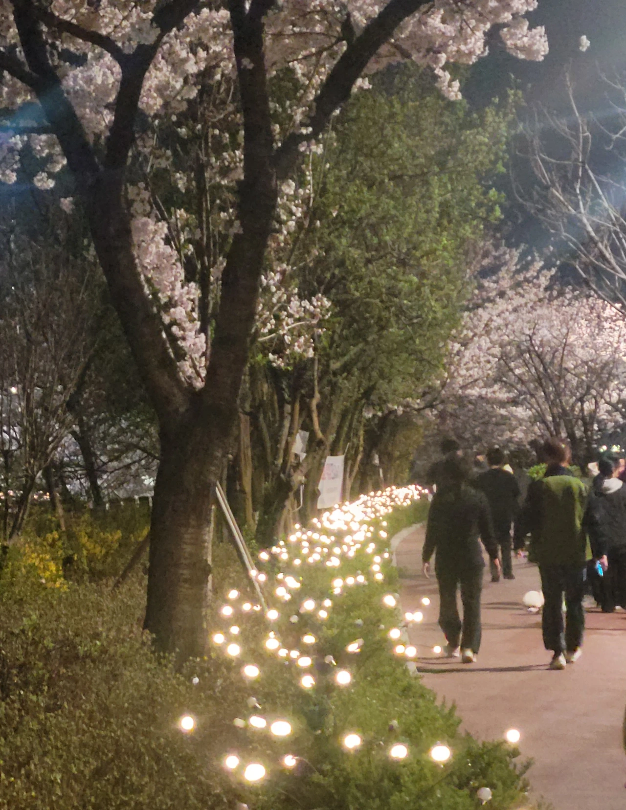 꽃구경하는 사람들이 다채롭다. 사랑이 퐁퐁 솟는 연인들, 천진난만하게 웃음 짓는 부모와 함께 온 아이들과 다정한 부부 그리고 마냥 깔깔대는 풋풋한 청춘도 있다. 강아지들도 신이 났다. 비숑, 푸들, 닥스훈트들이 주인을 따라 앞서거니 뒤서거니 밤길을 소풍 하며 걷는다.