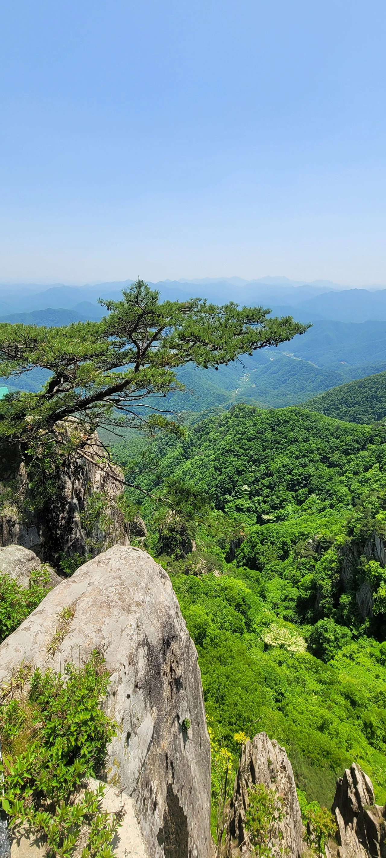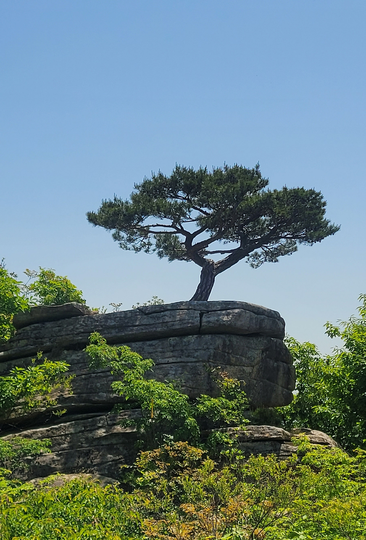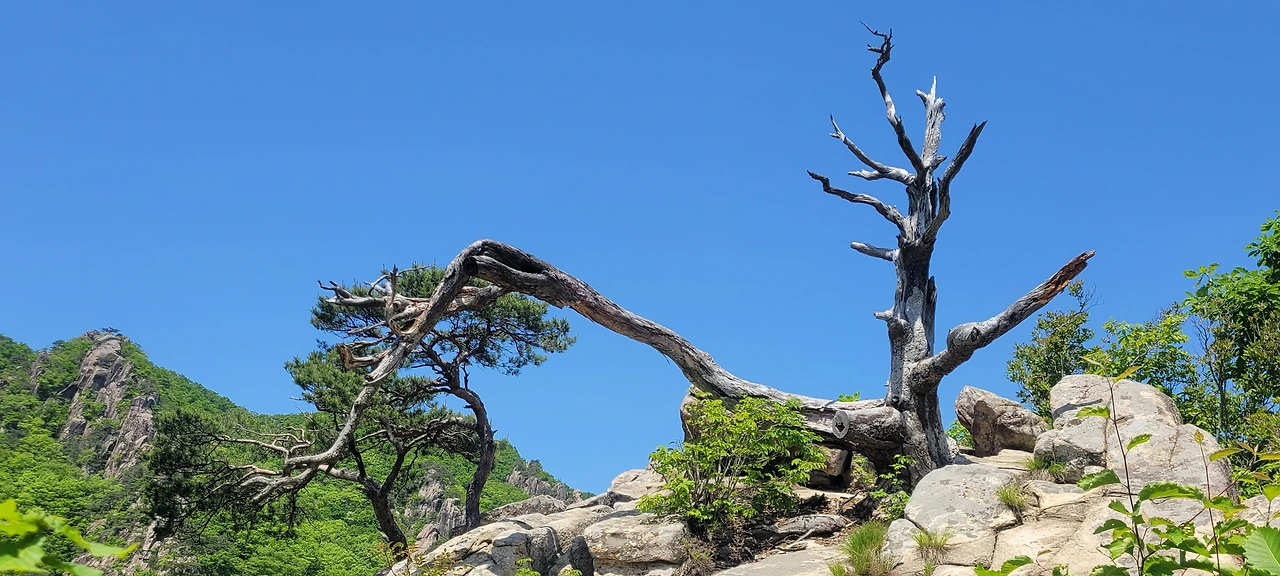 그냥 지나칠뻔한 절경을 만났다. 동행이 일러줘서 오던 길을 돌아 찾아간 곳은 생애대라는 기암 봉우리다. 고사목과 소나무와 기암괴석이 어울려 멋들어진 경치다. 주위의 원경도 조망하기 좋은 곳이다. 암벽 위에 홀로 선 소나무는 왜 그렇게 마음을 끄는 걸까? 이곳에서도 그 소나무를 만나 마음을 뺏긴다.