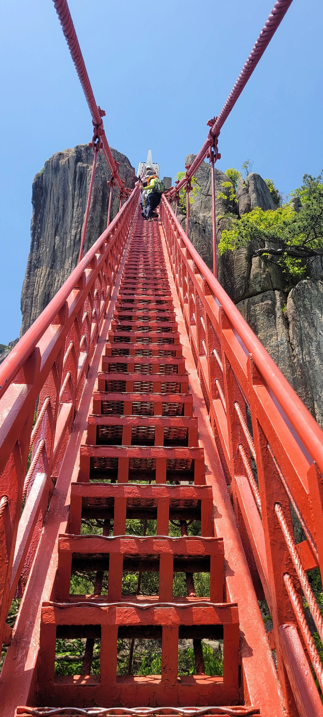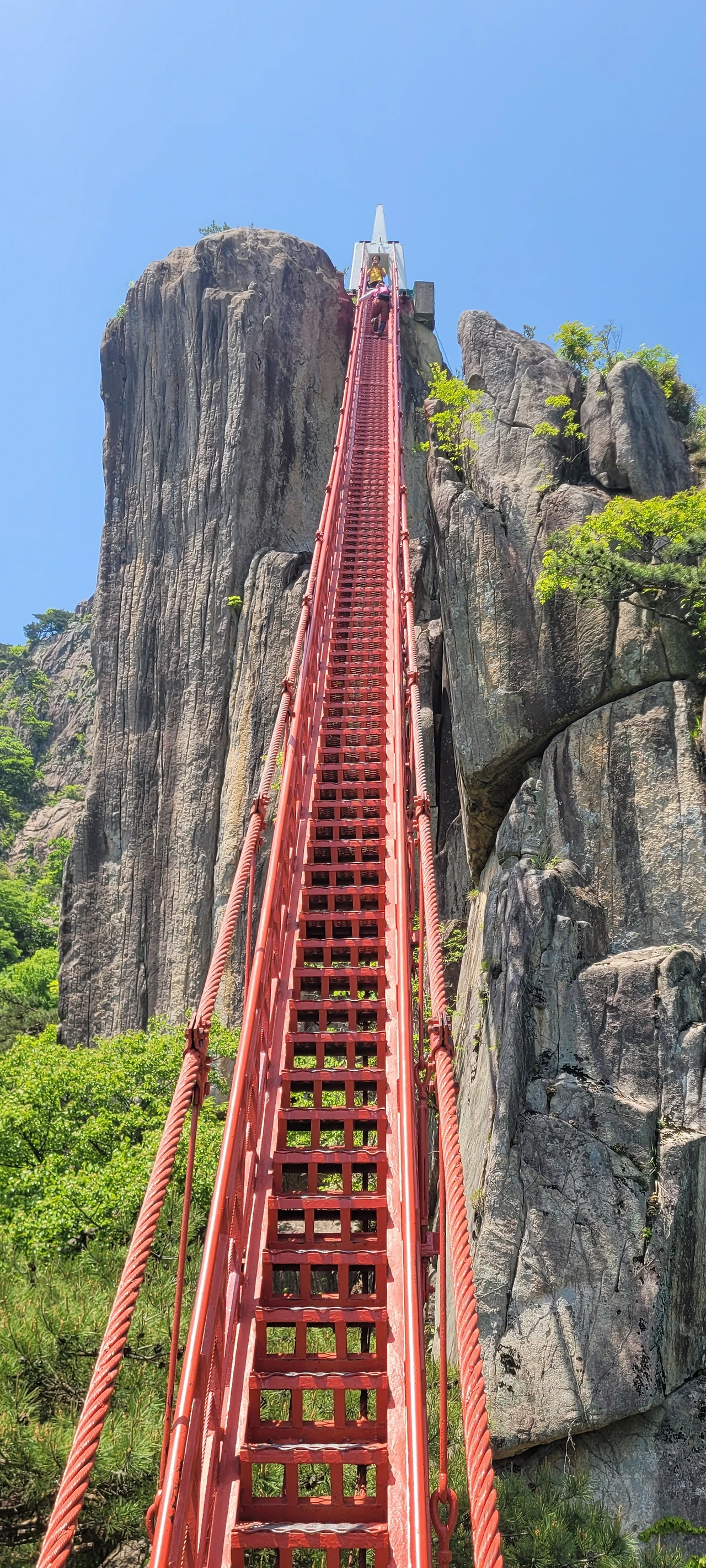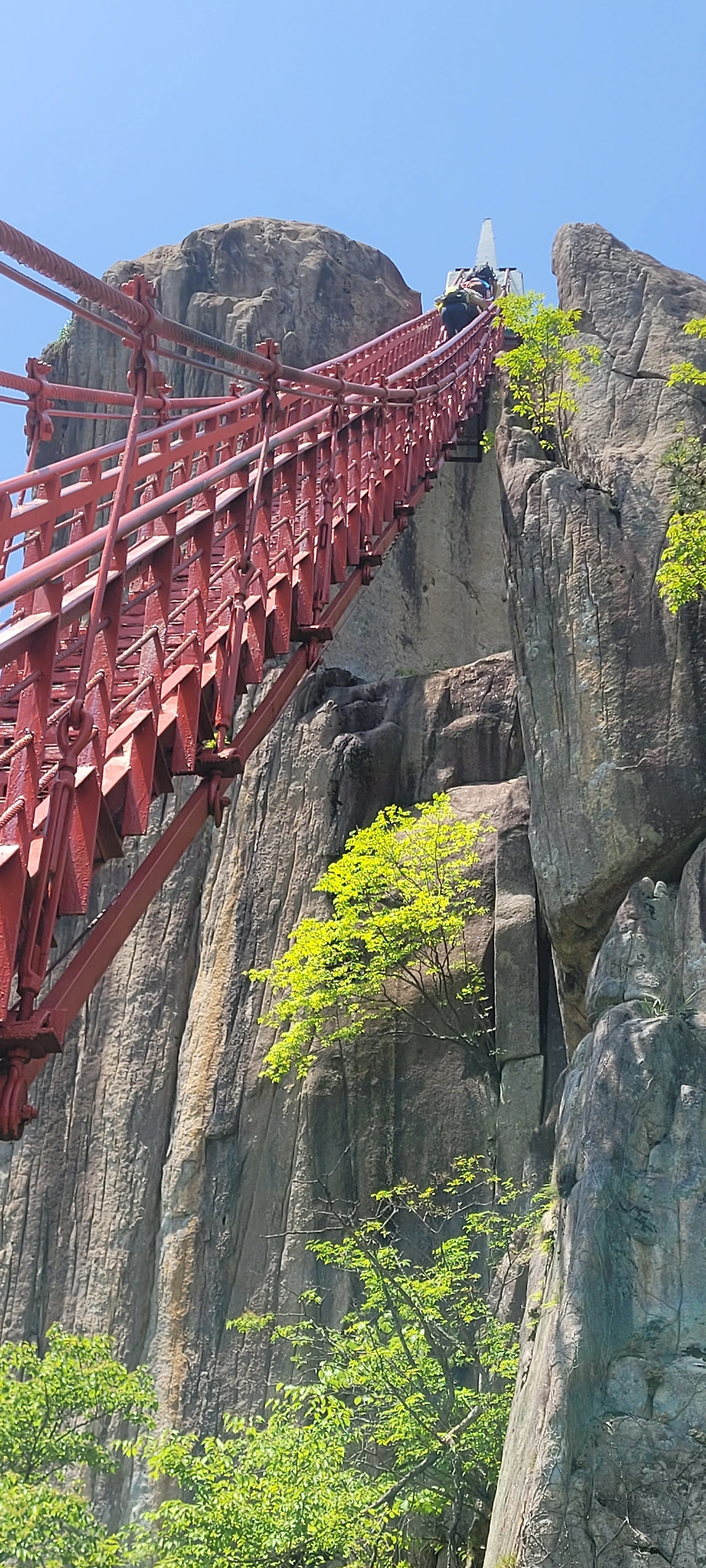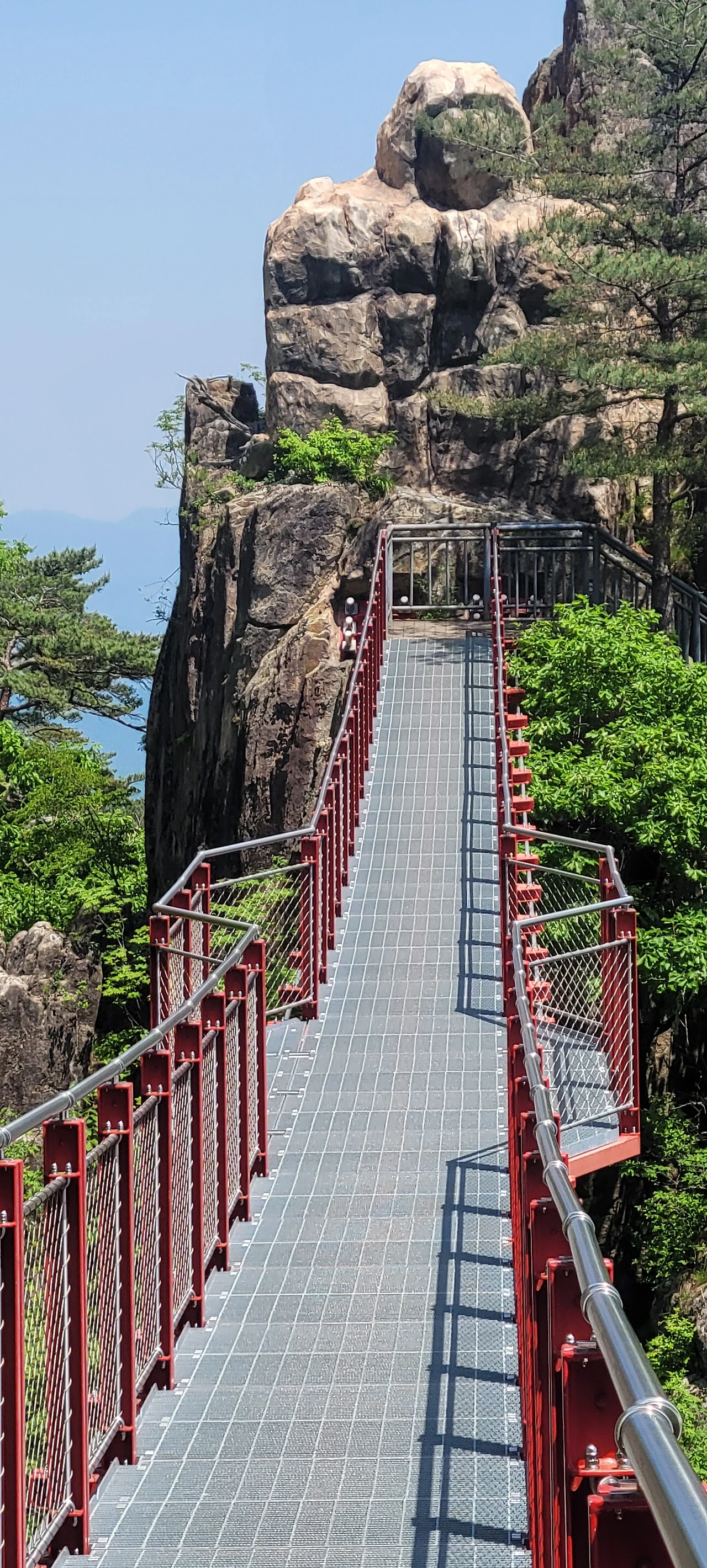 이 출렁다리는 임금바위와 입석대 사이를 가로질러 놓은 것으로 높이 81m, 길이 50m다. 붉은빛의 다리가 주변 풍광과 잘 어울린다. 용기를 내어 건너는데 흔들리기까지 해서 두려움은 커진다. 아래를 내다보니 눈이 절로 감기는 까마득한 허공이다.