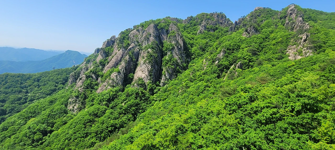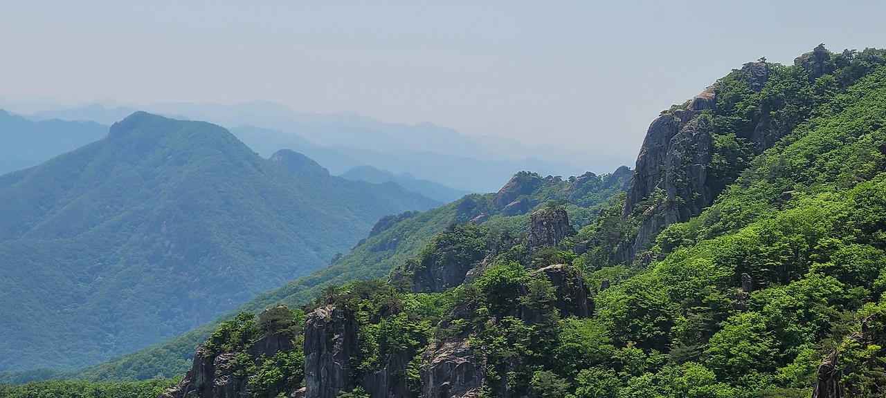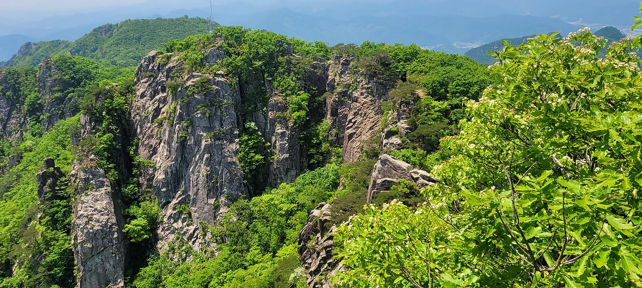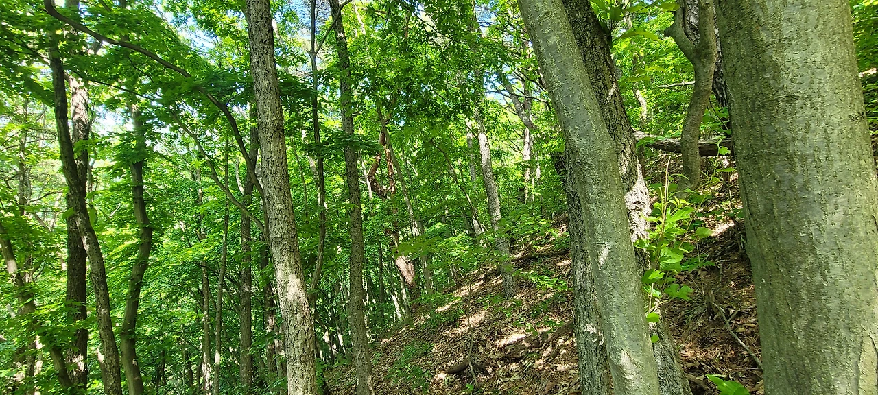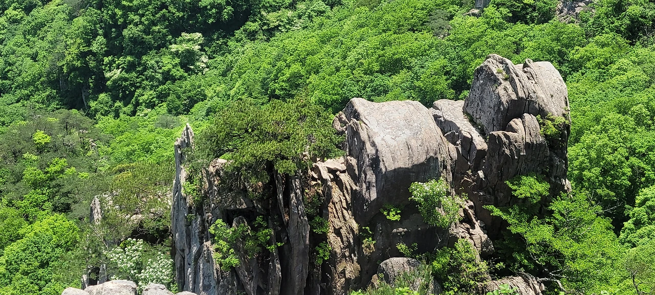 오월의 신록이 짙은 등산로에 들어섰다. 초입부터 오르막이다. 숲이 우거져 터널을 이룬 길은 경사가 급하다. 서어나무와 굴참나무가 섞여 빽빽한 숲은 온통 녹색의 바다다. 풍경을 즐기며 가고 싶지만 오를수록 경사가 심해서 신경을 곤두 세우며 발걸음에 집중해야 한다. 다행히 평소 하체 근력을 다진 덕인지 힘이 들지 않아 발걸음이 가볍다. 숲이 우거진 그늘이라 야생화는 눈에 띄지 않는다. 밀림 같은 숲을 고행하듯 묵묵히 오른다. 길은 온통 바윗길에 급경사로 산행이 만만치 않다.