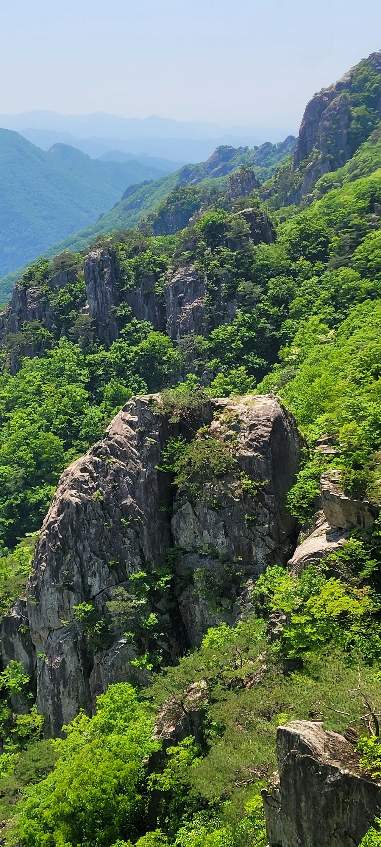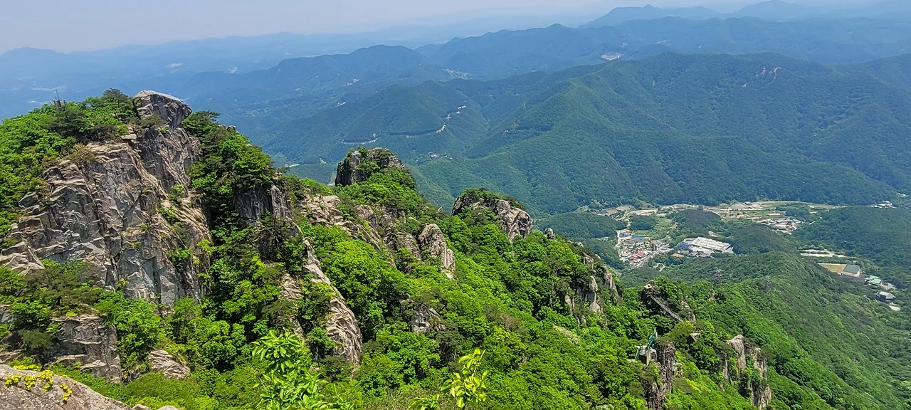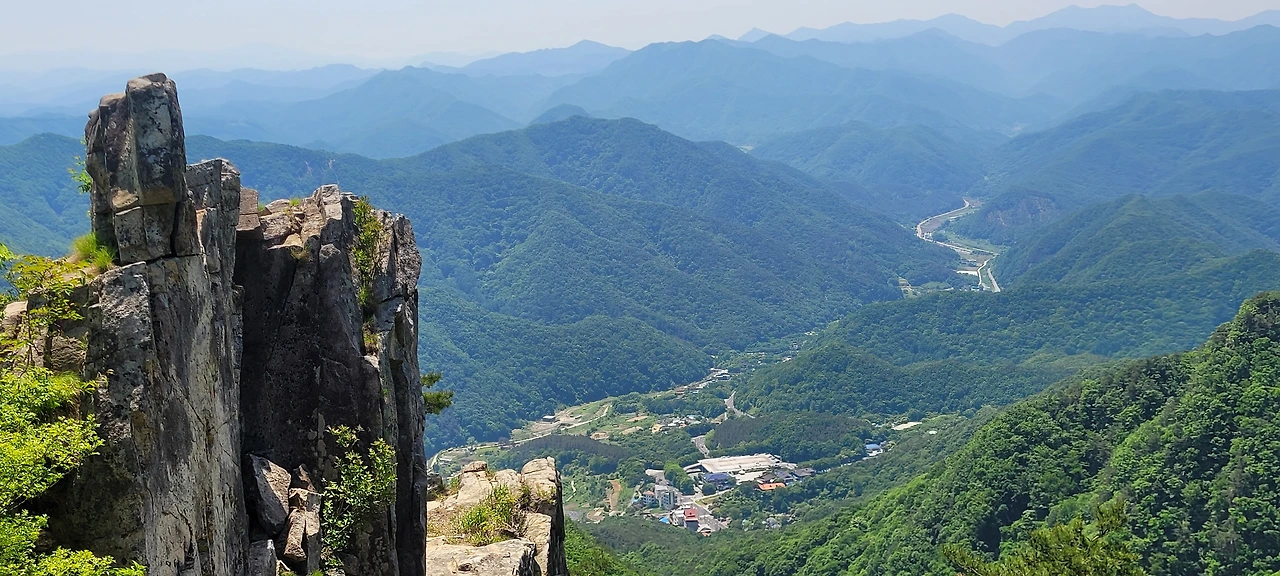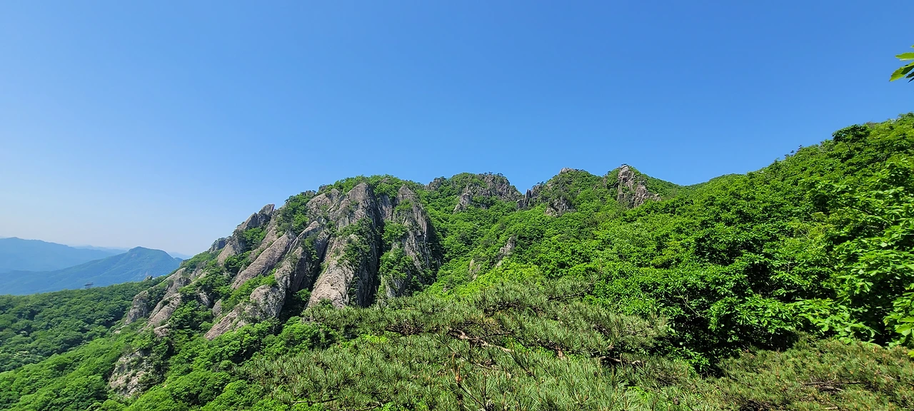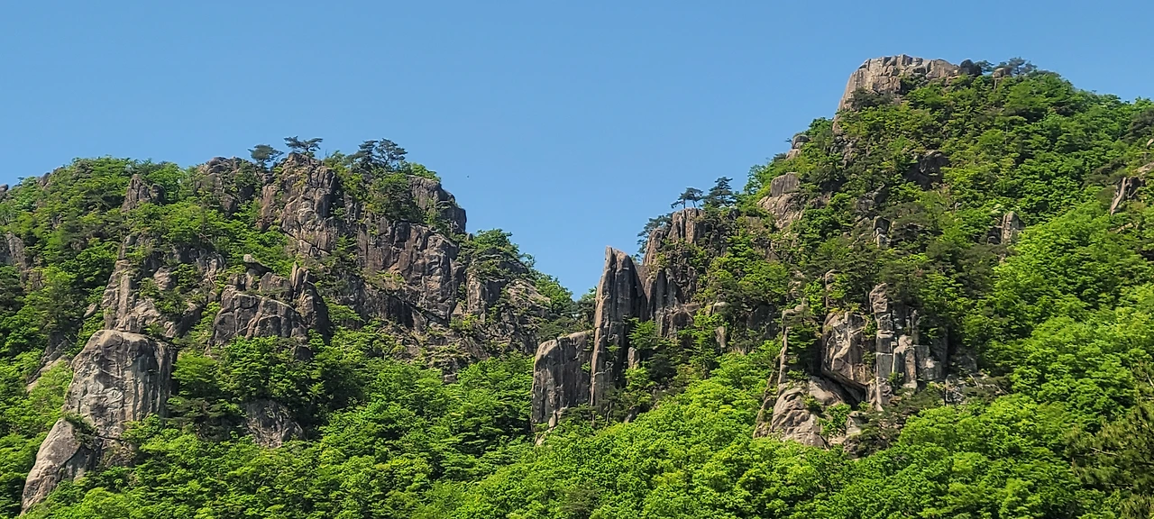오월의 신록이 짙은 등산로에 들어섰다. 초입부터 오르막이다. 숲이 우거져 터널을 이룬 길은 경사가 급하다. 서어나무와 굴참나무가 섞여 빽빽한 숲은 온통 녹색의 바다다. 풍경을 즐기며 가고 싶지만 오를수록 경사가 심해서 신경을 곤두 세우며 발걸음에 집중해야 한다. 다행히 평소 하체 근력을 다진 덕인지 힘이 들지 않아 발걸음이 가볍다. 숲이 우거진 그늘이라 야생화는 눈에 띄지 않는다. 밀림 같은 숲을 고행하듯 묵묵히 오른다. 길은 온통 바윗길에 급경사로 산행이 만만치 않다.