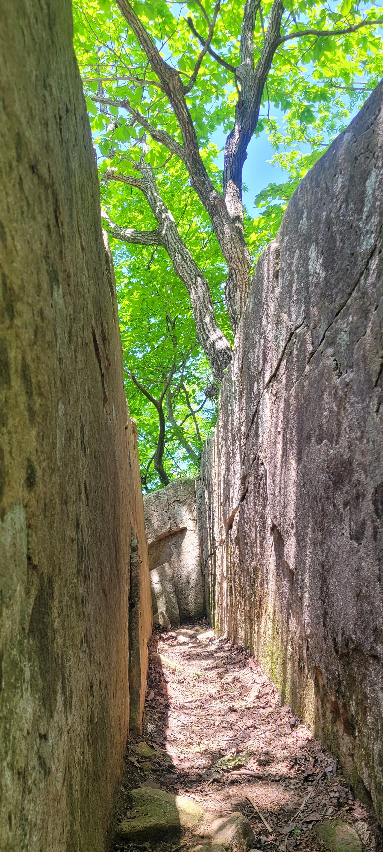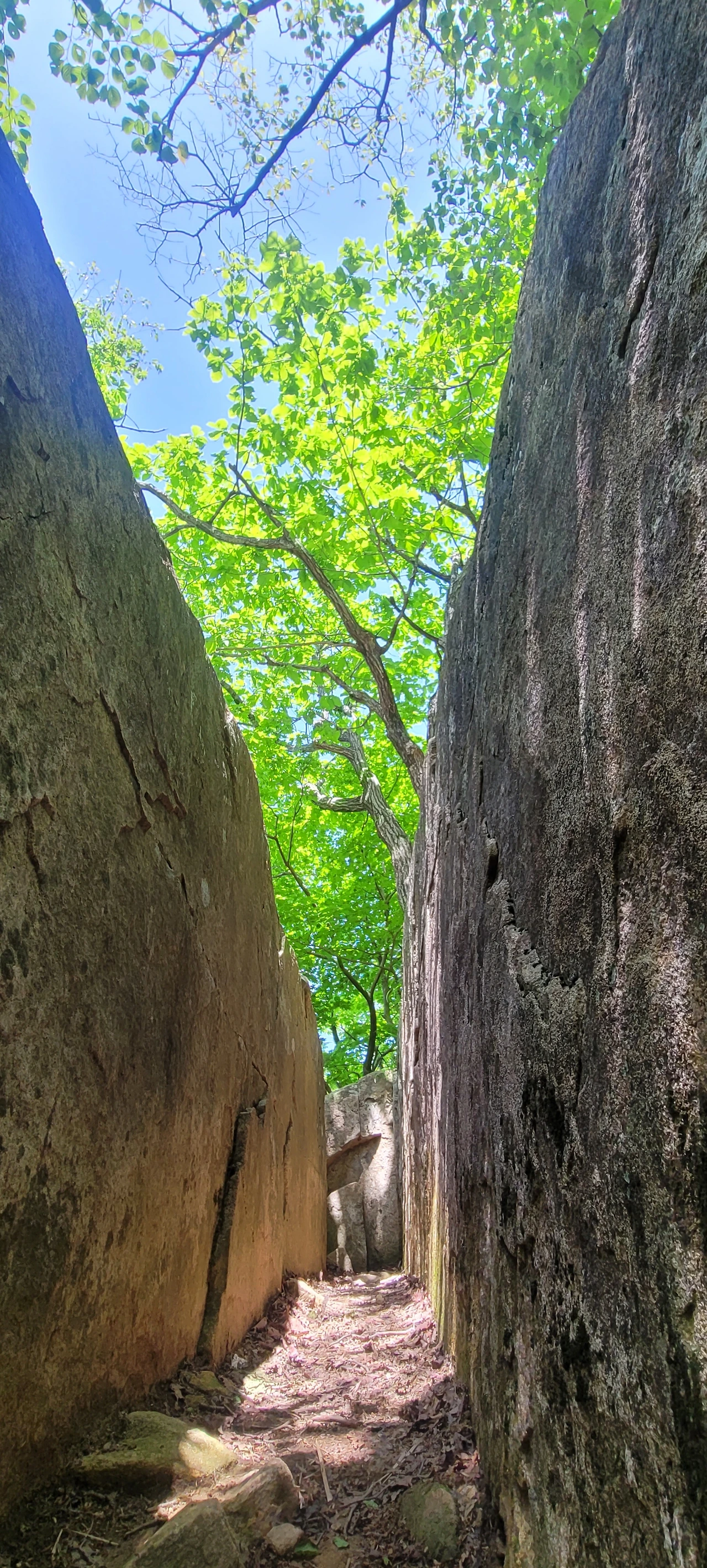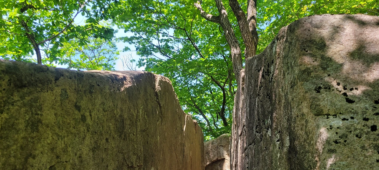 마천대 가는 길에 큰 바위가 쪼개져 틈이 벌어진 곳이 있다. 그곳에서 사진을 찍으면 재미있는 사진이 찍힌다.