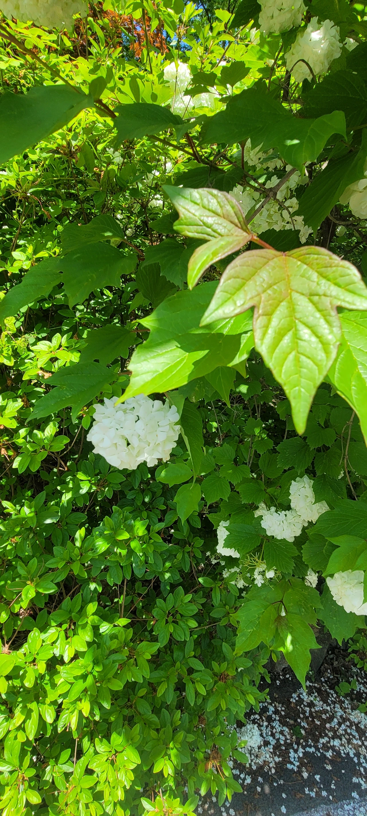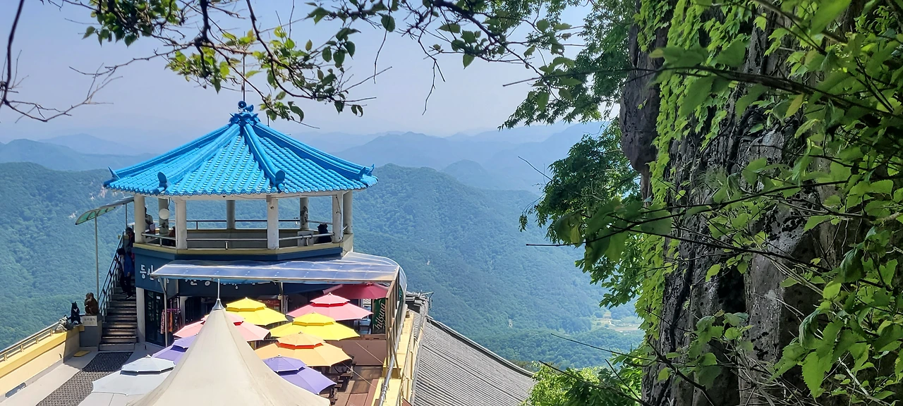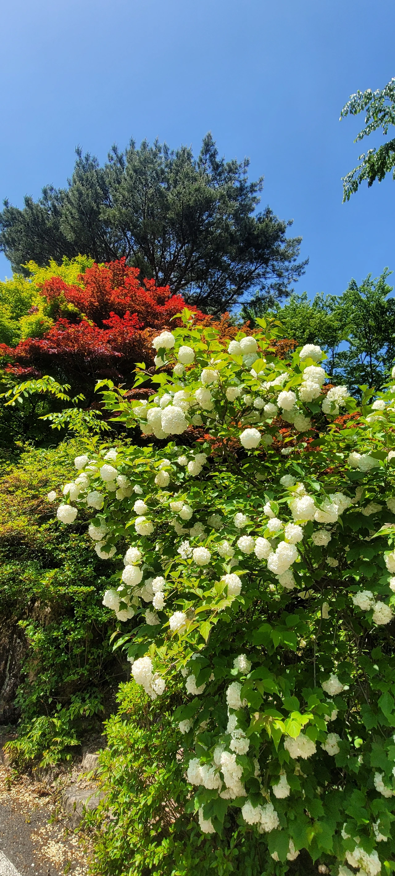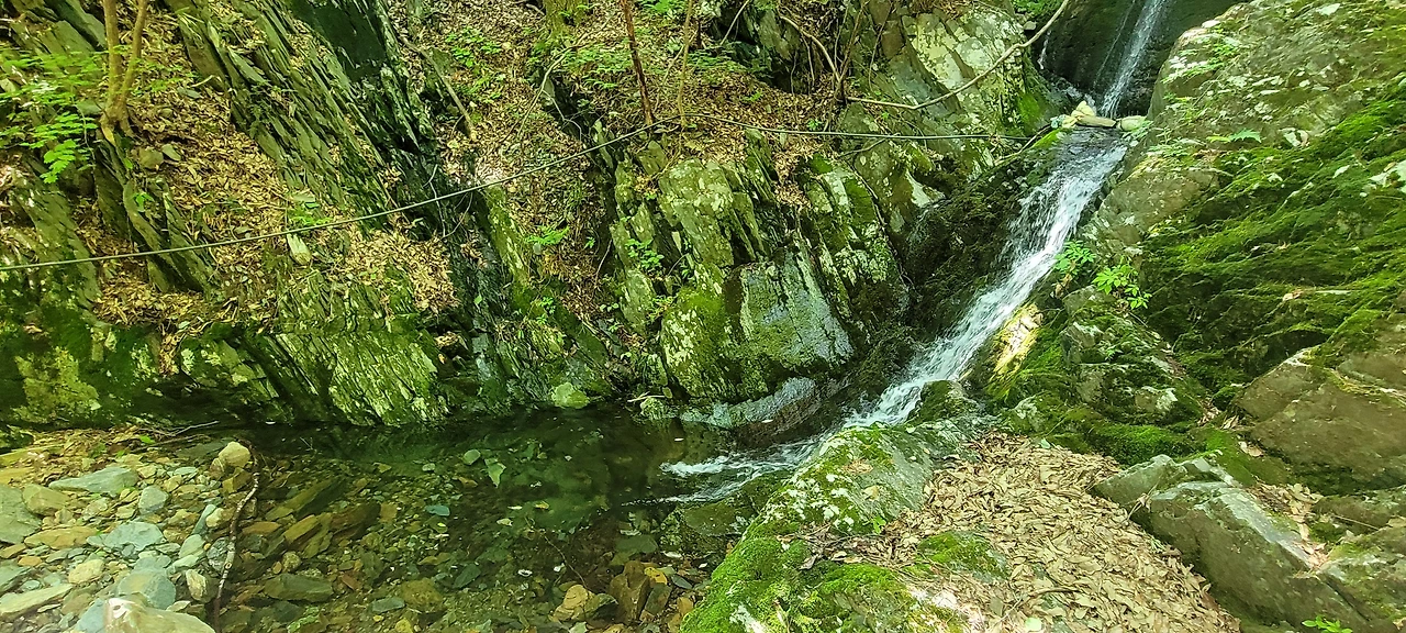 하산길은 돌과 전쟁이다. 오르는 길도 급경사였는데 내려가는 길도 만만치 않다. 중간에 있는 케이블카 건물의 색상이 아름답다. 하산 길에는 계류가 흐른다. 그래서인지 공기가 쾌적하다. 물소리와 새소리로 귀가 즐겁다. 흐르는 계곡물에 손을 담그니 완전 얼음물이다. 잠깐인데도 손목이 끊어질 듯 차갑다. 작은 폭포도 있어 더 시원한길이다.마지막으로 만나는 꽃은 쪽동백이다. 디른 곳에는 이미 졌지만 높은 곳이라 이제 피어나 등불 밝힌듯 곱게 피었다.산을 내려오니 불두화가 우리를 반긴다.