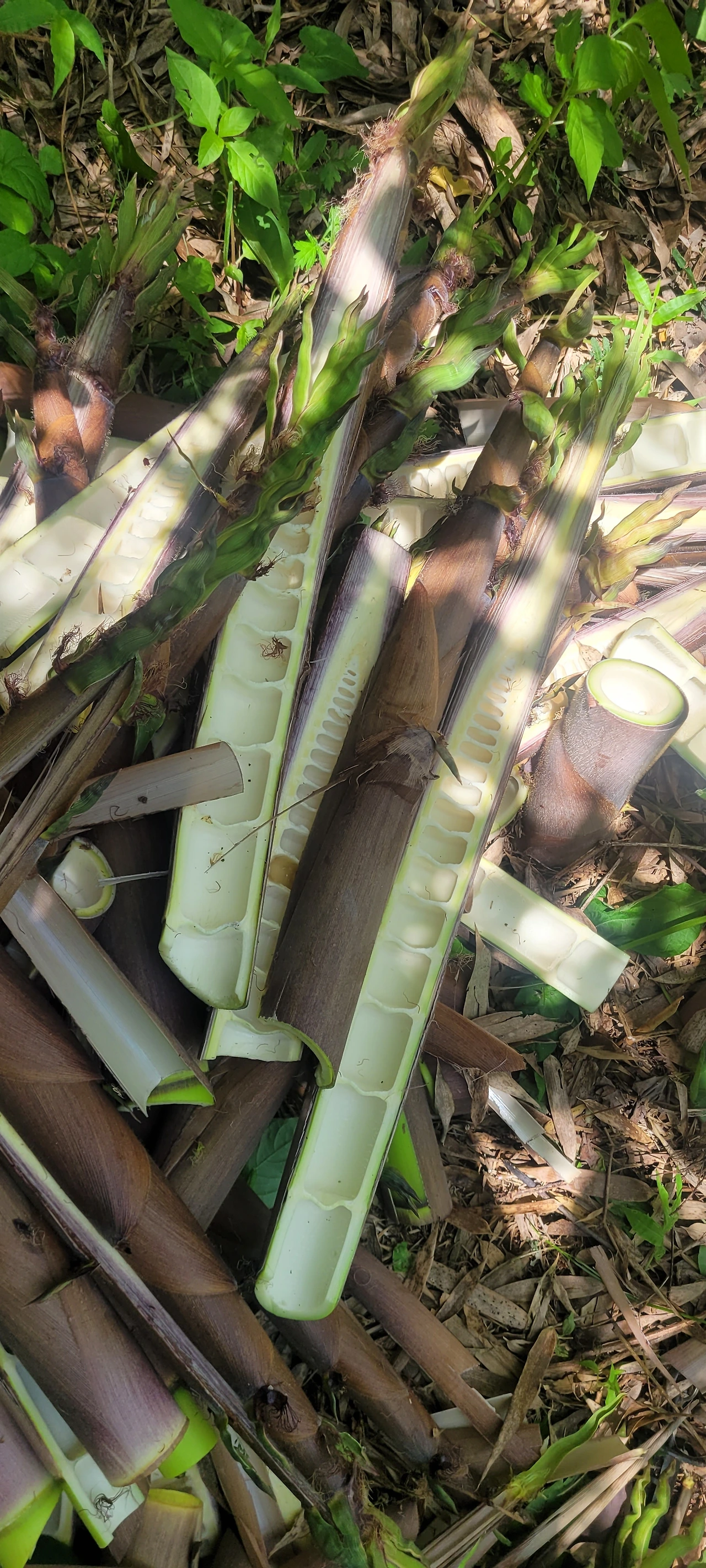 채취한 죽순은 시간이 지나면 뻣뻣해지기 때문에 바로 삶아야 한다. 양이 많아서 실내에서 삶기는 어렵다. 밖에 걸어놓은 큰 솥에 불을 때서 삶는다. 솥에 물을 조금 붓고 죽순을 차곡차곡 쌓고는 불을 땐다. 수증기로 죽순을 익히는 것이다. 땔감은 마른 매실나무 가지다. 형님이 매실농사를 짓기에 전지한 가지를 모아 놓은 것이다. 금방 불이 붙었고 화력도 좋았다. 한참 불을 때니 김이 모락모락 나면서 맛있는 냄새가 풍긴다. 마치 옥수수를 삶는 것 같다. 푹 삶아서 익은 죽순을 건져 찬물에 헹군다. 물에 헹구는 동안 질긴 부분은 잘라서 버린다. 너무 자란 죽순은 나무 같아서 먹을 수 없고 너무 어린 죽순은 내용물도 작고 연해서 식감도 별로다. 죽순에도 적당한 중용이 필요하다.