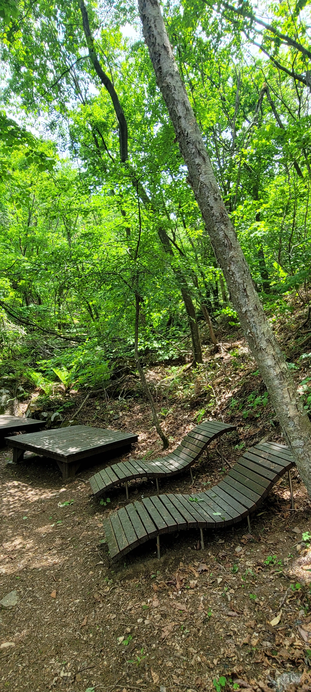 해가 나서 숲이 찬란하다. 이곳에 많이 자라는 사스레 나무 길이 아주 아름답다. 흰 수피가 푸른 잎들로 도드라져 보인다. 관중이 무리 지어 자라난 곳은 금방이라도 공룡이 튀어나올 것 같은 풍경이다. 곳곳에 나무 벤치와 장의자가 배치되어 산림욕을 즐길 수 있다. 여유롭다면 장의자에 누워 늘어지게 한잠을 청하고 싶은 마음이다.