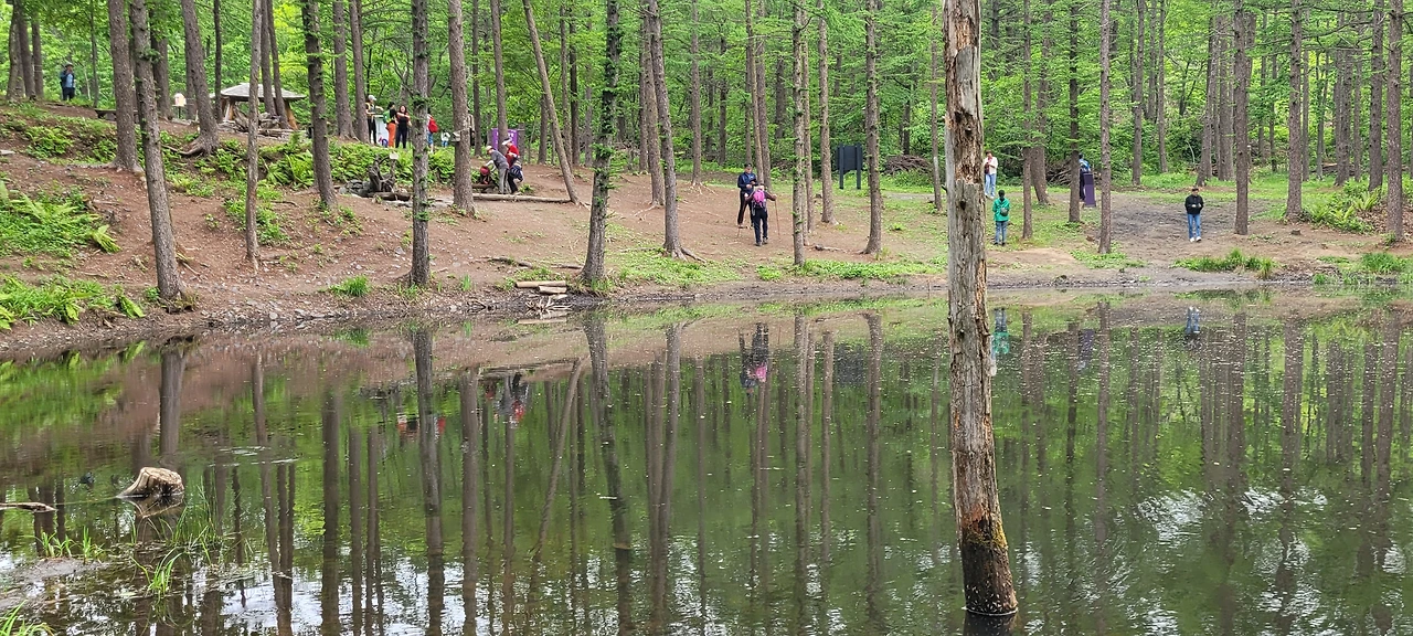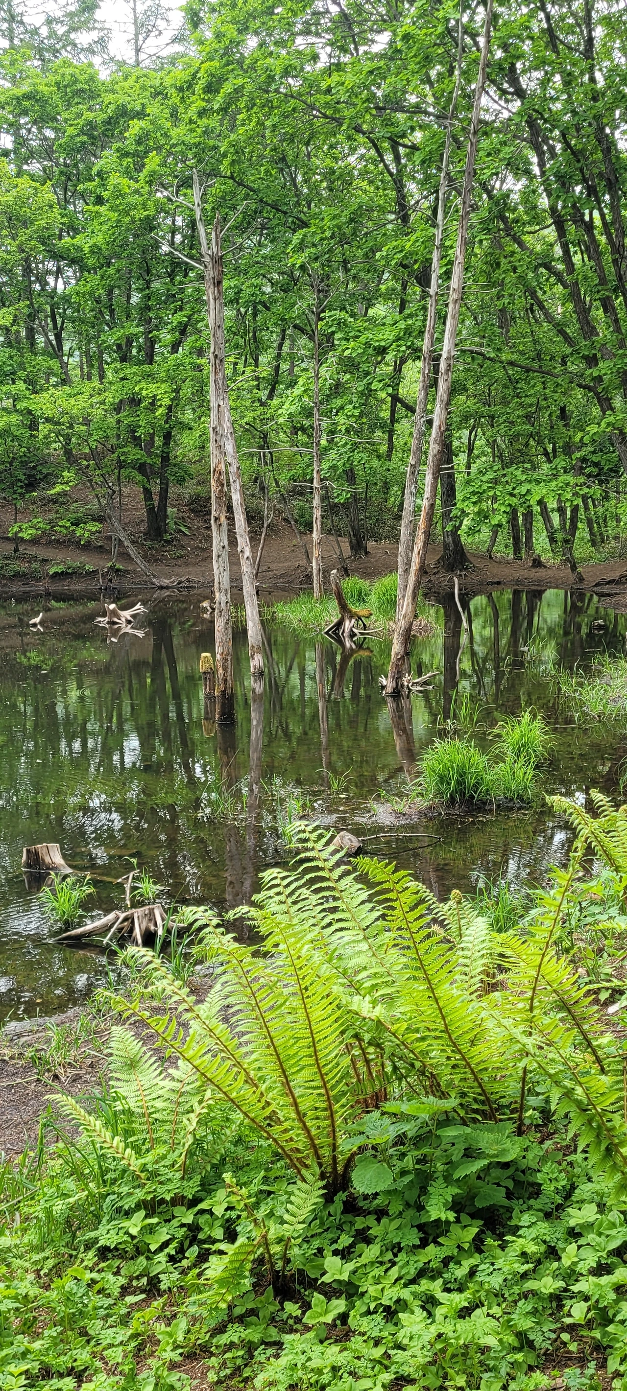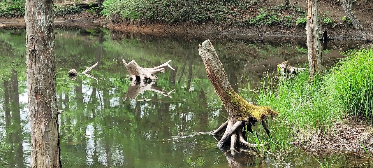 산 중턱에 작은 호수가 있다. 물에 비친 나무의 반영이 아름답다. 추상 조각 같은 고사목의 뿌리가 수면 위로 드러나 있다. 산짐승들의 갈한 목을 축이는 고마운 곳일 것이다. 예전에 이곳은 광부들의 안녕을 비는 아낙들의 기원이 담긴 곳이라고 후일담을 들었다.