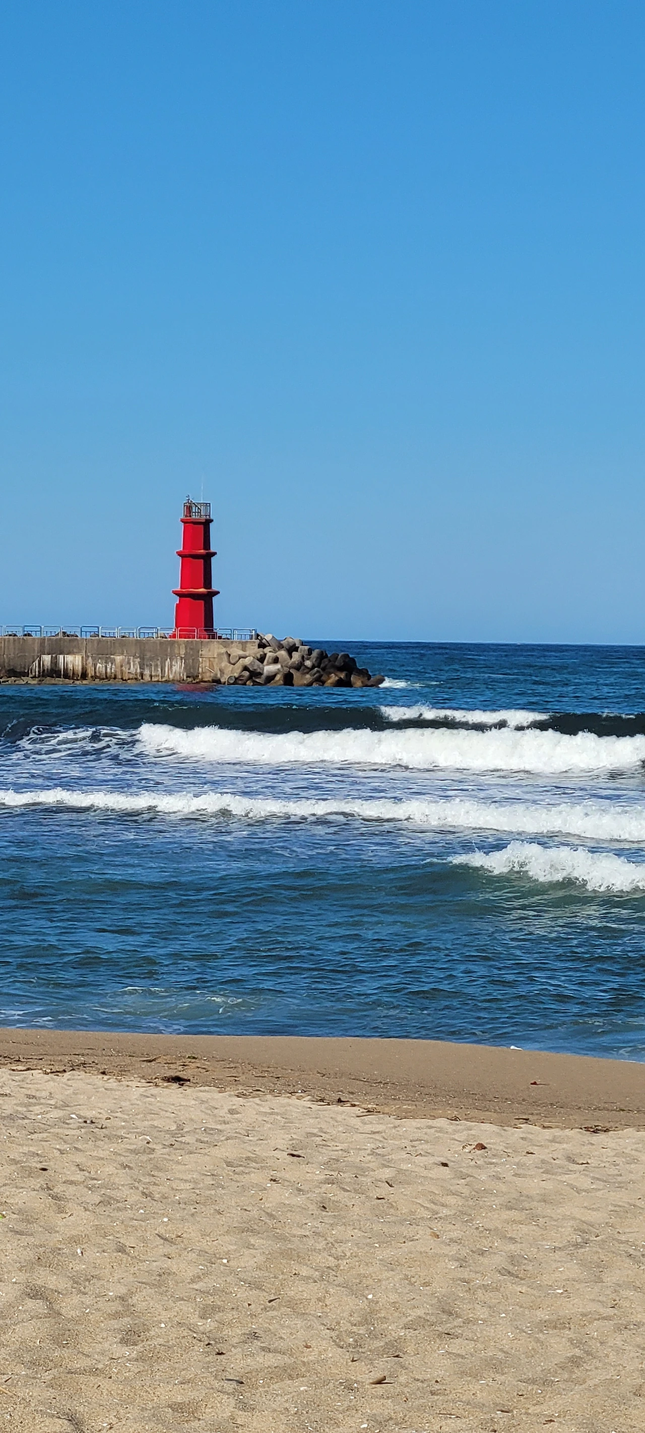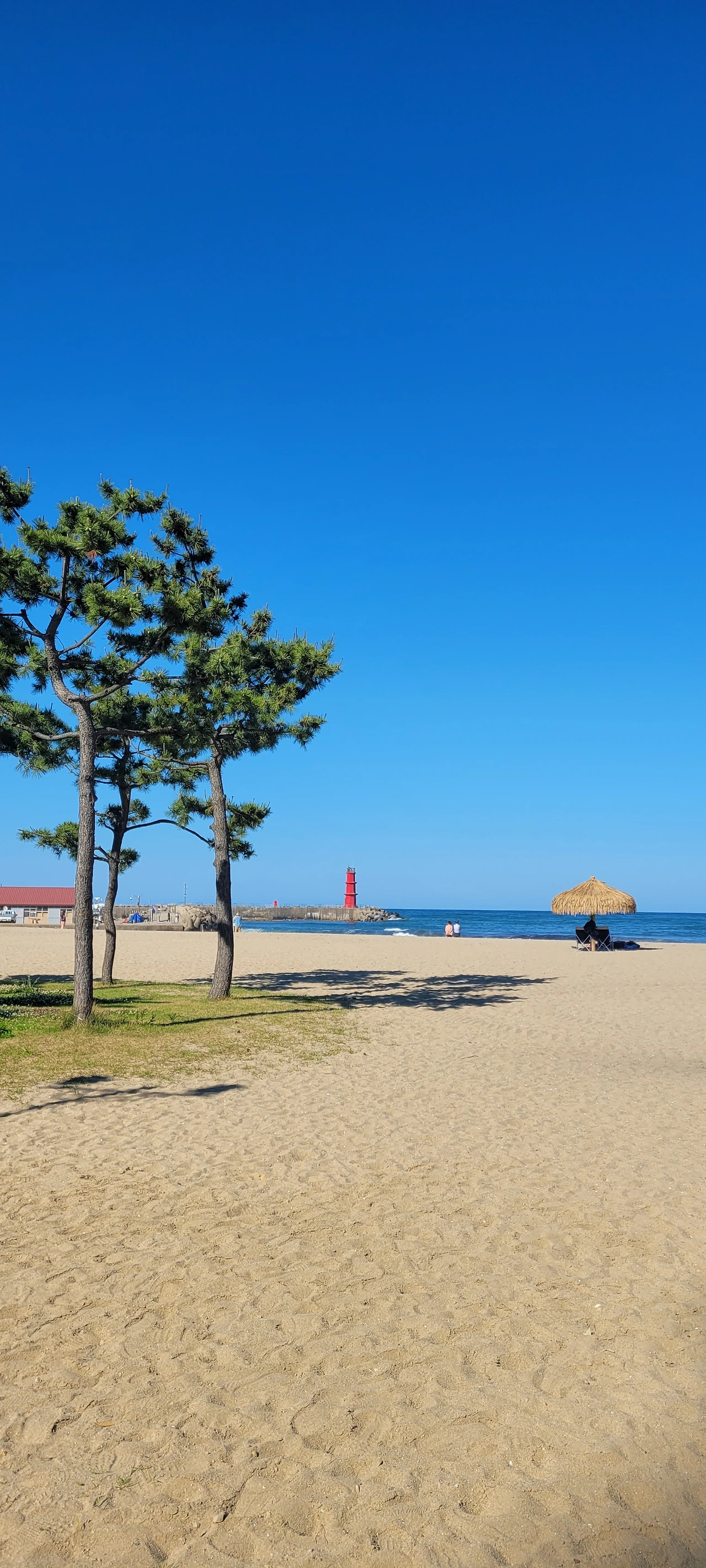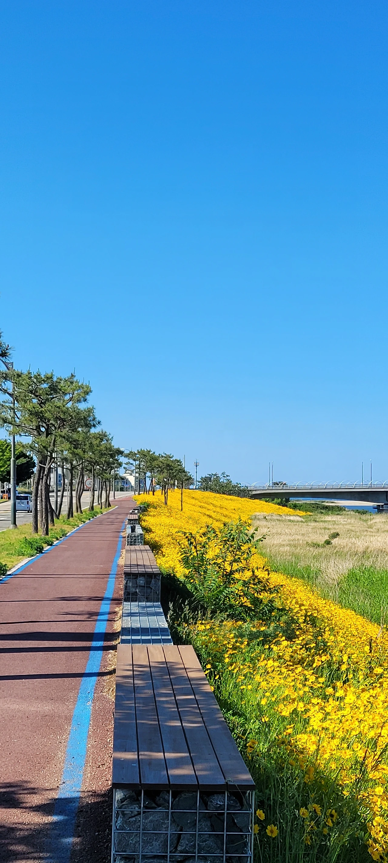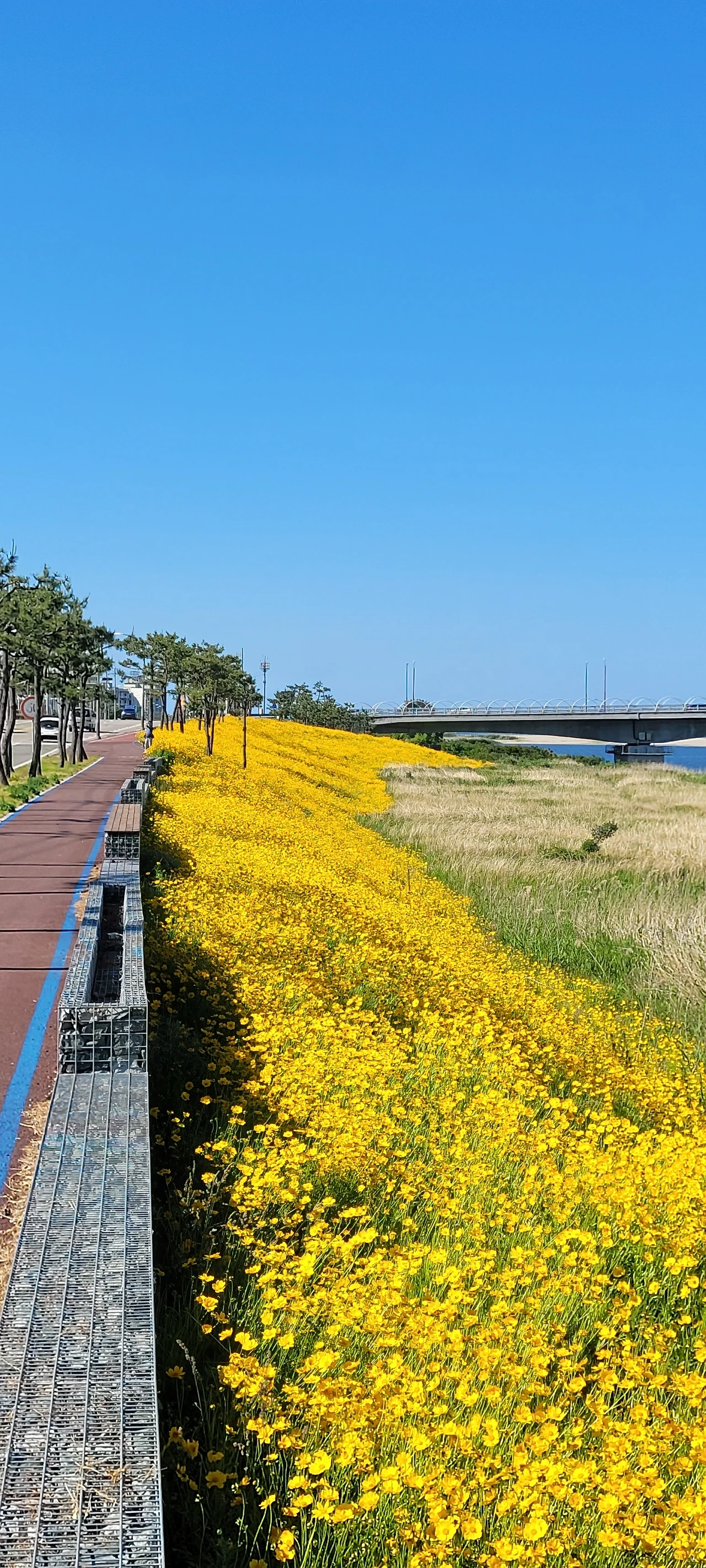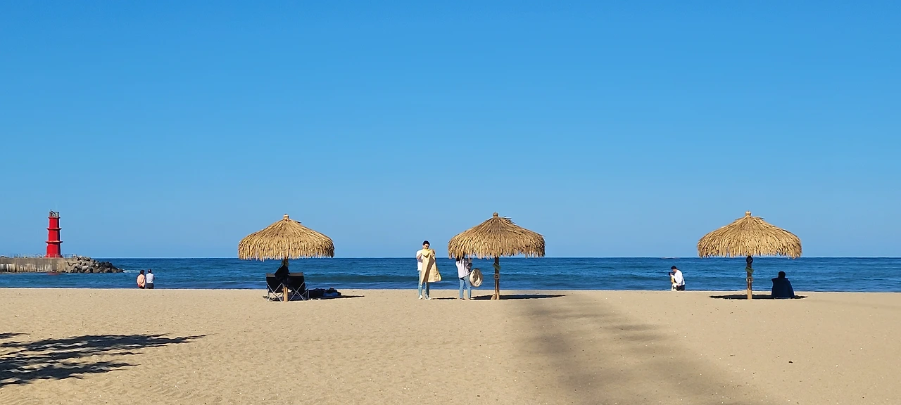 조침령을 신나게 내려와 초보들은 버스를 타고 양양으로 이동하려고 했지만 리더의 제안으로 모두 다 자전거로 가기로 결정했다. 평지와 내리막길만 있어서 편히 갈 수 있다는 이유였다. 하지만 어디 길이 그런가! 상당한 오르막을 경험하며 속았다고 불평하지만 이미 지난 일이다. 그렇게 달려서 양양남대천이다. 남대천변에 큰금계국이 환상이다. 무수한 황금빛 물결이 넘실대는 길로 찬탄을 금할 수 없다. 모두 멋진 풍경에 넋을 놓는다. 한참을 감상하고 낙산해수욕장에 들어섰다. 짙푸른 바다와 흰 포말이 원색으로 빛난다. 해변의 파라솔이 그림 같다.