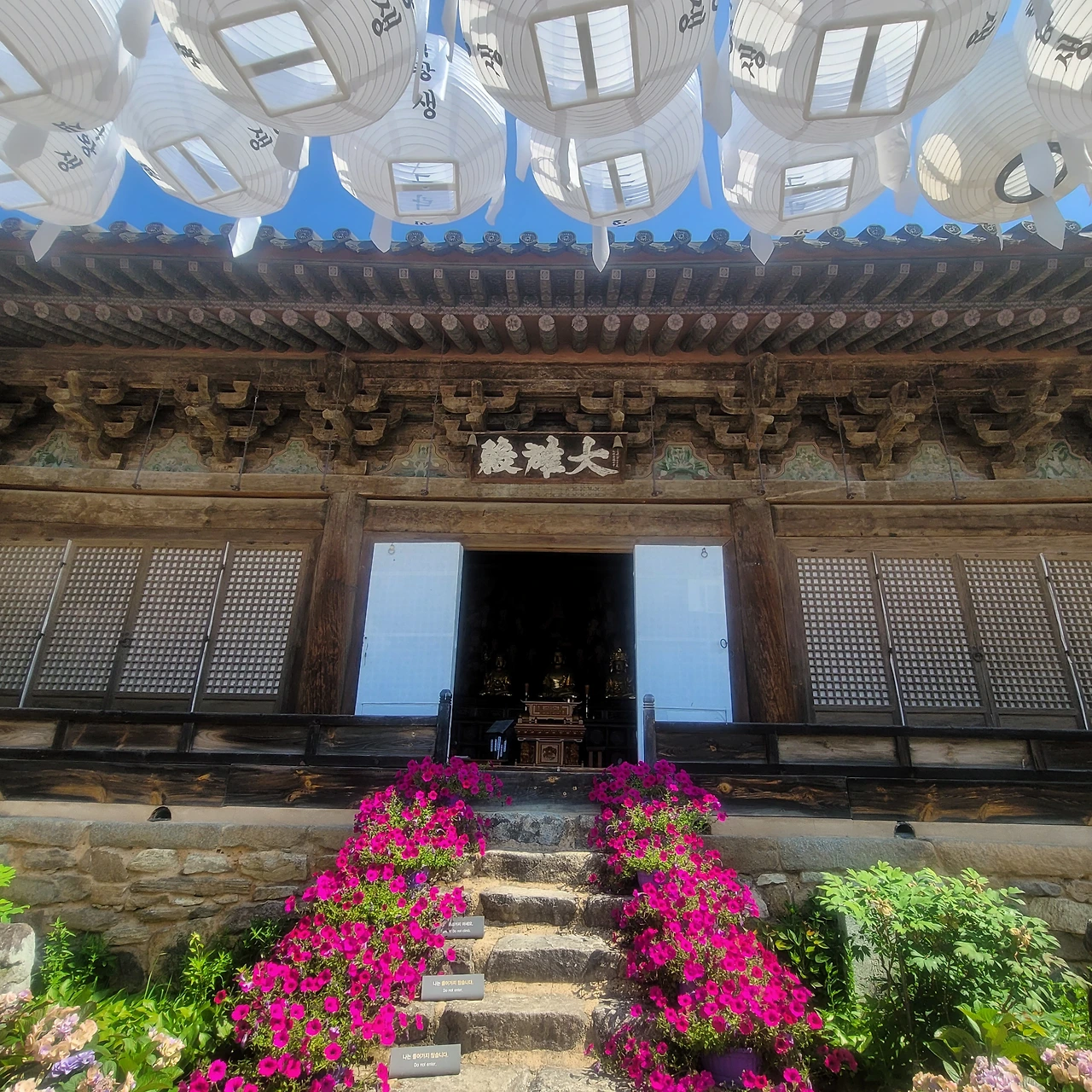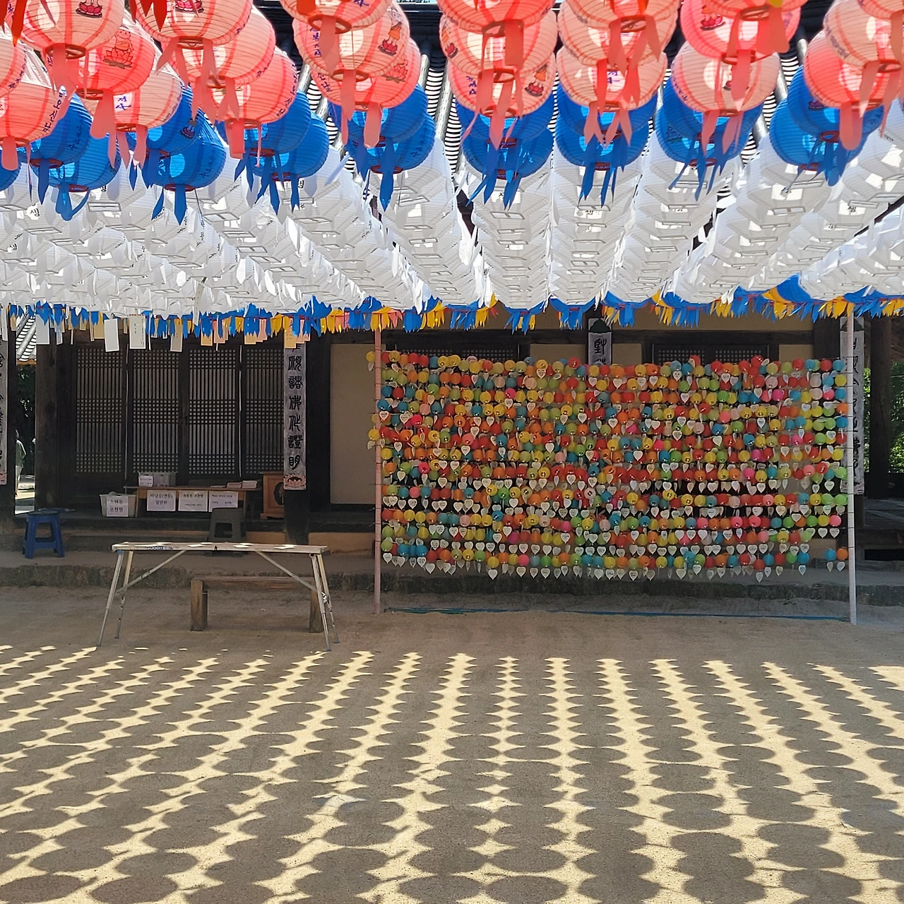 절은 아담했다. 고찰의 분위기는 가득했지만 단아하다는 것이 정확한 표현이리라. 불이문을 지나자 연등이 뒤덮은 대웅전 마당이 나온다. 하얀 등이 걸려 분위기가 새롭다. 석탄일 연등과는 사뭇 다른 풍경이다. 망자를 추모하는 등이라고 한다.