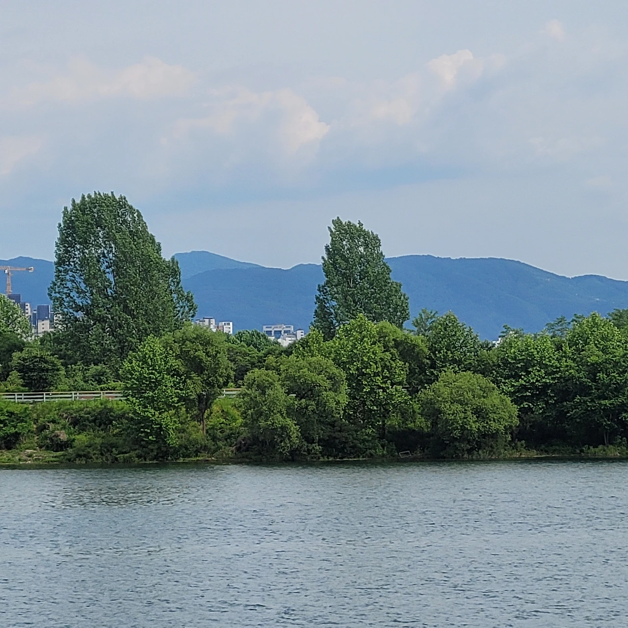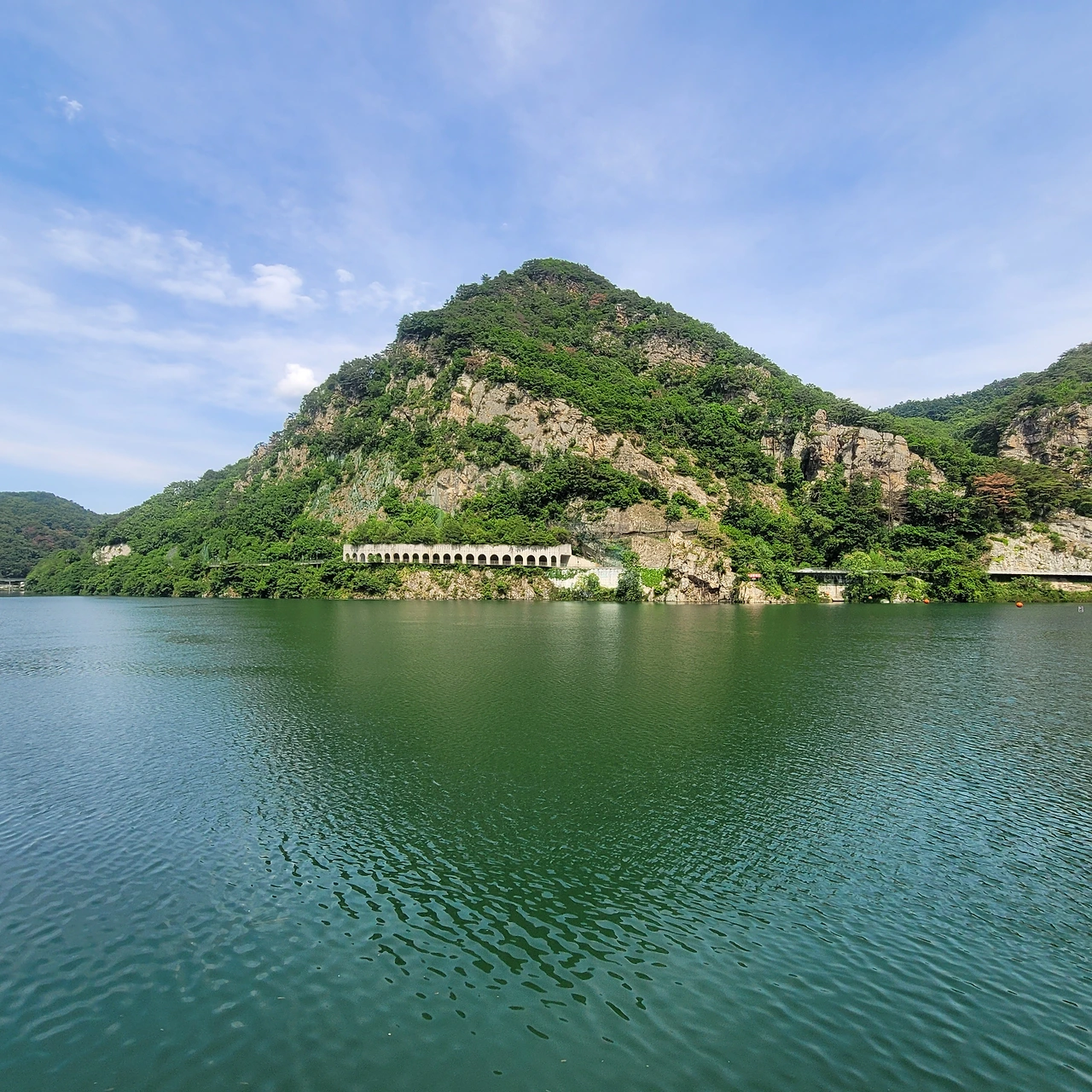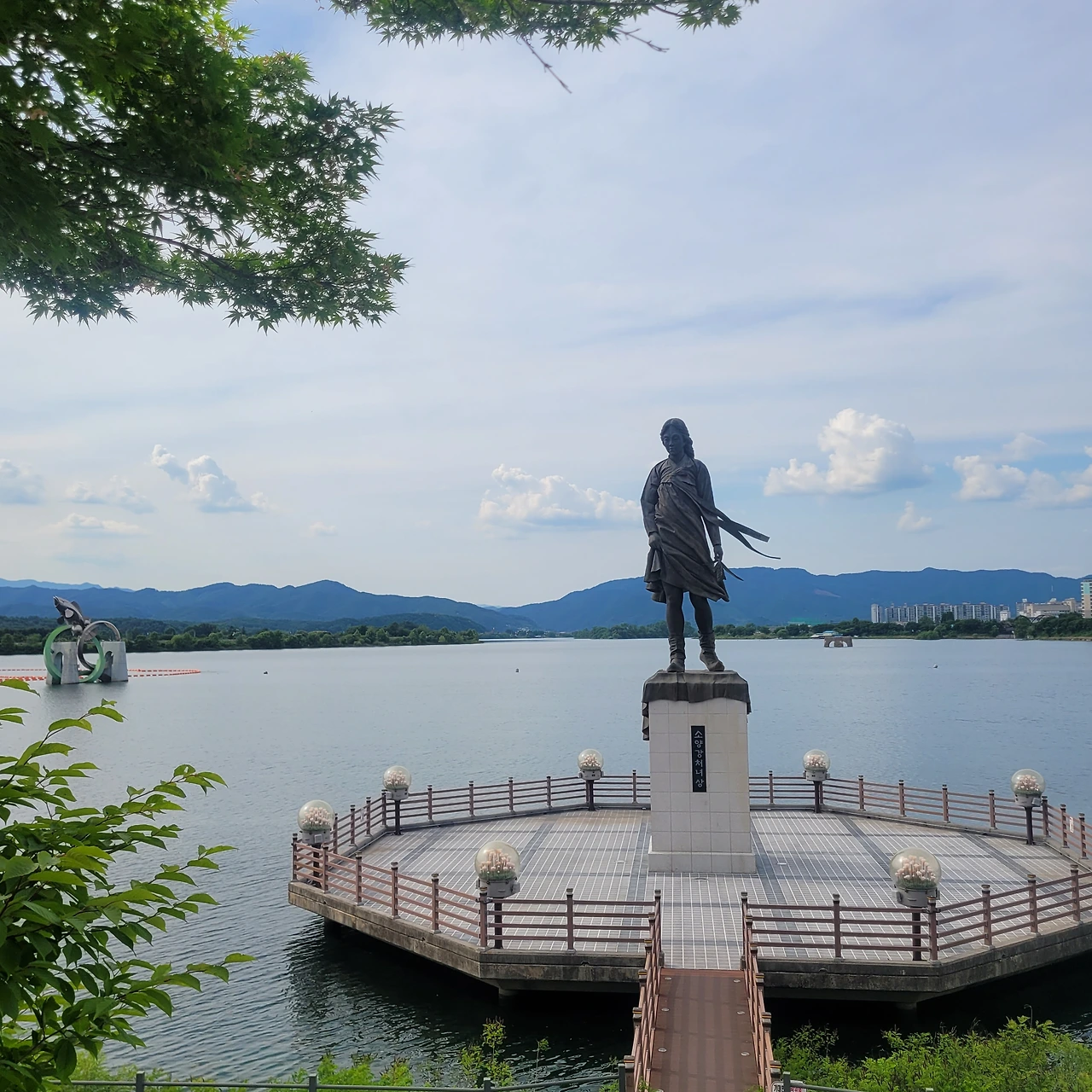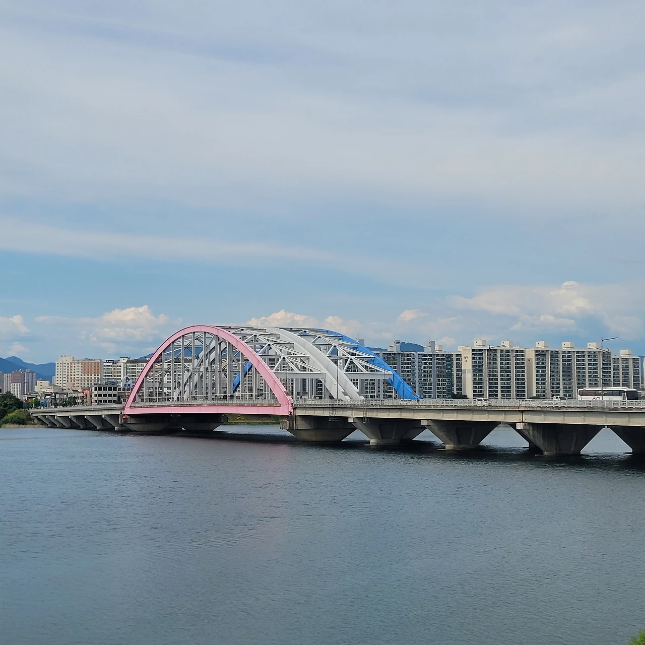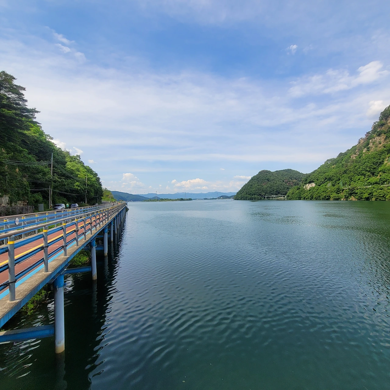 이어진 길은 더 가벼운 주행이었다. 어려운 고비를 넘기니 힘든 것은 잊히고 잘 달리는 것만 부각되어 활기찬 걸음으로 달렸다. 의암호에 도착해서 수변 풍경이 눈길을 사로잡는다. 넓고 푸른 호수에 마음이 다 시원하다. 호수 위 데크길을 달리며 라이딩의 즐거움을 만끽한다. 목적지가 얼마 남지 않았다. 신매대교를 지나 공지천을 끼고 마침내 목적지에 도착했다. 소양강 처녀가 우리를 반긴다. 새로 건설된 스카이 워크도 보인다.