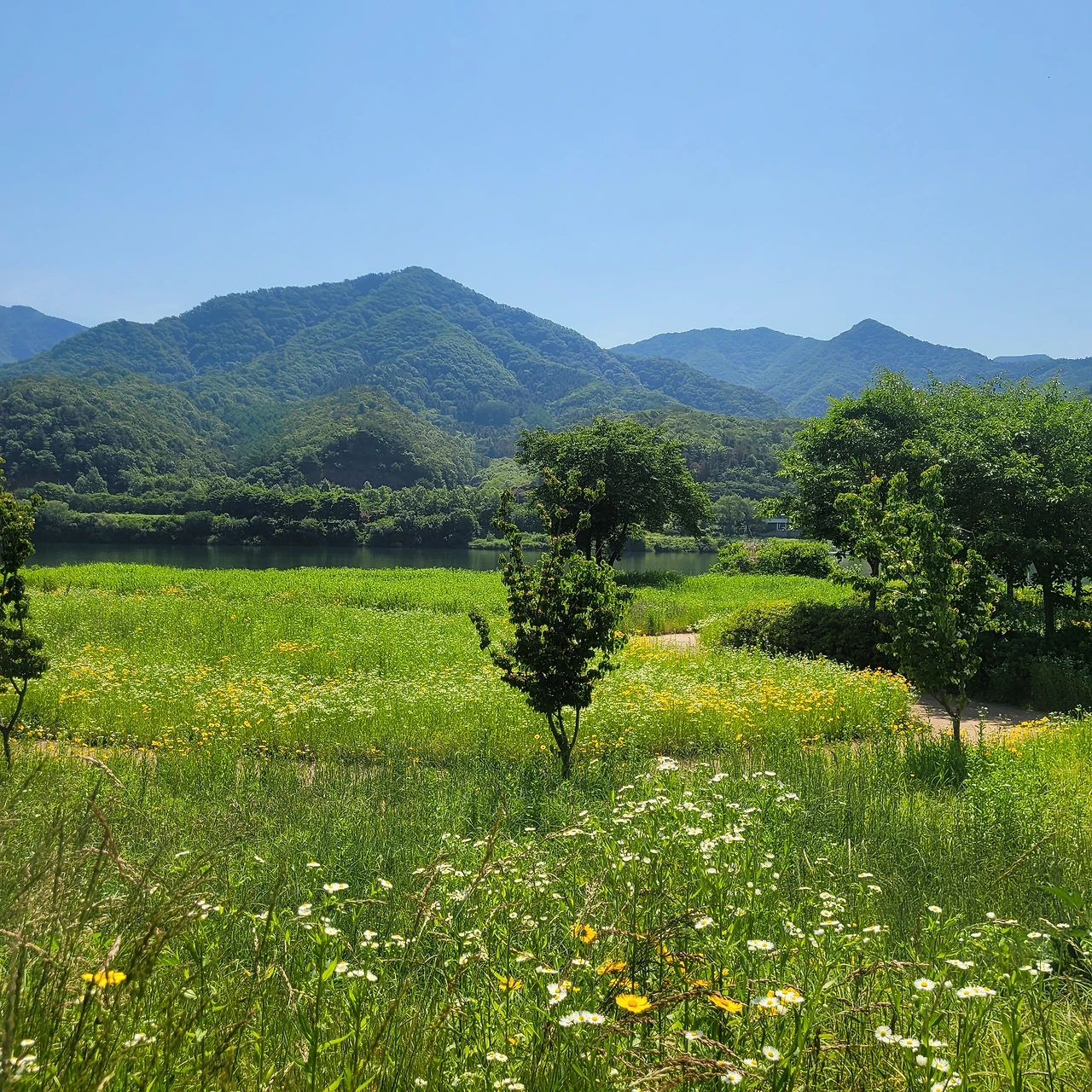 전철은 한가했다. 맨 앞 칸 거치대에 자전거를 세우고 좌석에 편하게 앉아 대성리까지 갔다. 대성리에 하차하여 곧바로 라이딩을 시작했다. 화창한 날씨라 마음도 덩달아 밝다. 기분 좋게 자전거 도로를 달려 나간다. 연도에는 개망초와 큰금계국이 만발했다. 마치 늘어서서 우리를 환영하는 인파 같다. 의외로 경작을 하지 못한 채, 놀리는 땅들이 많아 잡초로 뒤덮인 들판에 꽃이 지천이다. 한가롭고 평화로운 풍경이 마음을 채운다.