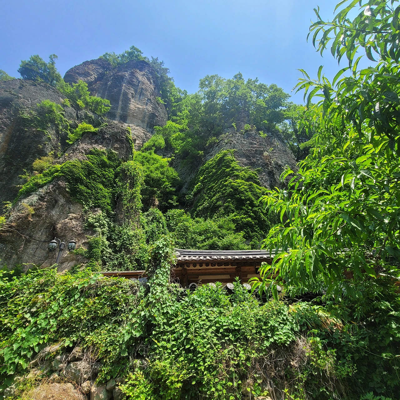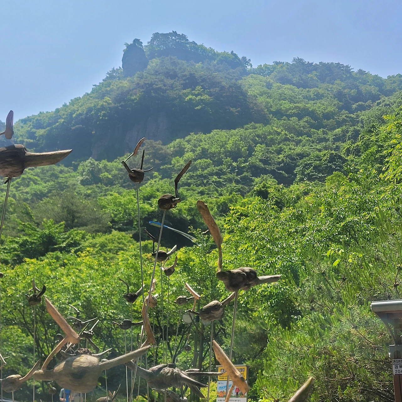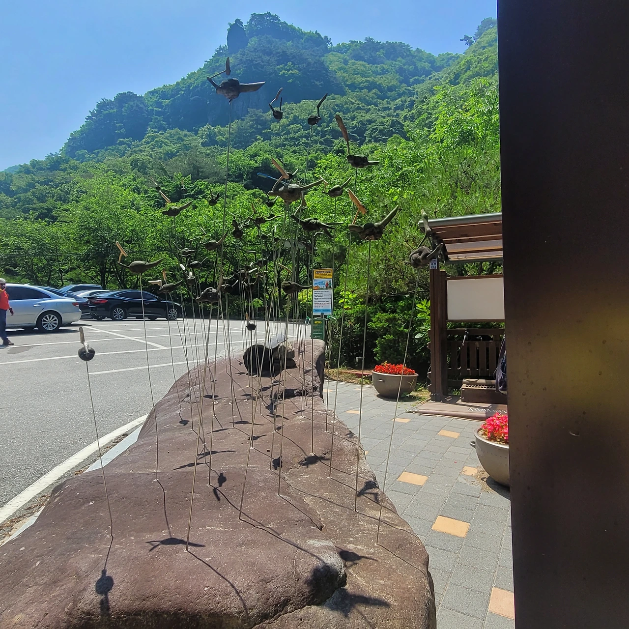 주차장 입구에 자리 잡은 바위 무더기가 입석이었다. 근처에 작은 솟대 무리를 조성해 놓아 예스런 환영인사를 받은 느낌이었다. 입석 주차장은 해발 400미터로 사방이 높은 산으로 둘러 싸인 깊은 산속이다. 우거진 숲과 깊은 계곡이 심산에 왔음을 알린다.