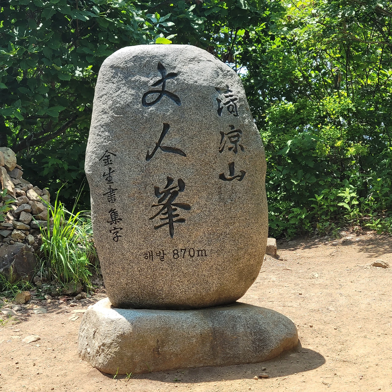 산행의 목표인 장인봉이 얼마 남지 않았다. 가는 길 사위가 아찔하다. 천길 낭떠러지로 이어지는 풍경이 서늘하다. 오르내리며 도착한 장인봉은 너무 단순했다. 나무들에 둘러싸여 시야가 막혀있고 오로지 장인봉이라는 바윗돌 하나만 덩그러니 서있다. 정상이라는 생각이 하나도 들지 않는 곳이다. 그나마 바위에 새겨진 글자가 명필 김생의 집자라는 설명으로 위안을 받는다. 주변을 둘러볼 수 있도록 주변을 정리하는 것이 필요하겠다는 생각이 든다.