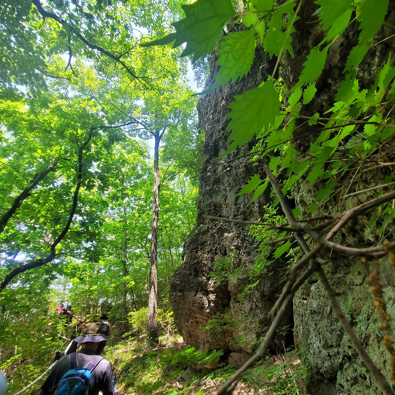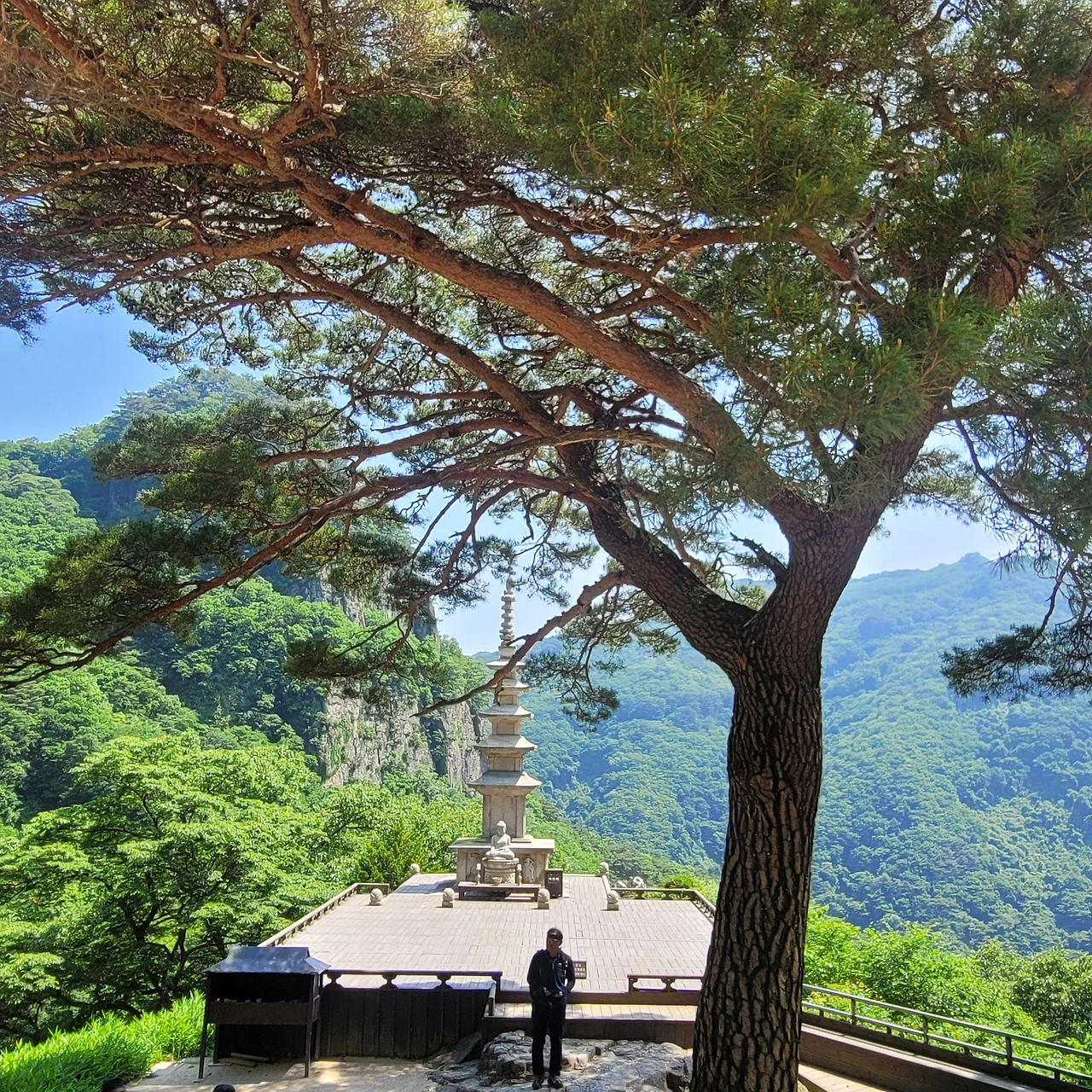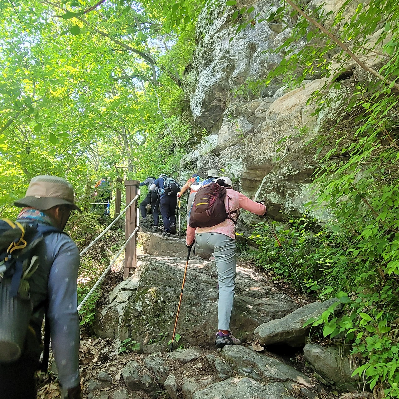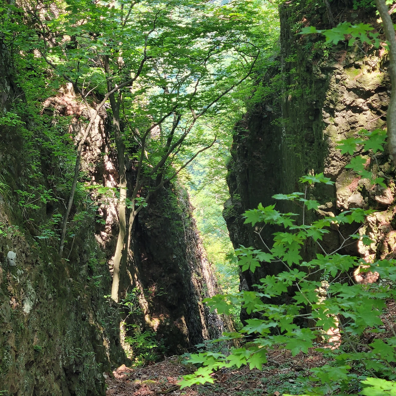 몸은 힘들지만 눈이 즐거운 시간이다. 풍혈대는 암벽 사이에 난 창이다. 풍혈은 바람이 통하는 굴을 뜻하는 데 신라시대 명필 최치원이 독서와 바둑을 즐겼다고 전해진다. 시원한 바람을 맞으며 여유로이 독서를 즐기기에 제격인 장소다. 가는 길에 금탑봉이 한눈에 들어온다. 한낮이지만 그늘이 깊어 더위를 식혀주는 숲길이다.