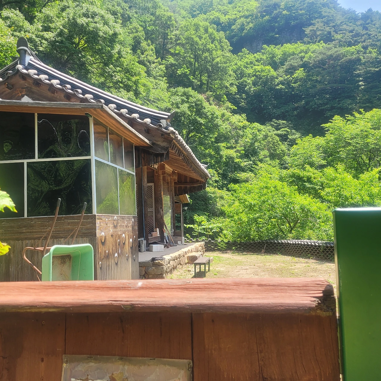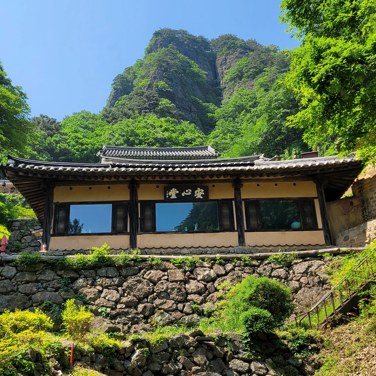 힘이 덜 들다고 하지만 오르막을 계속 올라서 호흡이 가빠진다. 산마루에 올라 아래를 내려다보니 까마득히 이어지는 길이 높은 산에 왔음을 실감하게 한다. 금탑봉의 독특한 자태가 나무숲 사이로 언뜻언뜻 보인다. 숲속에서 암자를 처음 만난다. 예전에는 청량산 전체가 사찰로 암자들이 수두룩 했다고 한다. 암자 앞마당에는 밭이 있다. 수려한 기암 밑에 자리 잡아 산속에 안긴 자태다. 이곳에 은거하는 삶에는 세상은 아무 미련도 남지 않을 것 같다.