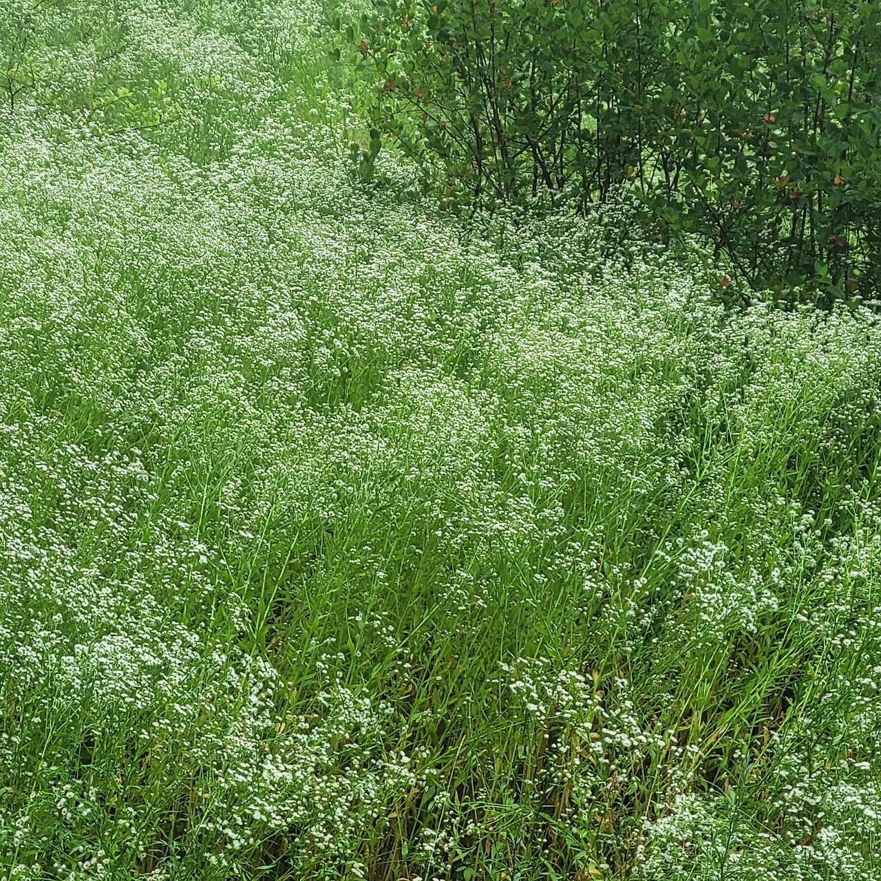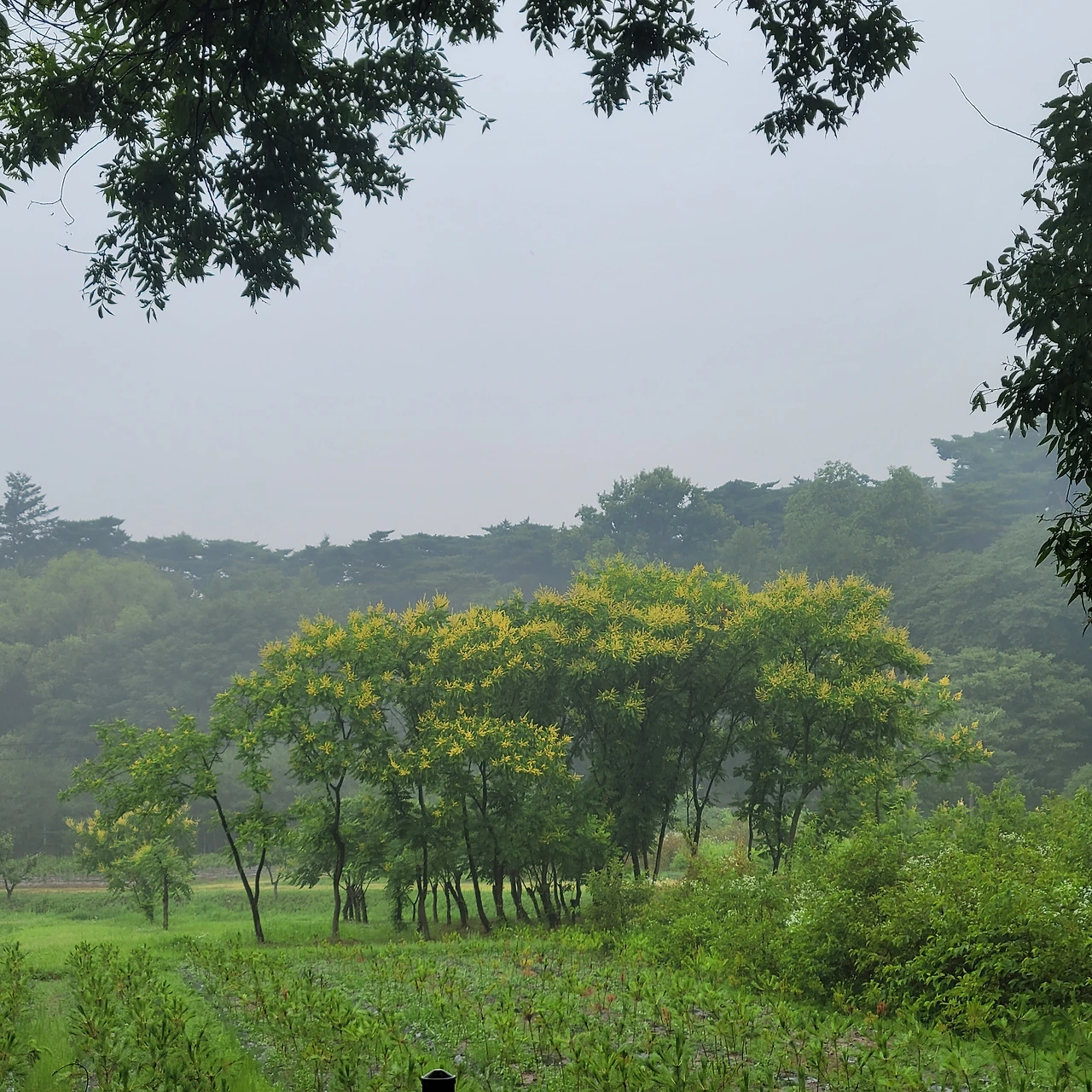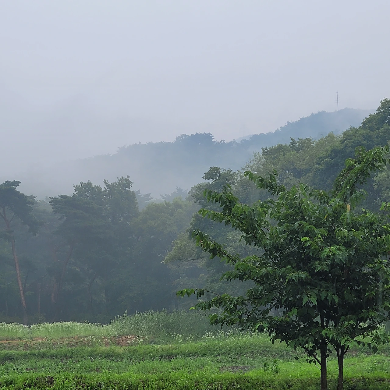 다행히 세차게 쏟아지지 않는 빗소리도 감미로웠다. 물안개가 피어오른 몽환적인 숲 속에서 뻐꾸기 소리가 동화처럼 들려서 신비로웠다. 숲길도 호젓하고 한적했다. 우산이 없어도 나쁘지 않은 상황이었고 아예 비를 맞으며 걸어도 좋을 것 같았다. 길가의 묵힌 밭에는 개망초가 만발했다. 심지도 가꾸지도 않은 꽃밭이 눈부시다.