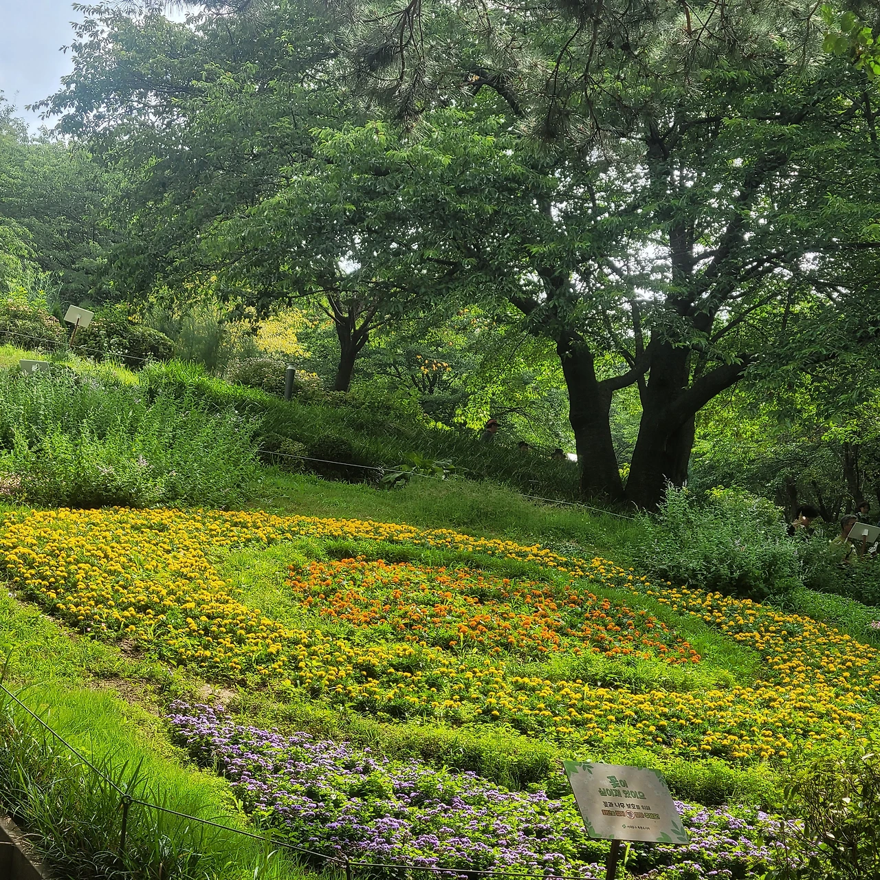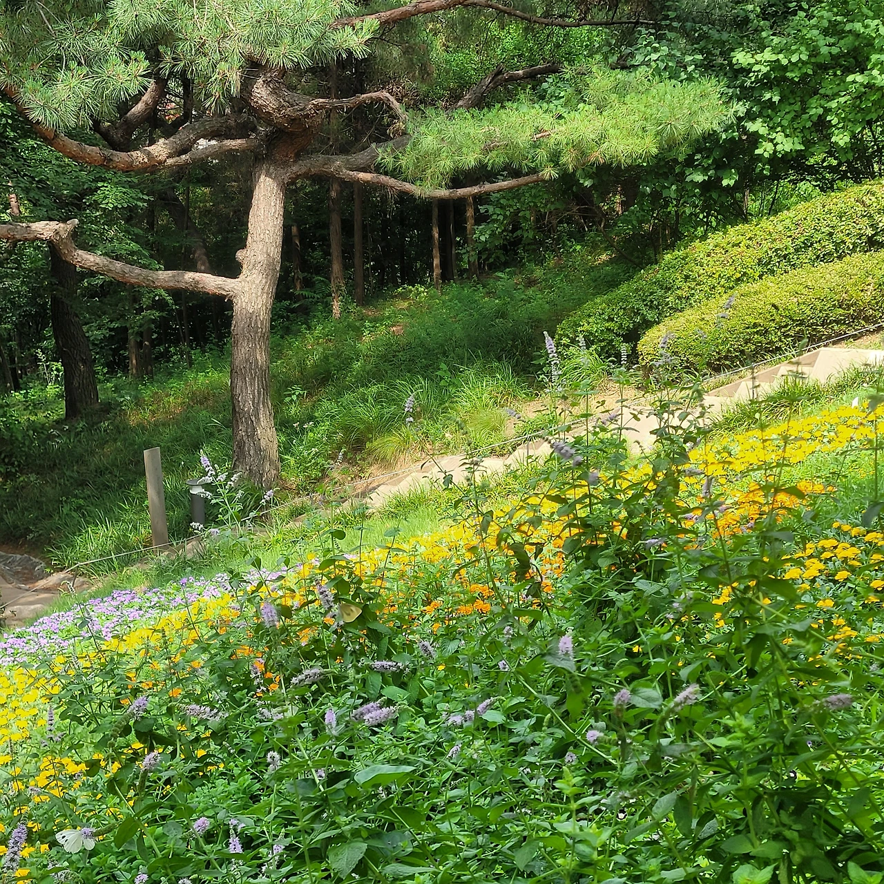홍제천에서 자락길로 들어섰다. 경사가 진 산길을 오르면 꽃으로 정돈된 아름다운 정원이 눈에 들어온다. 푸른 숲도 좋지만 꽃들이 수놓는 정원은 또 다른 기쁨이다. 타원형으로 구성된 색색으로 물든 꽃밭이 푸른 나무아래서 산뜻한 생동감을 안긴다. 이어지는 정원에는 각종 허브가 자라 스치는 손길마다 은은한 향기를 풍긴다. 한창 핀 원추리도 반가운 얼굴로 우리를 맞는다. 저절로 마음이 풀어지는 고운 숲길이다. 조금 더 길을 오르면 데크로 조성된 자락길에 들어선다.