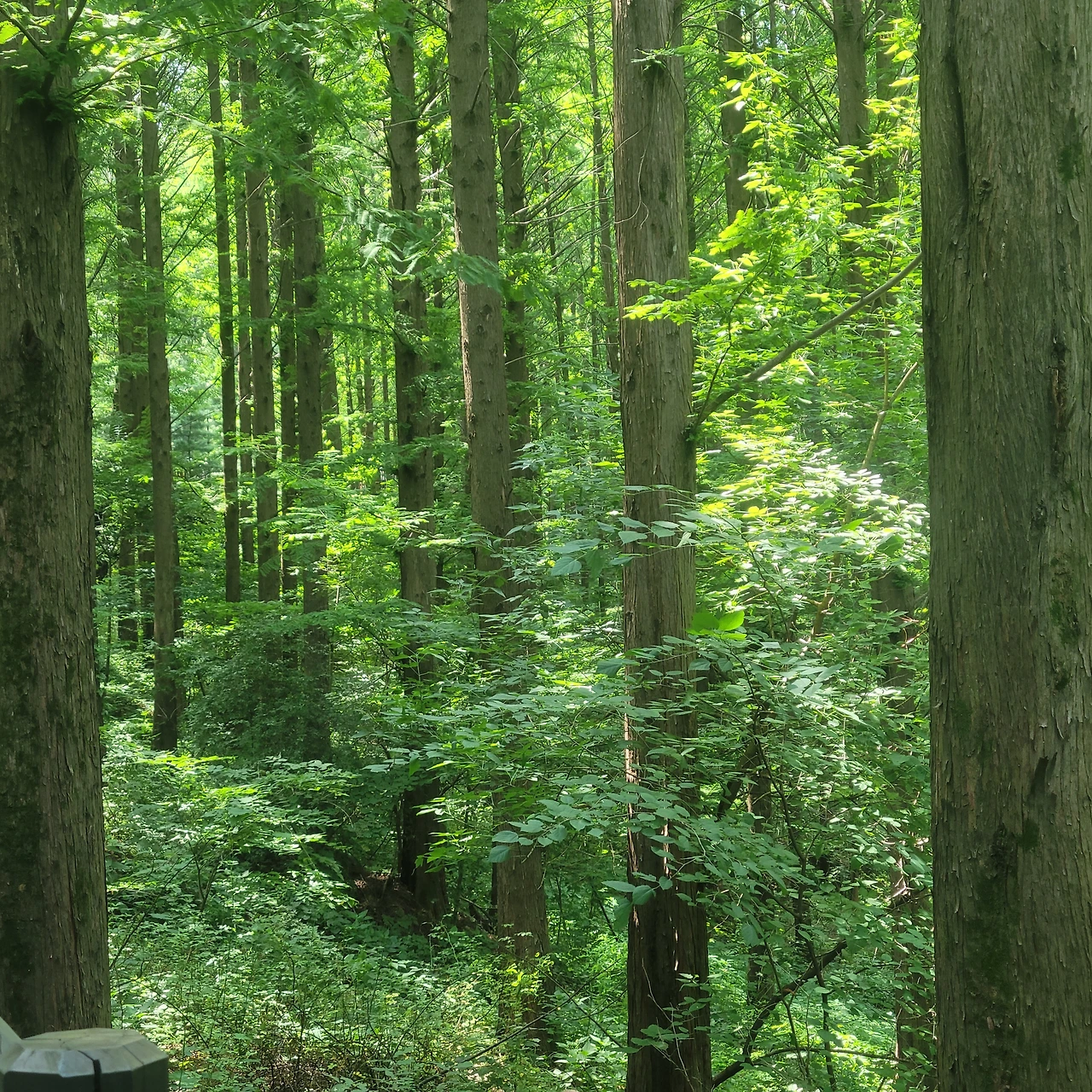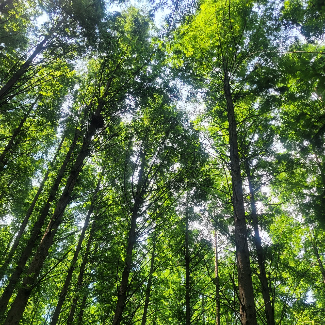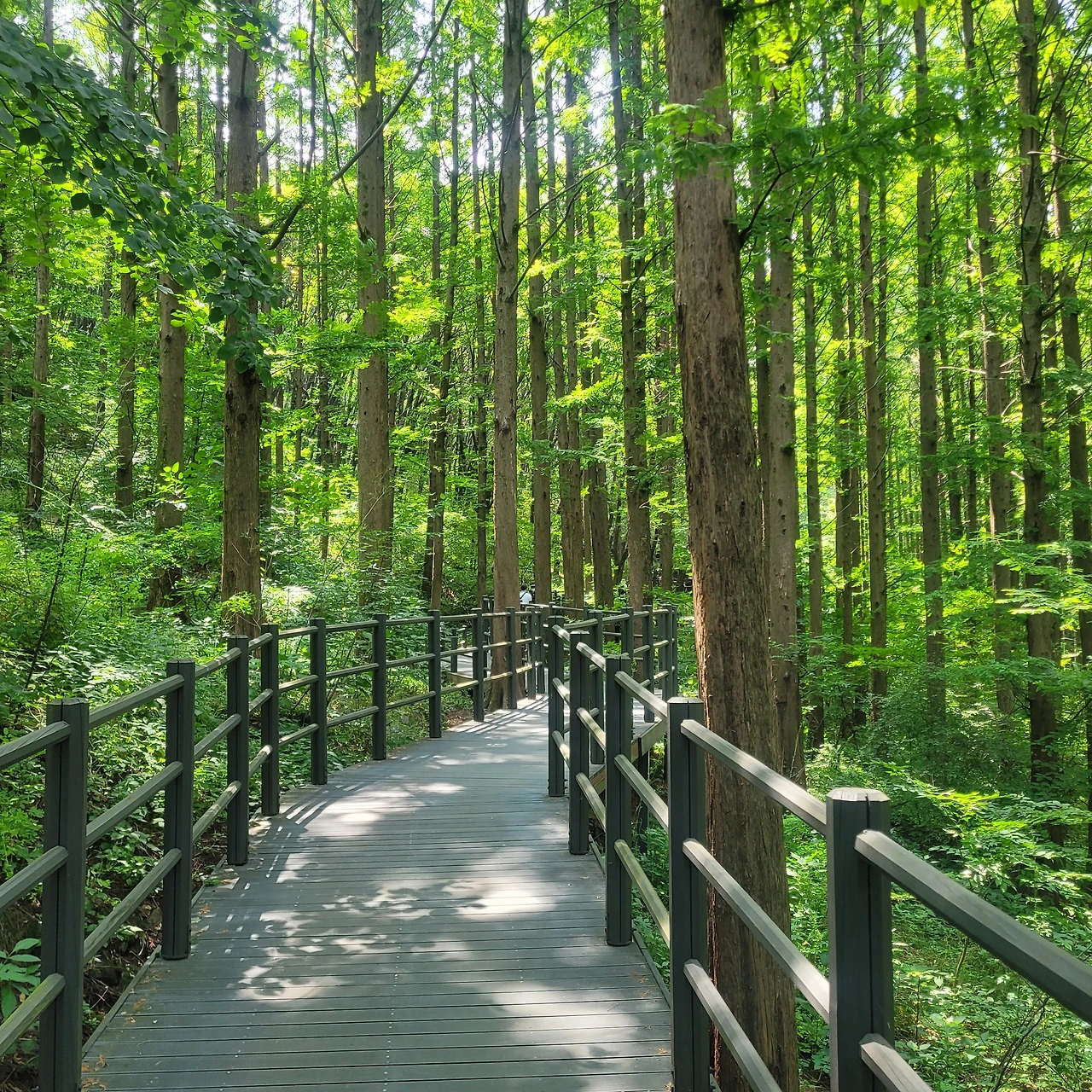메타세쿼이아와 독일가문비 숲 사이에는 너른 휴게실이 있다. 그곳에서 사람들이 삼삼오오 모여 앉아 음식을 나누고 있다. 도시락을 준비해서 찾아와도 좋을 것 같다. 평탄한 데크길이라 전혀 힘들지 않게 걸을 수 있는 것도 좋은 점이다. 독일가문비 숲에서 우리 일행도 여장을 풀고 3분 동안 숲멍을 하는 시간을 가졌다. 눈앞에 보이는 푸른 숲을 마음에 가득 담는다. 깊은 호흡을 통해 나를 비워내고 자연을 들이마신다. 주관하는 숲동기가 자작 노래를 들려준다. '난 충분히 잘 살고 있구나 지금 이 숲에 있는 걸 보면. 난 충분히 잘 살고 있구나 좋은 벗들과 함께 있으니' 마음이 닿는 가사에 친숙한 가락이 감동과 웃음을 준다.