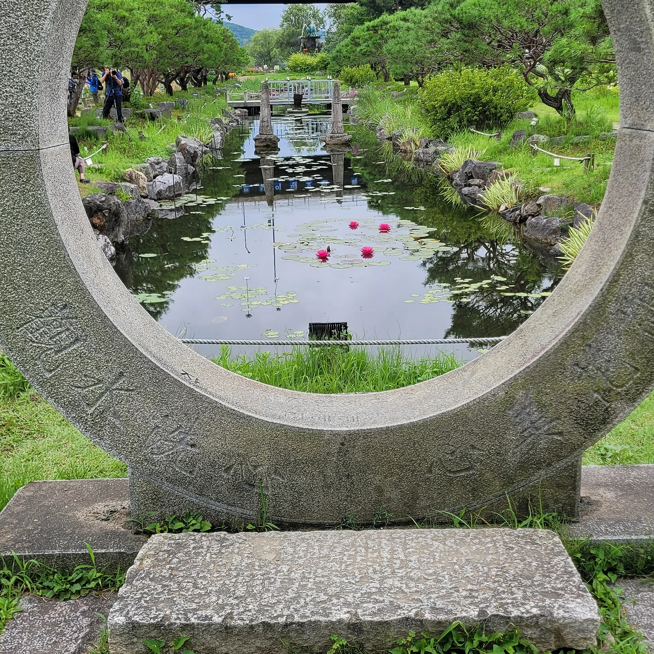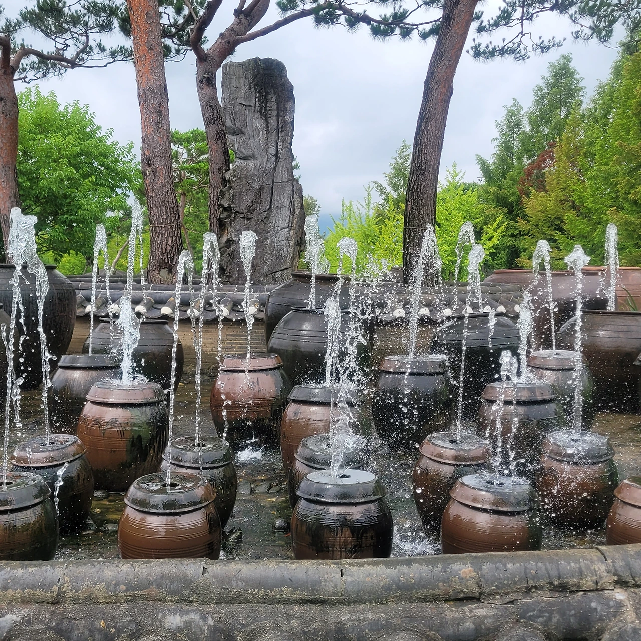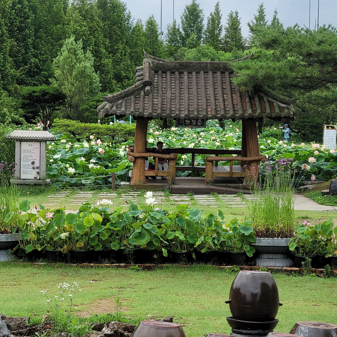 그 너머에는 항아리 분수가 시원하게 물을 뿜고 있다. 장독대 분수는 창의적 공간이다. 옛 정취를 담은 연출이 신선하다. 드디어 주인공들이 등장했다. 정자를 두고 펼쳐진 백련이 우아한 자태를 드러낸다. 푸른 잎들도 싱그럽다. 날이 흐리지만 연등이 불을 밝혀 환하다. 가슴 떨린 설렘처럼 꽃봉오리에는 붉은빛이 돈다. 연꽃은 꽃의 탄생부터 아름답다. 연꽃의 수술은 또 얼마나 아름다운지... 태양을 낳는 꽃이라는 별칭이 딱 들어맞는다. 순백이 주는 정결함에 마음을 정하게 씻는다.
