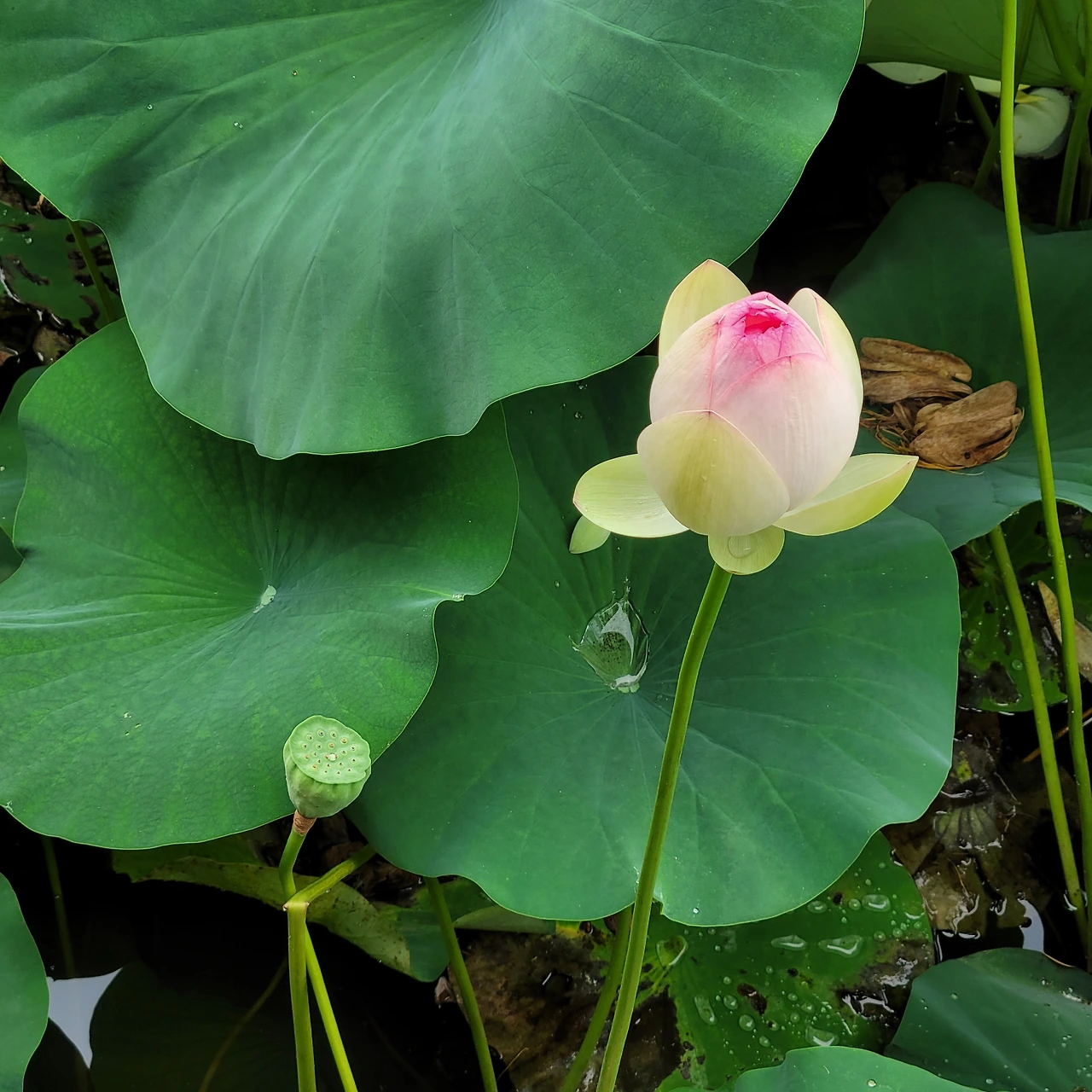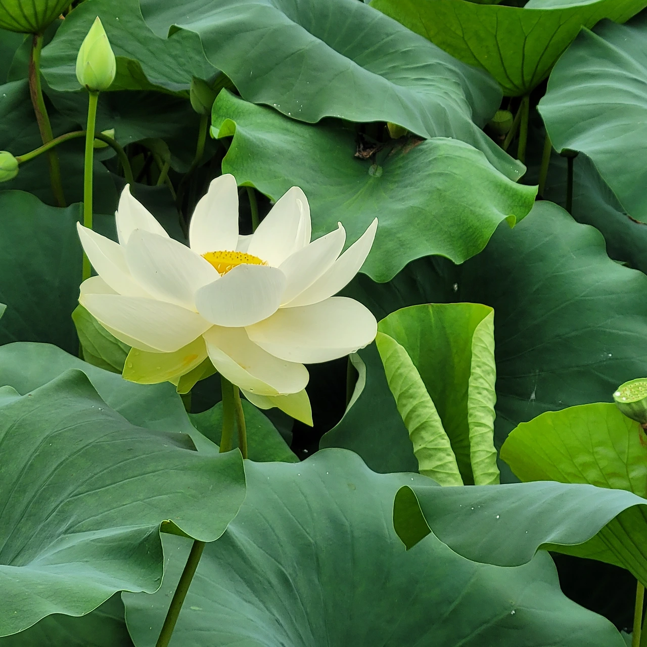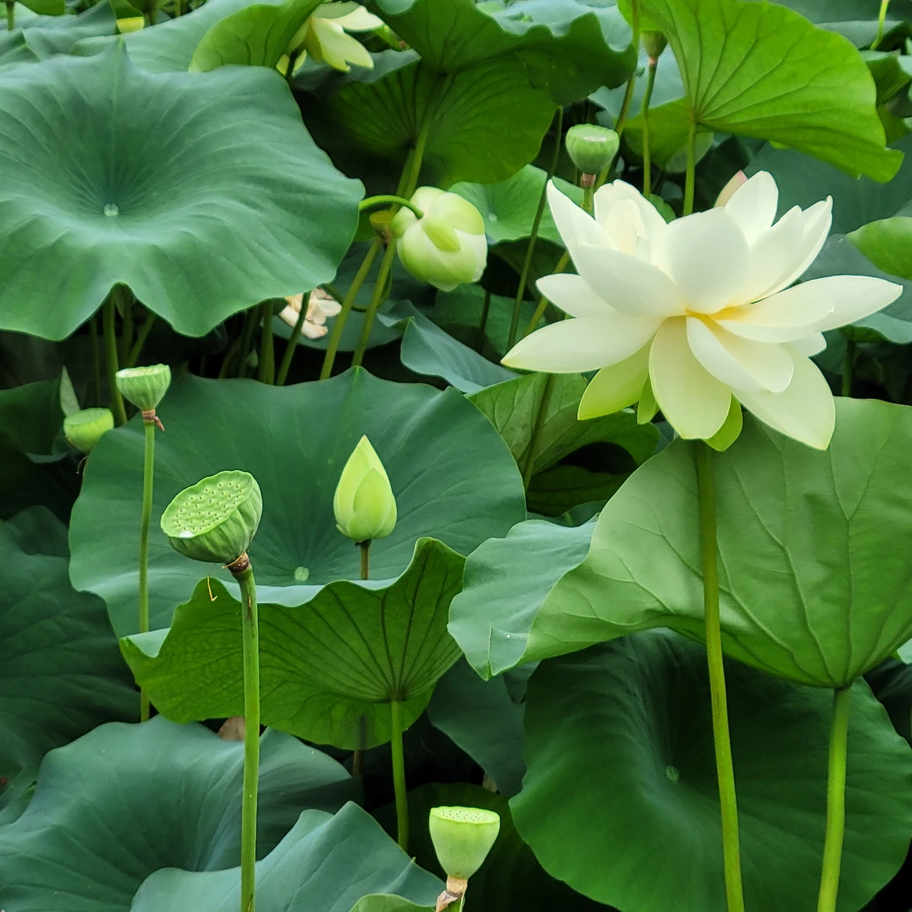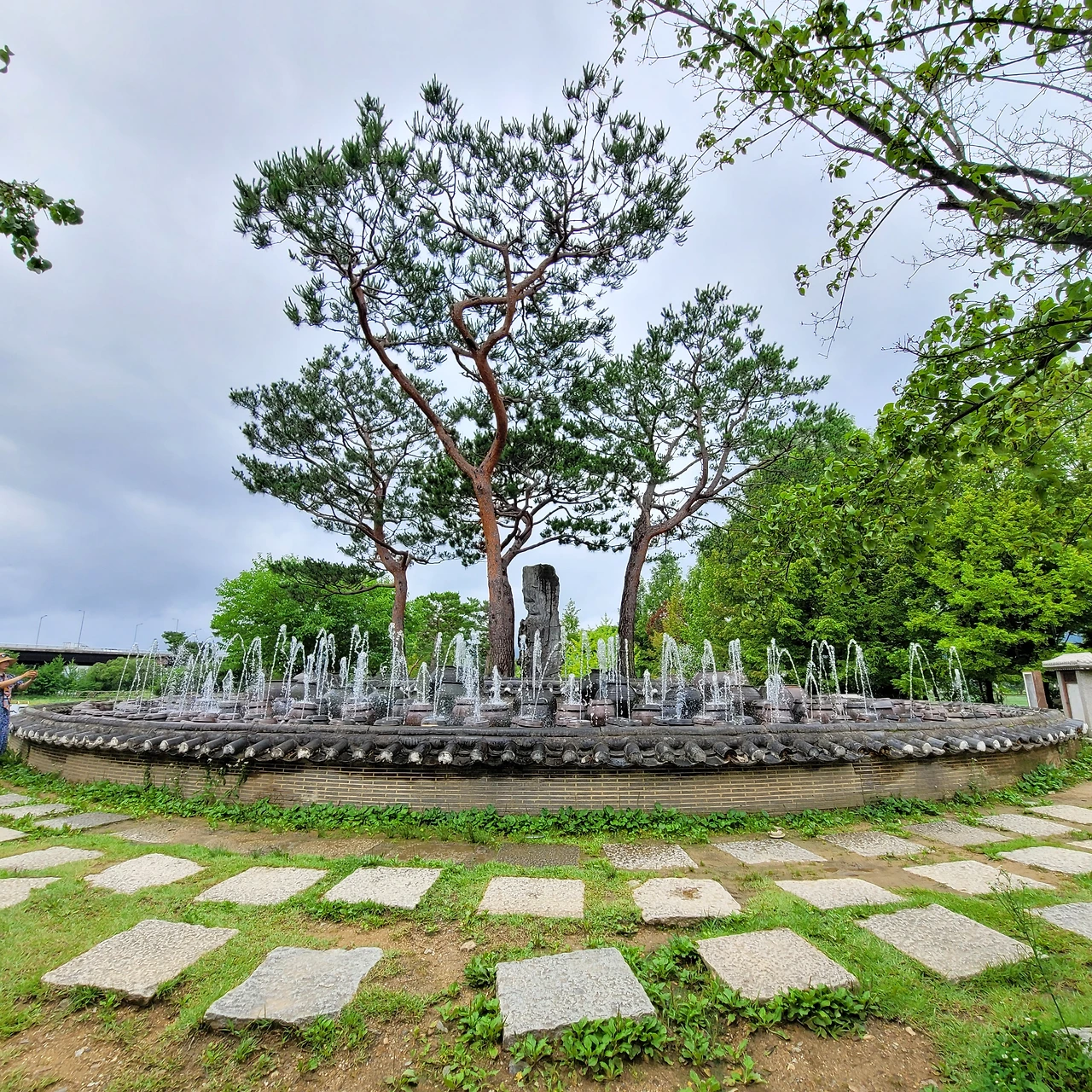 그 너머에는 항아리 분수가 시원하게 물을 뿜고 있다. 장독대 분수는 창의적 공간이다. 옛 정취를 담은 연출이 신선하다. 드디어 주인공들이 등장했다. 정자를 두고 펼쳐진 백련이 우아한 자태를 드러낸다. 푸른 잎들도 싱그럽다. 날이 흐리지만 연등이 불을 밝혀 환하다. 가슴 떨린 설렘처럼 꽃봉오리에는 붉은빛이 돈다. 연꽃은 꽃의 탄생부터 아름답다. 연꽃의 수술은 또 얼마나 아름다운지... 태양을 낳는 꽃이라는 별칭이 딱 들어맞는다. 순백이 주는 정결함에 마음을 정하게 씻는다.