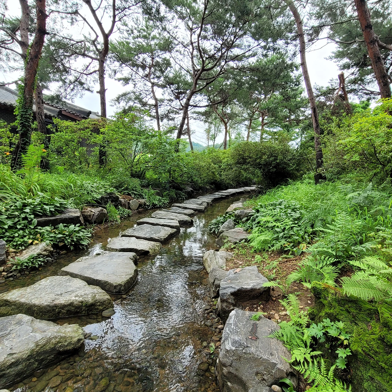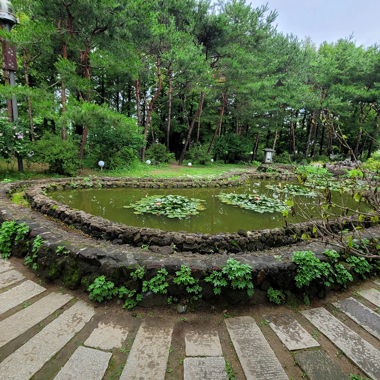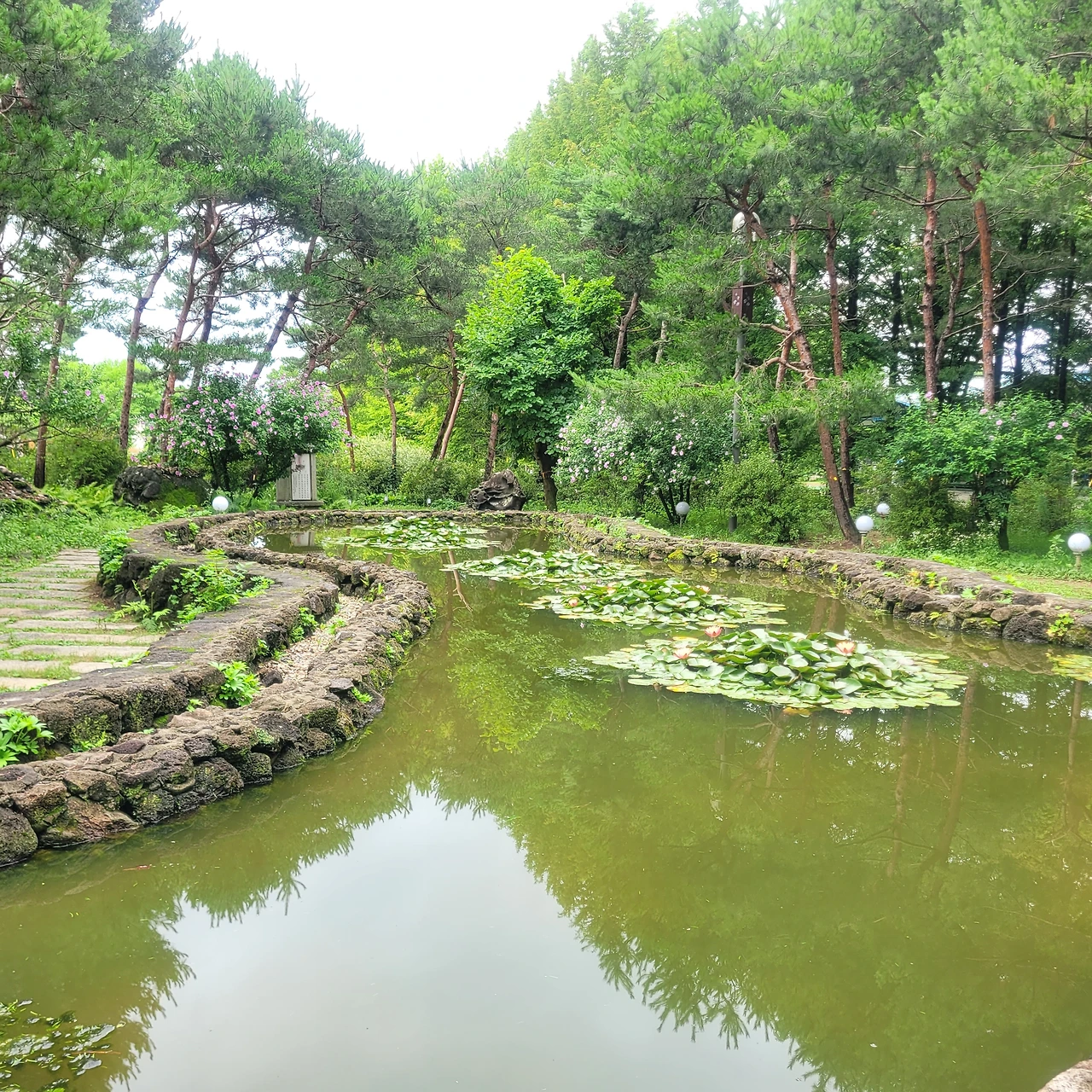 1층에는 작은 북카페가 있어 식물에 관한 책을 읽으며 쉴 수 있는 공간도 있다. 박물관을 뒤로하고 불이문으로 들어섰다. 개울에 돌다리를 놓아 굽어진 물길을 걷는다. 신선한 발상이다. 그 길을 걸어가면 돌로 조성된 작은 정원이 있다. 숲이 두른 비밀의 정원에는 수련들이 오손도손 자란다. 자연스러운 곡선의 조형이 숲과 조화롭다.