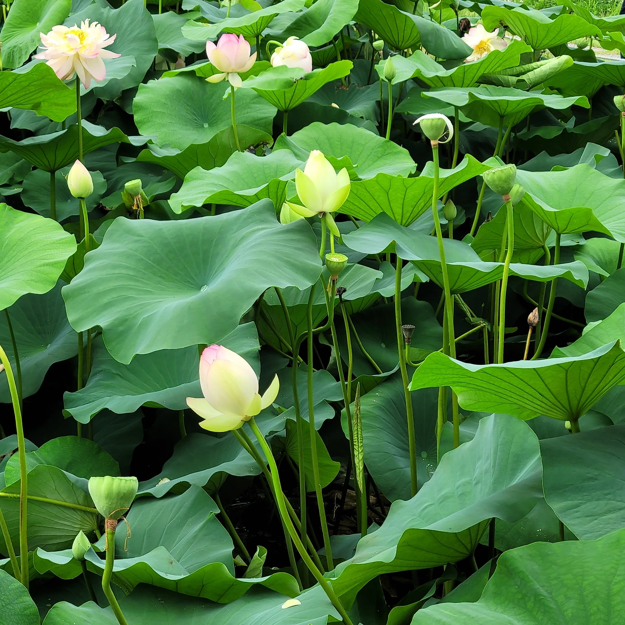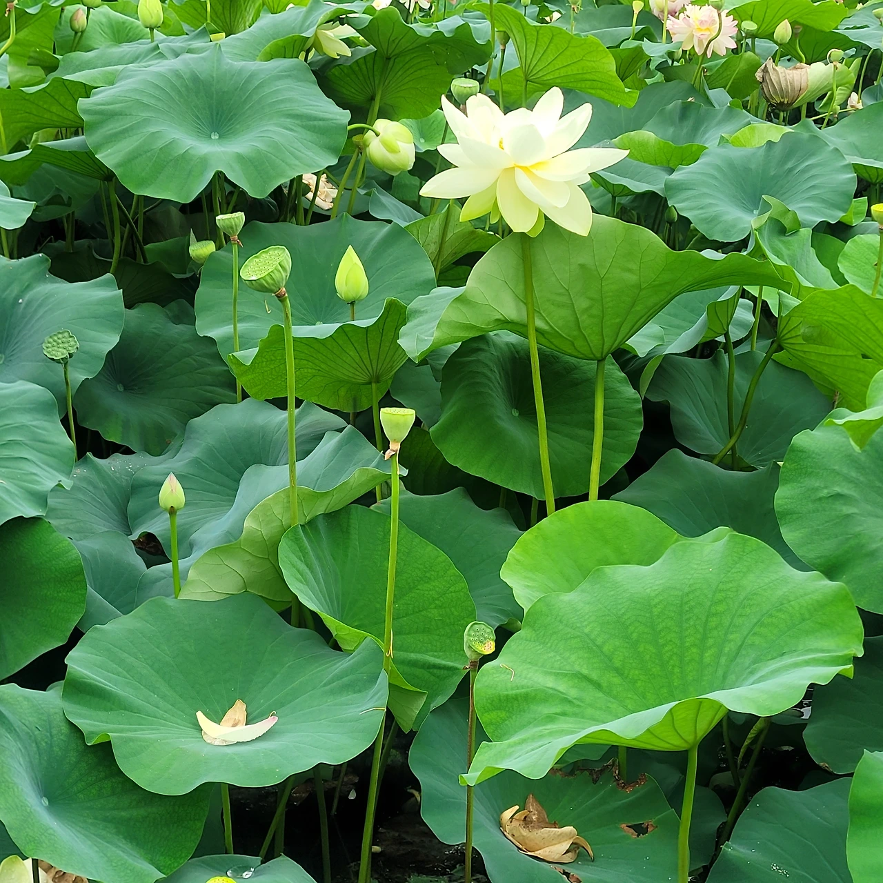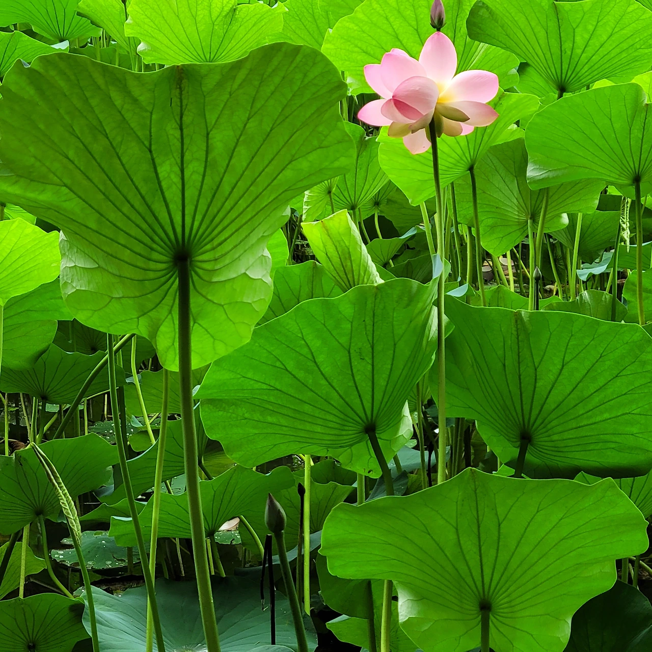 연못마다 녹음이 드리우고 꽃이 불을 밝힌다. 연꽃은 뒷면의 자태도 빠지지 않는다. 잎맥이 지닌 고운 선들과 원형의 잎들도 고유한 미를 지녔다. 물에 비친 모습도 신비롭다.