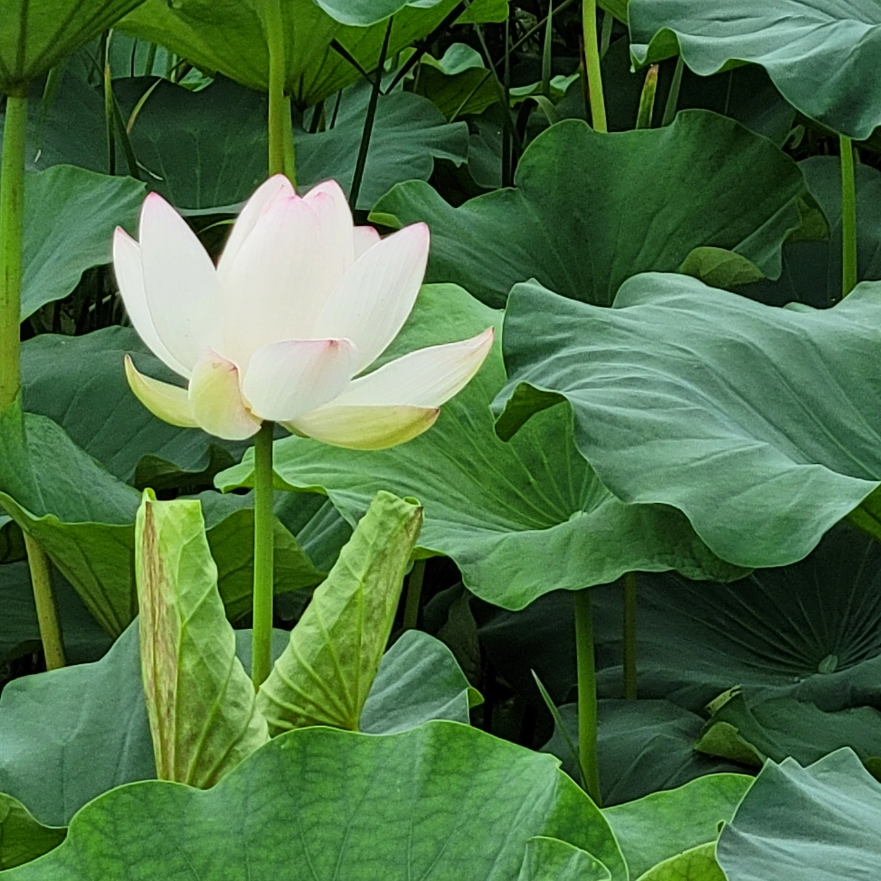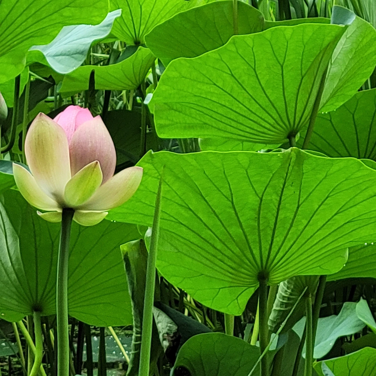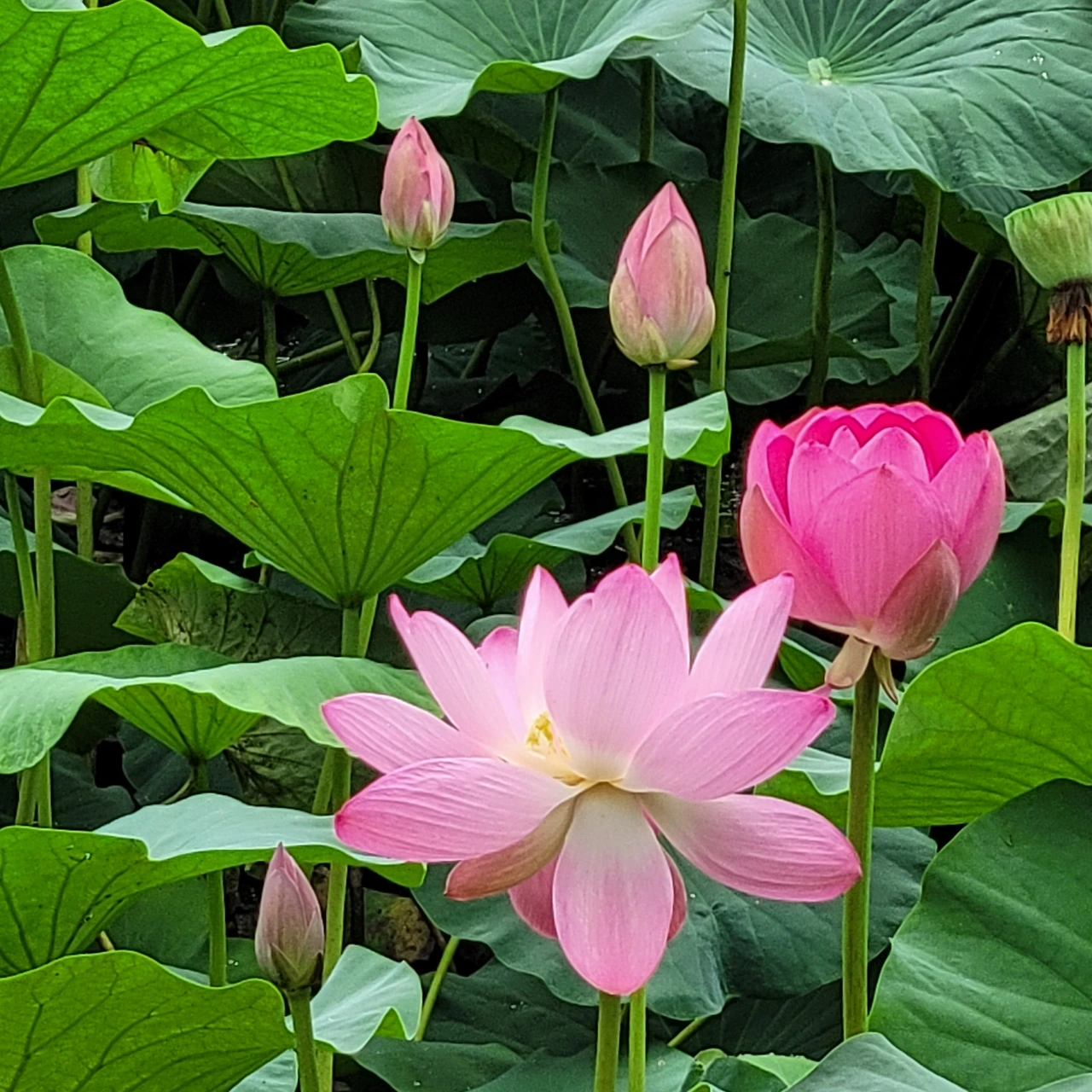 연못마다 녹음이 드리우고 꽃이 불을 밝힌다. 연꽃은 뒷면의 자태도 빠지지 않는다. 잎맥이 지닌 고운 선들과 원형의 잎들도 고유한 미를 지녔다. 물에 비친 모습도 신비롭다.