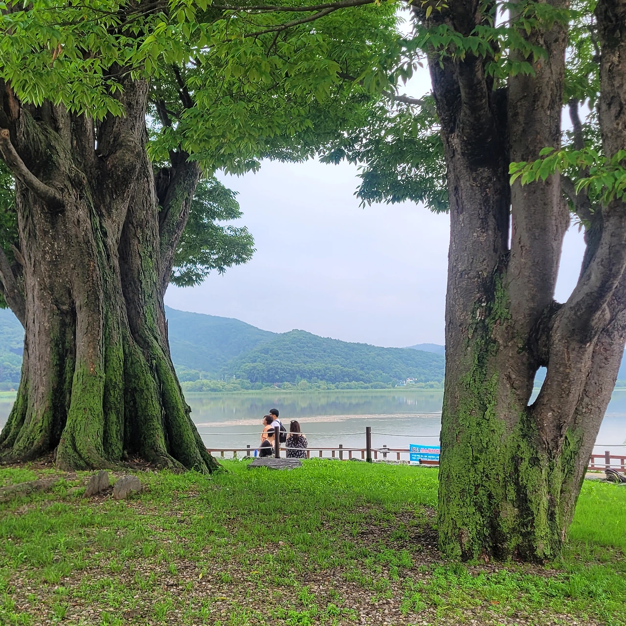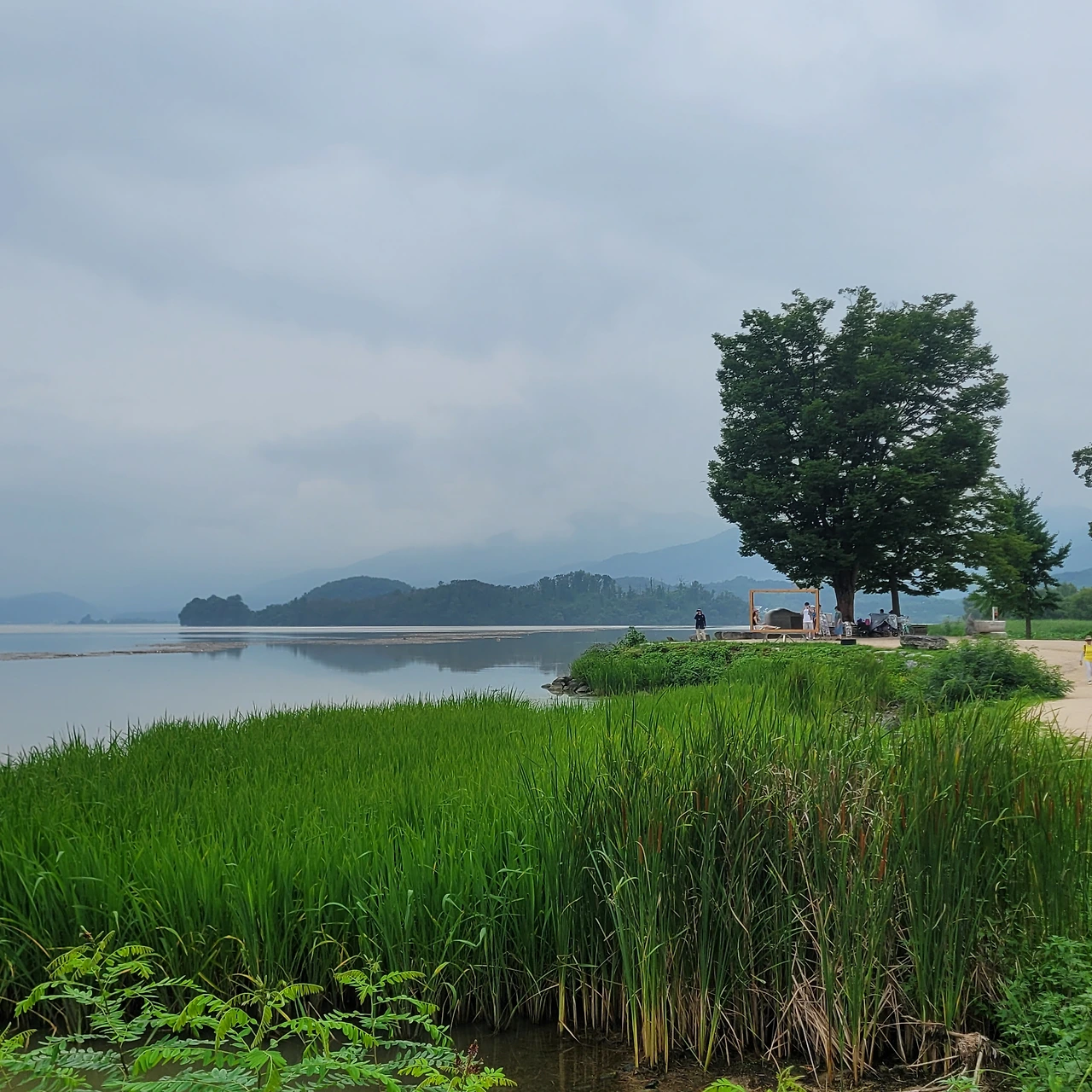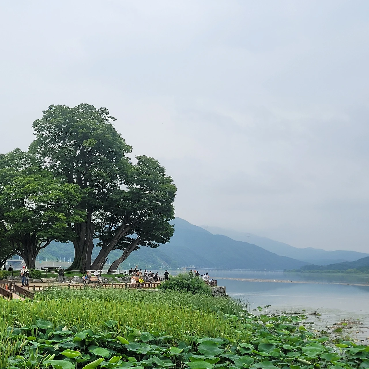 비가 많이 내려 한강에는 쓰레기들이 떠다닌다. 그래도 운무를 드리운 강안 풍경은 아름답다. 우람한 나무들이 빚어내는 풍경은 항상 감동이다. 마음을 편안하게 한다. 거른 점심을 연잎 핫도그 하나로 마무리를 하고 세미원으로 다시 돌아간다. 돌아가는 길 풍경도 이미 지나왔지만 다시 새롭다.