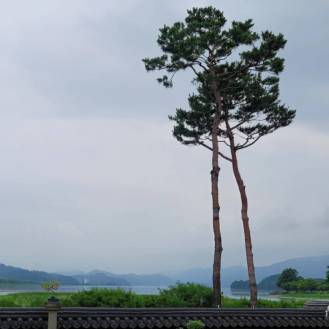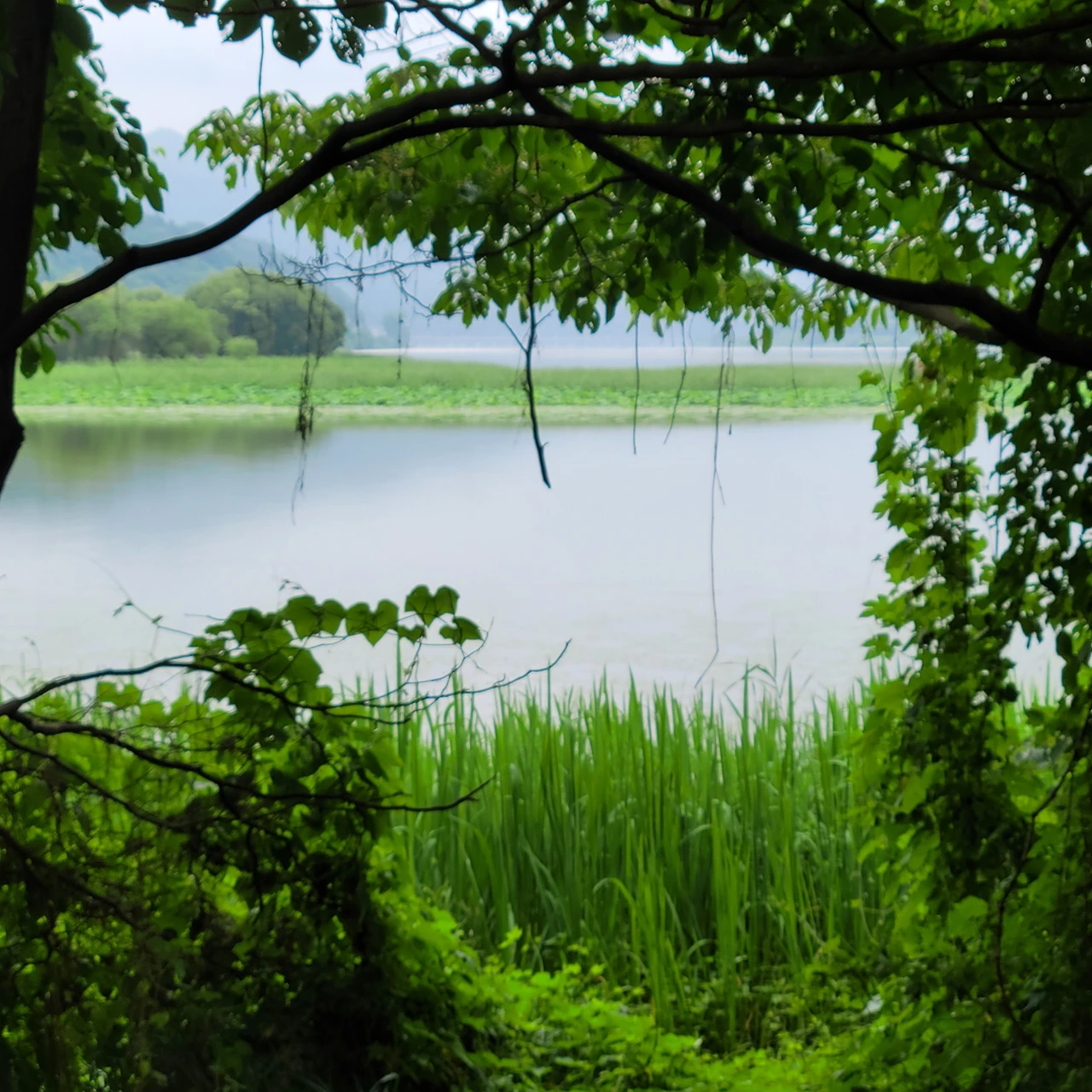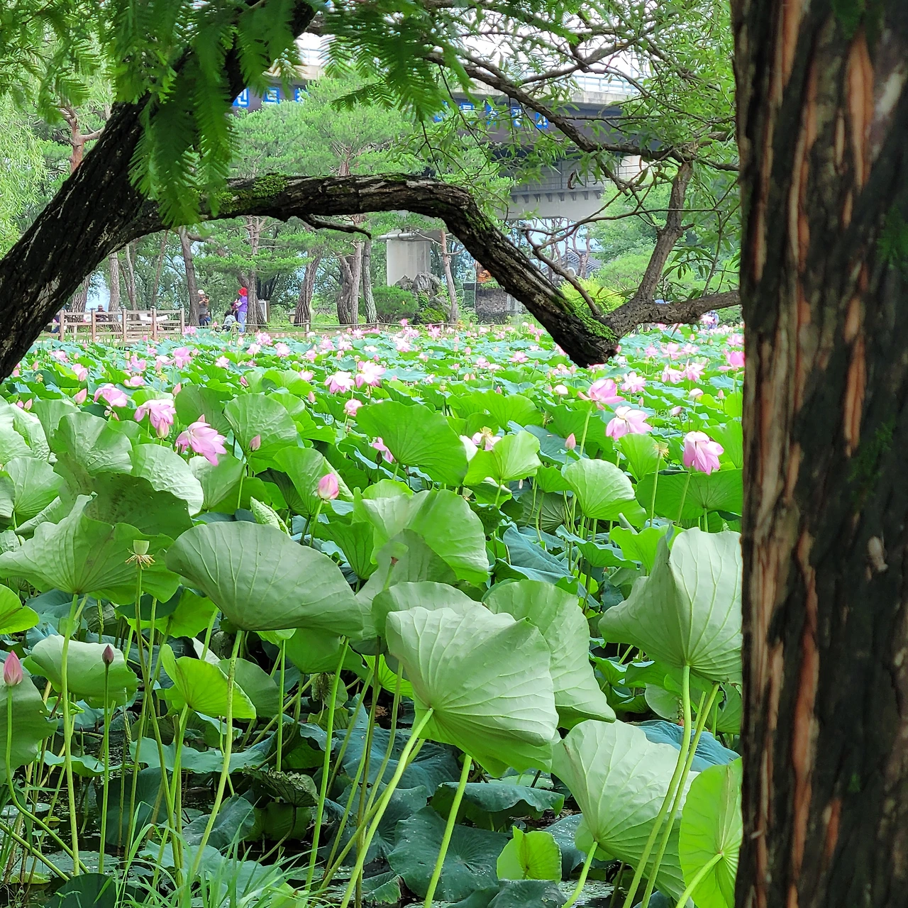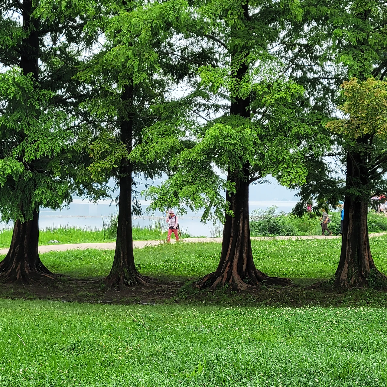 비가 많이 내려 한강에는 쓰레기들이 떠다닌다. 그래도 운무를 드리운 강안 풍경은 아름답다. 우람한 나무들이 빚어내는 풍경은 항상 감동이다. 마음을 편안하게 한다. 거른 점심을 연잎 핫도그 하나로 마무리를 하고 세미원으로 다시 돌아간다. 돌아가는 길 풍경도 이미 지나왔지만 다시 새롭다.