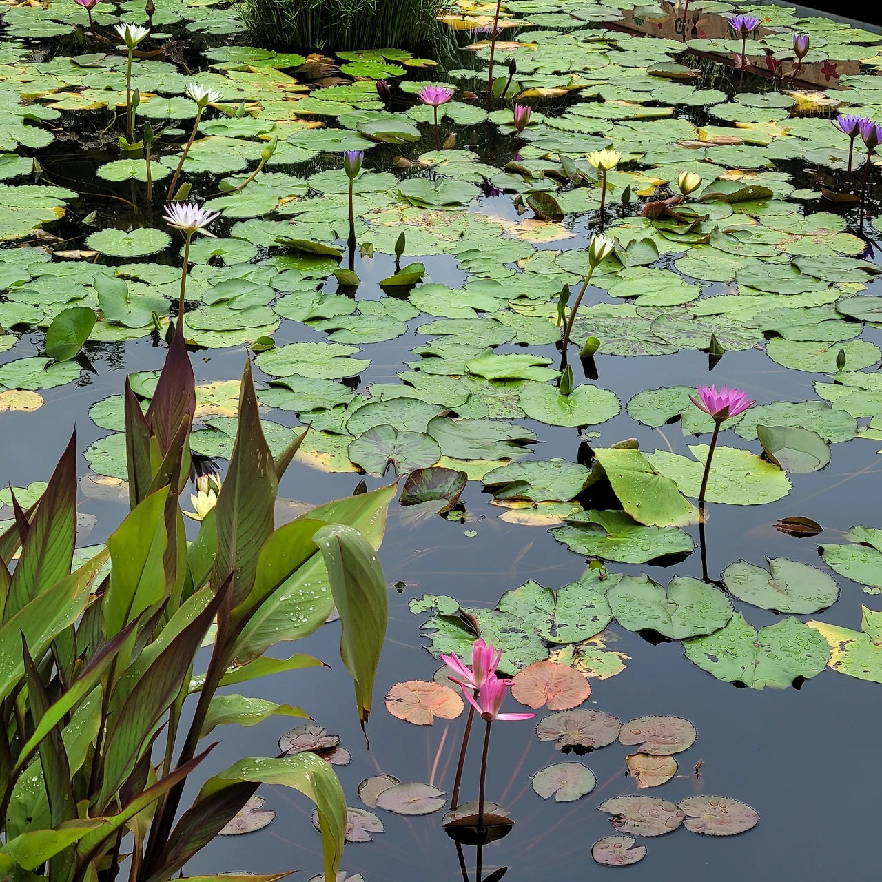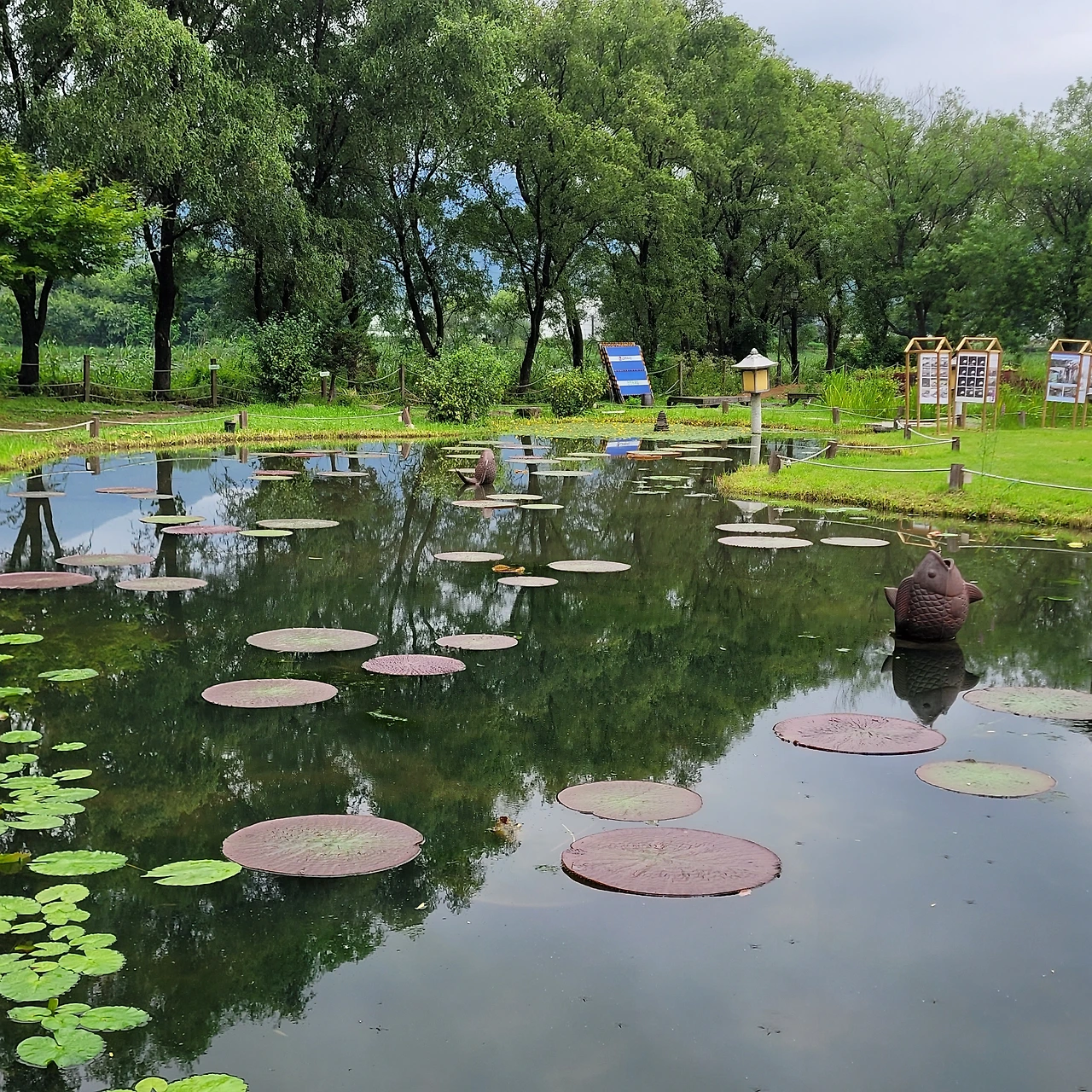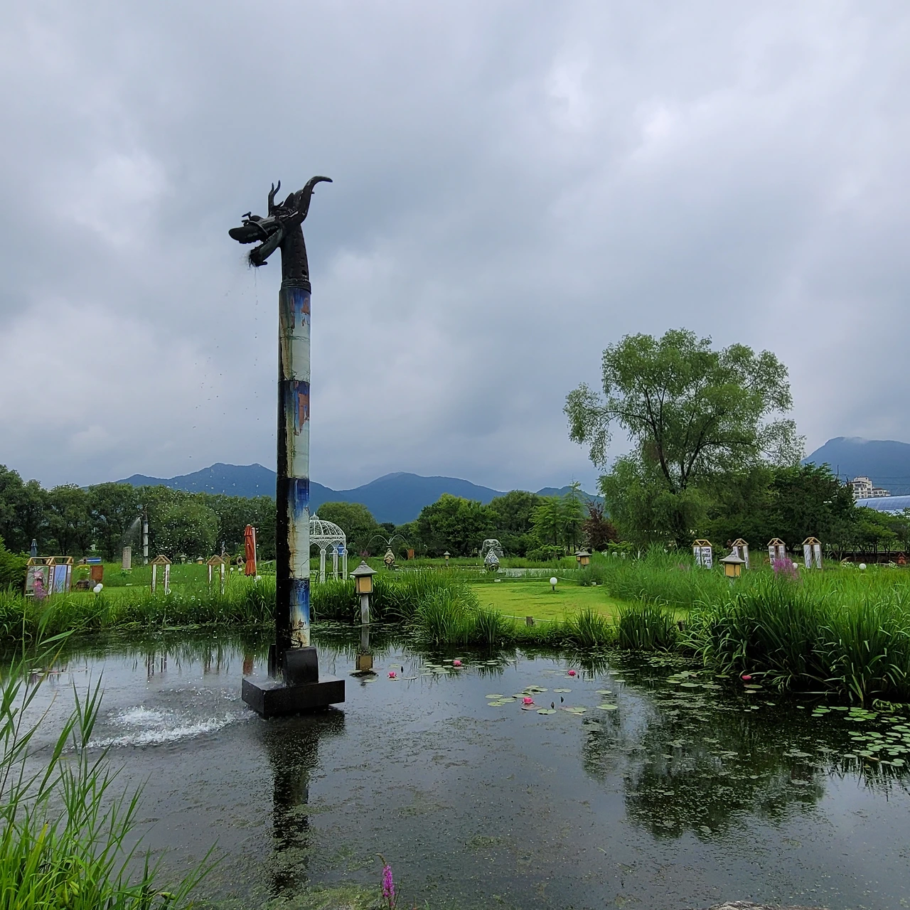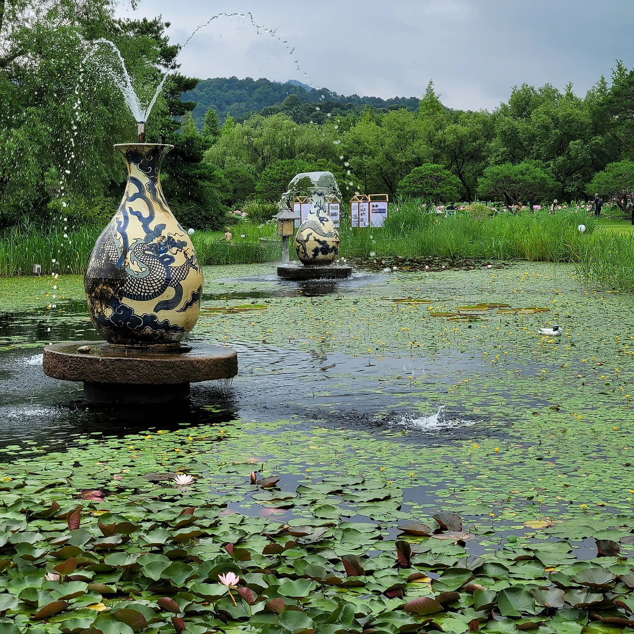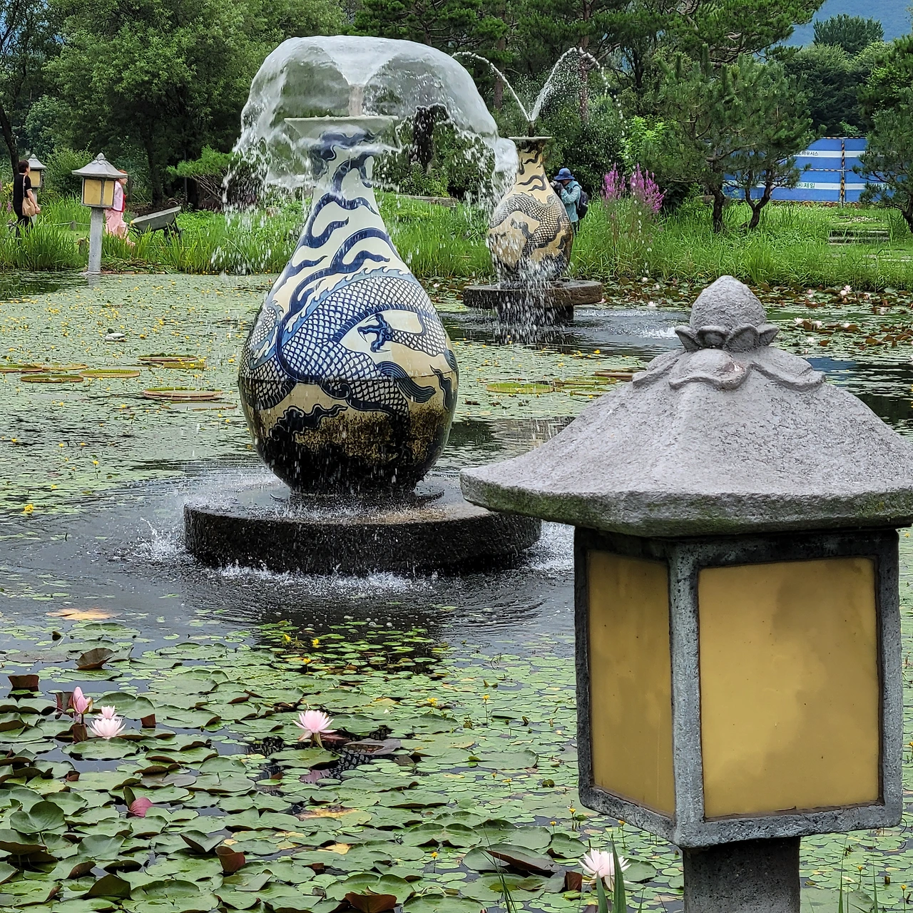 다양한 주제로 설계된 연못마다 독특한 분수가 있다. 용과 큰 도자기 화병이 물을 뿌리고 그 아래에는 연꽃과 수련들이 편안히 자리 잡았다. 어리연, 개연이 자라고 멸종식물인 가시연도 있다. 수련 중 으뜸인 빅토리아 수련도 넓은 잎을 드리웠지만 꽃은 피지 않았다.