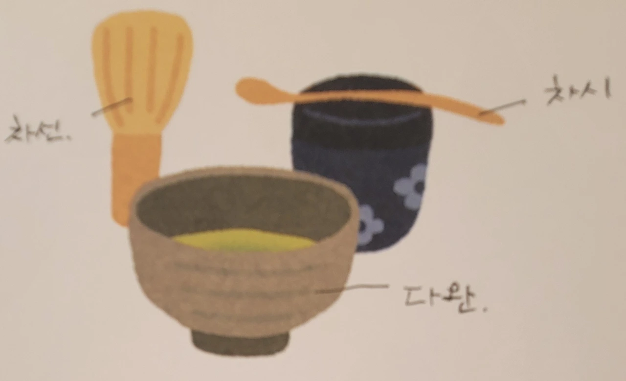 말차는 녹차를 마시는 것과 비교해서 다구와 절차가 단순하다. 말차를 마시는 데 필요한 도구는 다완과 차시와 차선이 전부다. 다완은 찻잔이고 차시는 말차를 더는 숟가락이며 차선은 거품을 만드는 도구다. 도구를 사용하는 법부터 격식이 있다. 복잡해 보이는 외적인 형식 절차가 오롯이 차에 집중하게 만드는 것이다. 일기일회( 一期一會)는 차와 관련된 것으로 일본 다도에서 오래전부터 쓰인 말이다. 평생에 단 한 번 만남 또는 그 일이 생애 단 한 번 뿐임을 이르는 말로 기회를 소중히 여겨야 한다는 의미다. 번다한 생각들을 버리고 차를 마시는 그 순간에 집중하는 것이다.