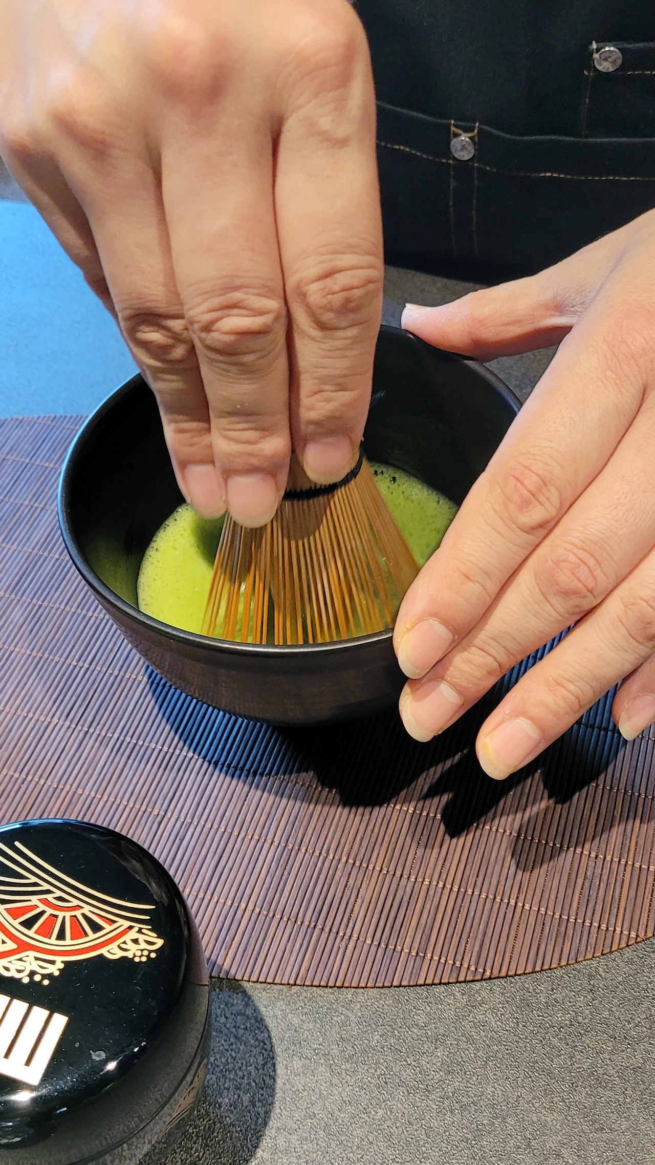 말차에는 격불(擊拂)이라는 절차가 필요하다. 세게 쳐서 떨쳐낸다는 의미로 차선을 이용하여 풍부한 거품을 만들어내는 과정이다. 선생님이 격불을 할 때는 거품이 자연스럽게 생겼는데 내가 직접 해보니 쉽지 않았다. 격불로 쓴 맛이 중화되고 부드러운 맛은 배가된다.