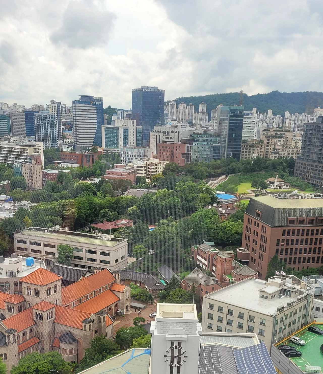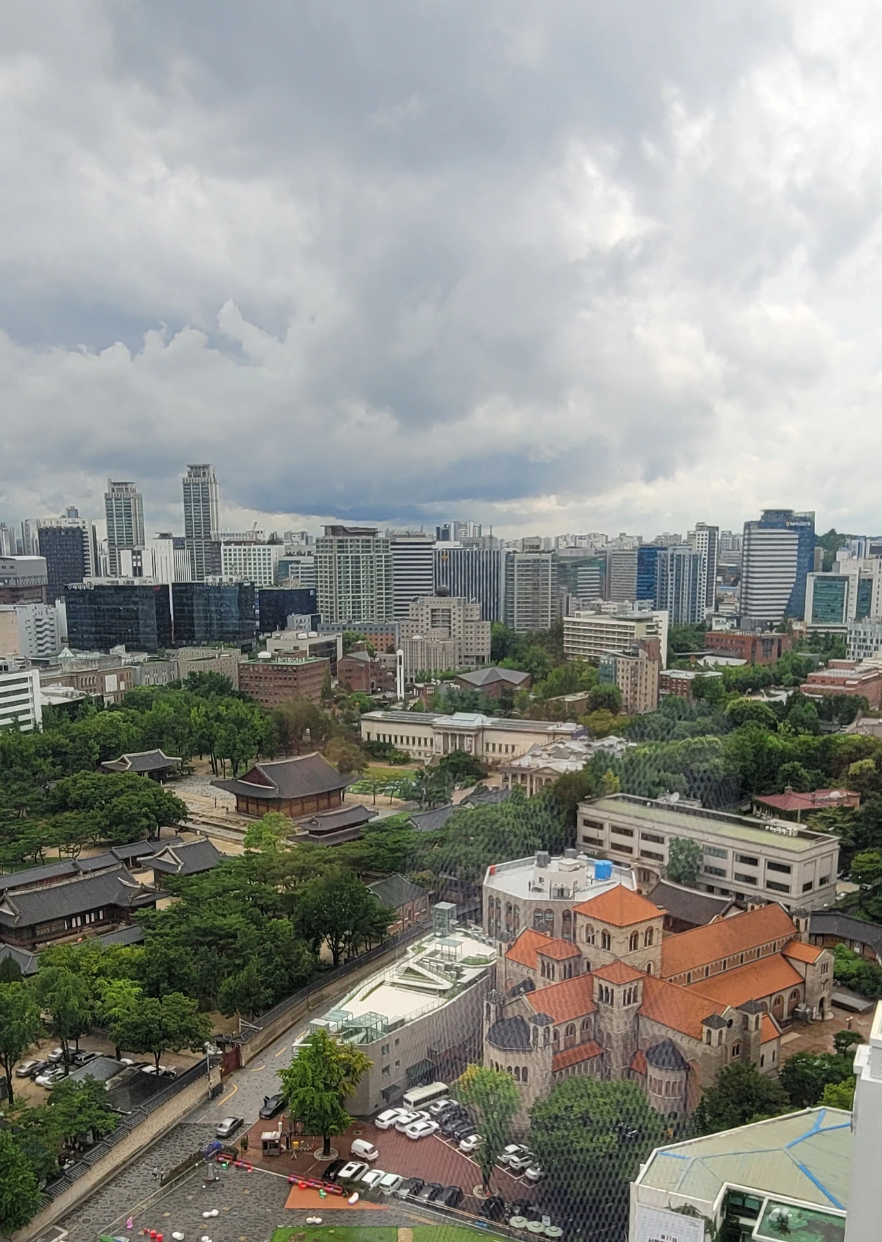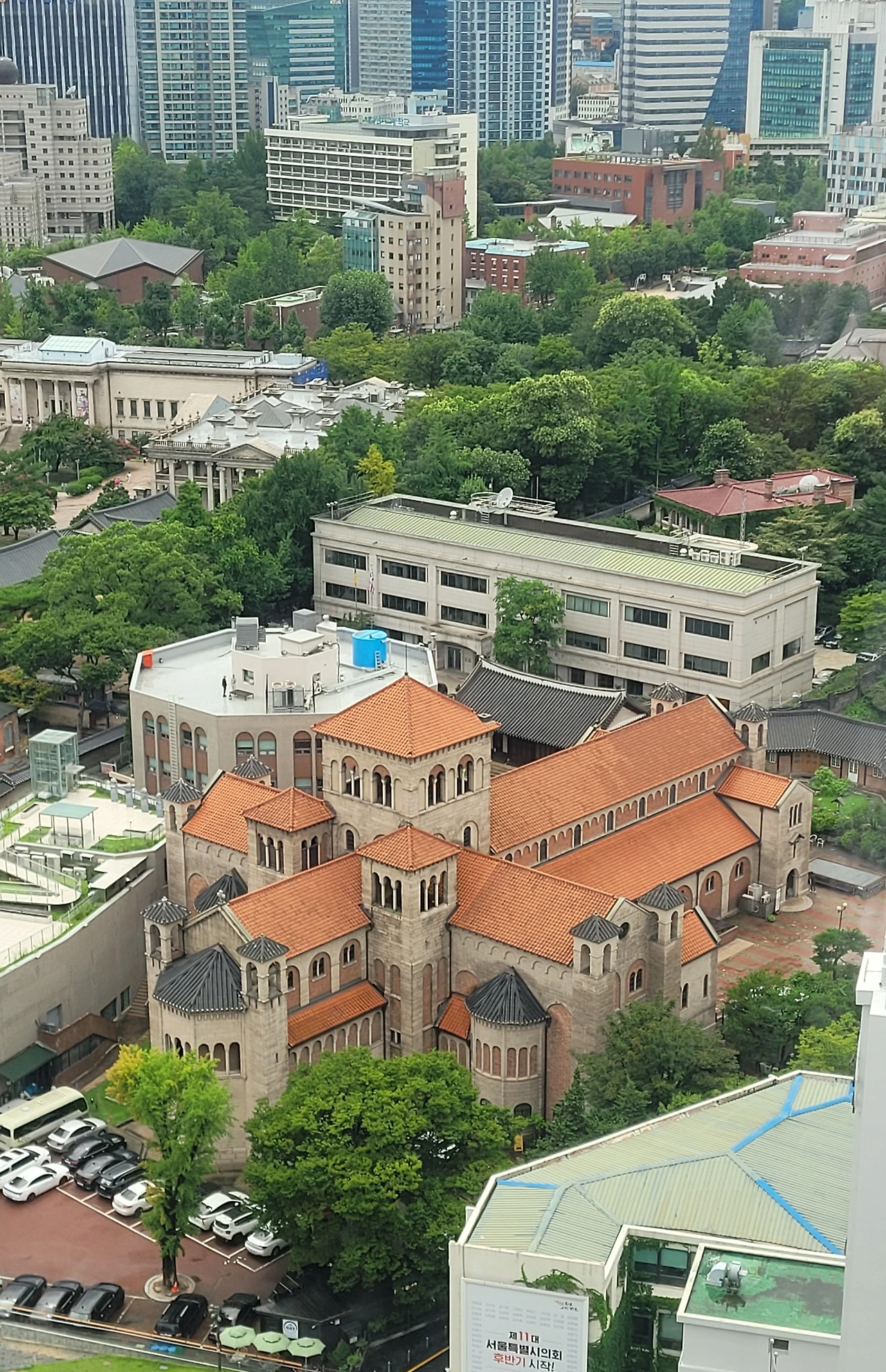 둘러본 식당은 다음에 오기로 하고 프레스 센터에 있는 호화스페이스 화랑에 그림을 보러 갔지만 다음 전시 준비 중이어서 볼 수 없었다. 수녀님이 20층 전망이 아주 좋다고 하셔서 엘리베이터를 탔다. 20층은 국제회의장과 식당이 있는데, 수녀님이 가끔 행사차 들르시는 곳이라 곧바로 비어 있는 룸으로 들어가 전망을 즐길 수 있었다. 성당전경과 수녀원 그리고 덕수궁이 한눈에 들어왔다. 아이들처럼 신이 나서 이곳저곳을 가리키며 도심 전망을 즐겼다.