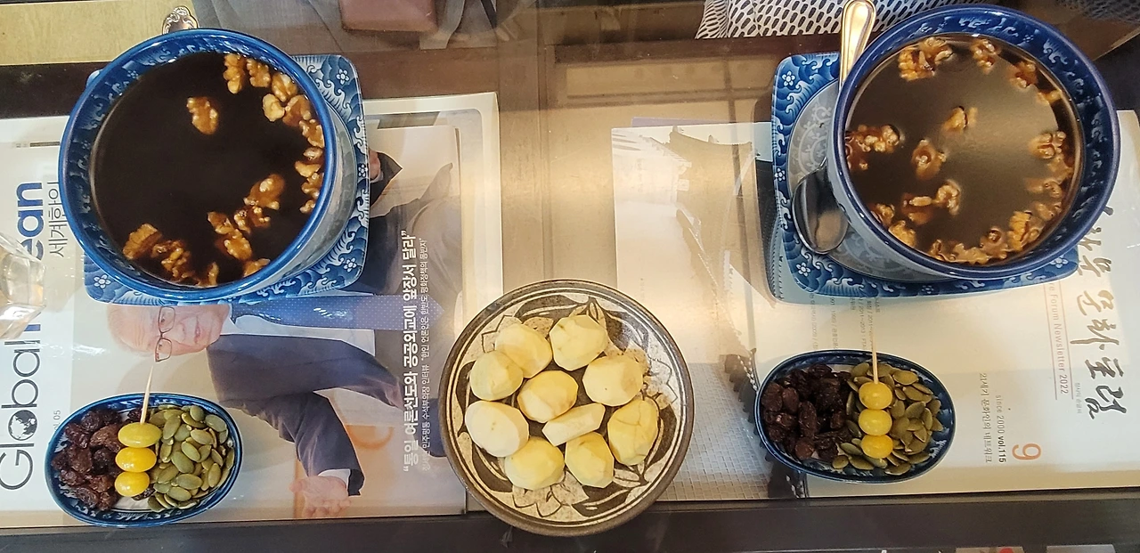 다음으로는 프레스센터 지하에 있는 전통 찻집에 들렀다. 내가 아는 곳으로 그분들께 보약 한 사발 같은 십전대보탕을 대접하고 싶었다. 이곳에서는 차에 곁들여 나오는 간식이 아주 다채롭다. 생밤과 은행 그리고 호박씨와 건포도가 있다. 쓴 십전대보탕과 함께 먹으면 그만이다. 두 분 다 아주 만족해하며 나온 차와 간식을 즐겼다.
