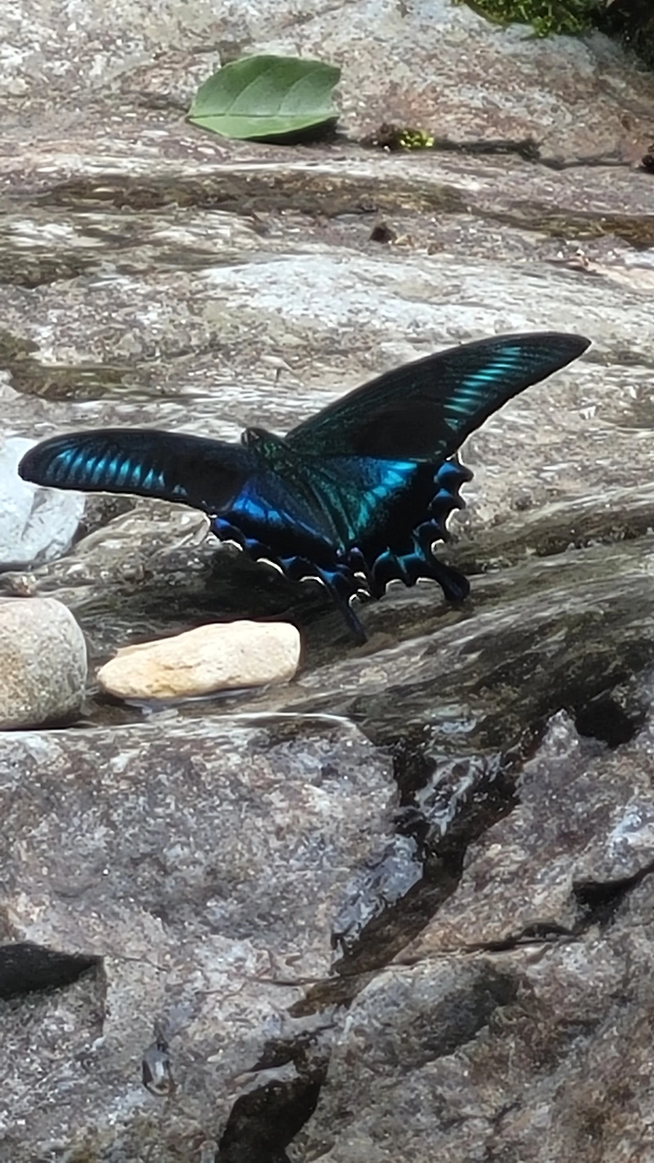 작은 폭포도 만난다. 물소리가 우렁차 보는 것만으로도 시원하다. 그렇게 마음껏 물길을 신나게 걸었다. 앞으로 넘어져 물을 먹을 뻔 한 뒤로 물길을 벗어나 산길로 걸었다. 가는 길에 아름다운 나비 한 마리를 만났다. 산제비나비다. 신비한 푸른빛 큰 날개를 가졌다. 나비를 바라보며 마음의 여유를 즐긴다.