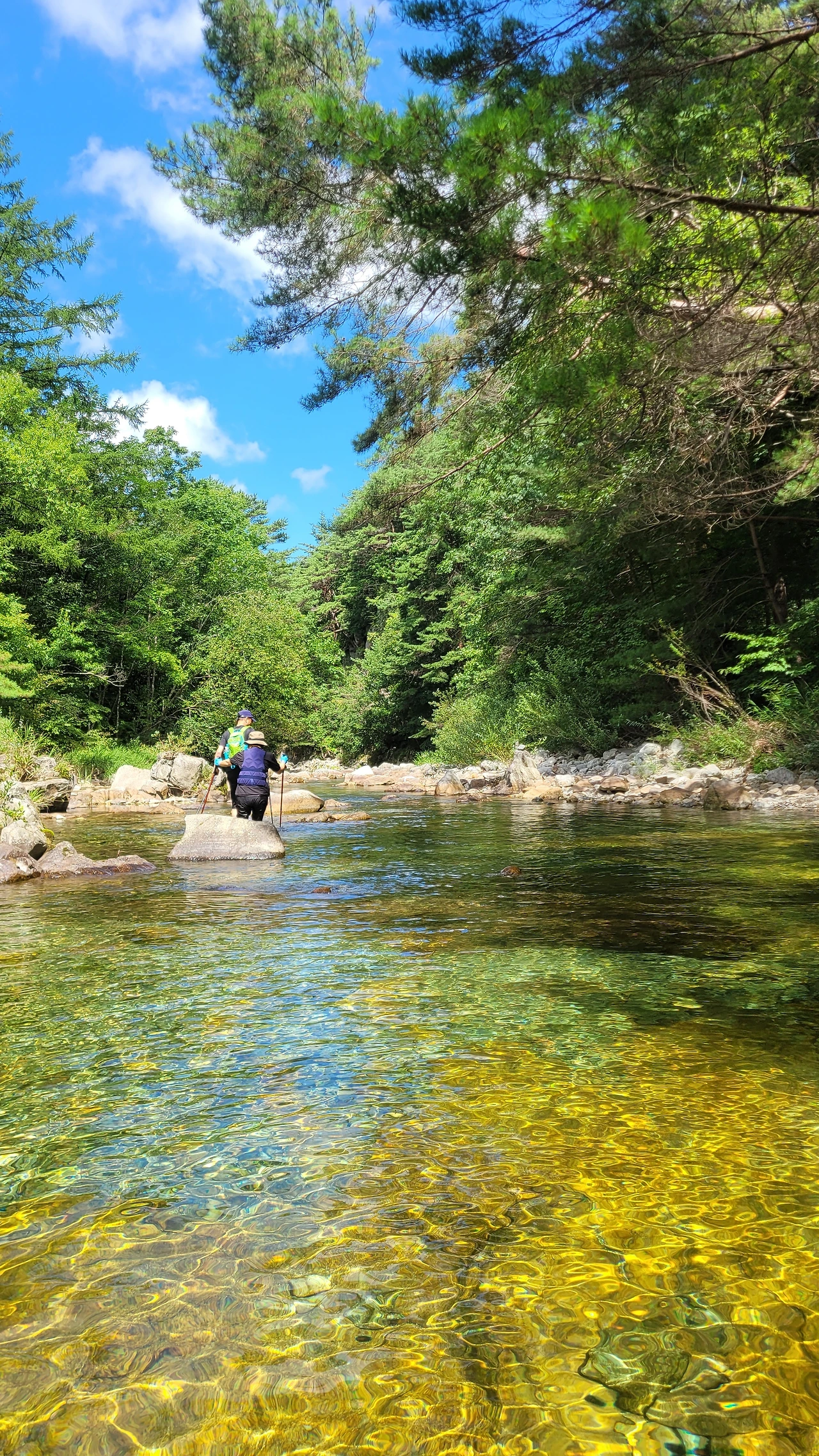더위를 식히고 간단한 간식 뒤에 본격적인 물길로 나선다. 상당히 비장한 분위기다. 물속에 있는 바위가 상당히 미끄러워 주의해야 하고 꼭 스틱을 써야 한다. 조심한다고 했지만 미끄러운 바위를 밟아 뒤로 넘어졌다. 다친 곳이 없으니 해프닝이다. 유난히 푸른 하늘에 흰구름이 한여름의 절정을 알린다.