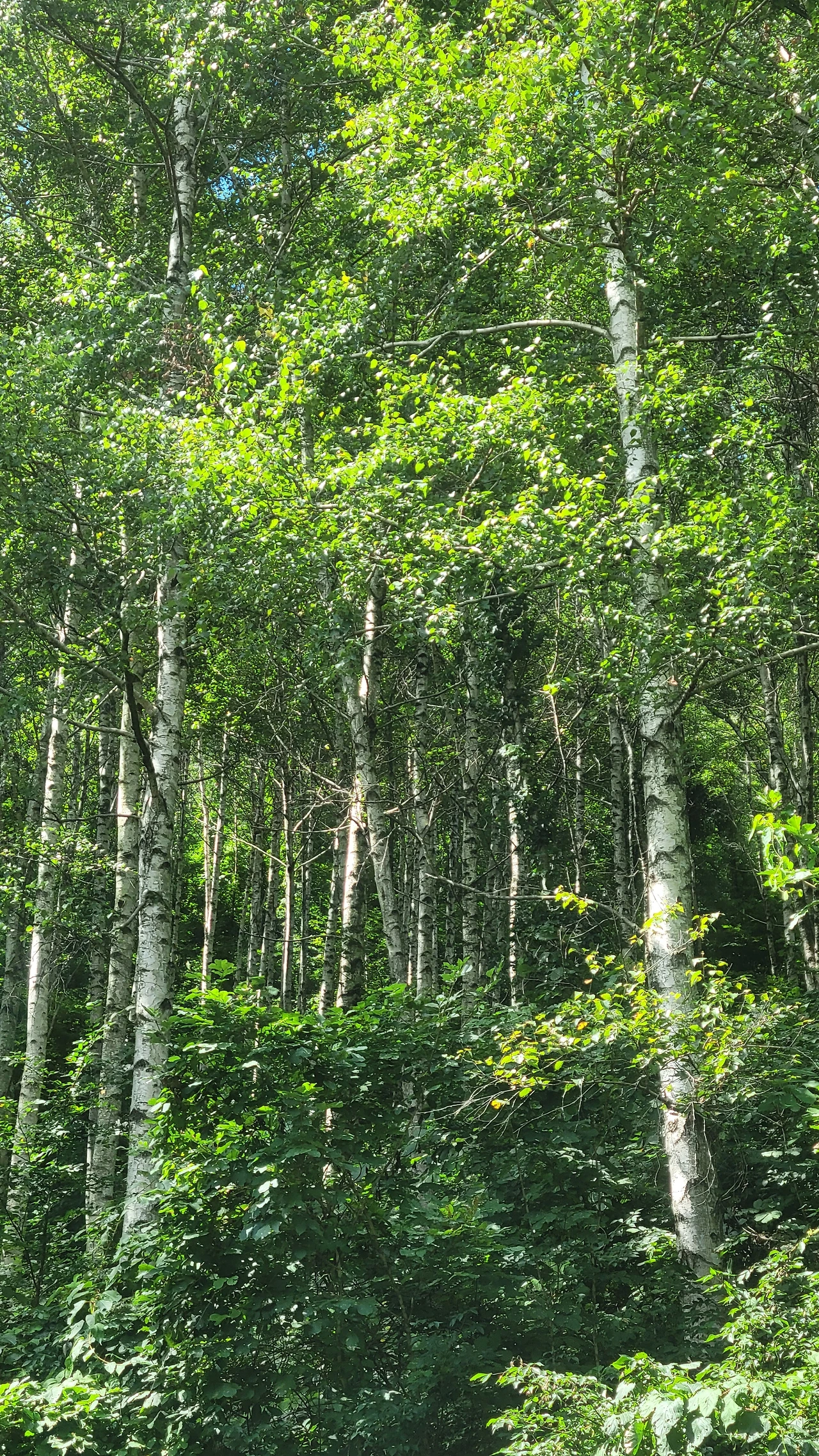 아침햇살이 녹음에 비쳐 눈부신 풍경이 눈길을 끈다. 한여름에 만나는 여름 풍경이 좋다. 산마루에 자작나무 군락이 있다. 흰 수피가 도드라져 보인다. 자작나무가 풍기는 우아한 자태가 언제 봐도 매력적이다.