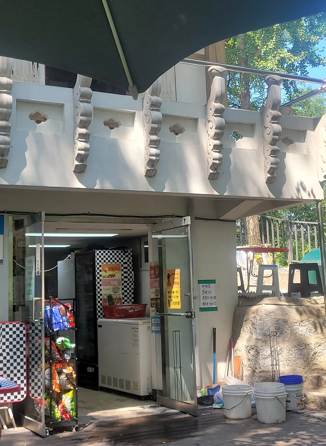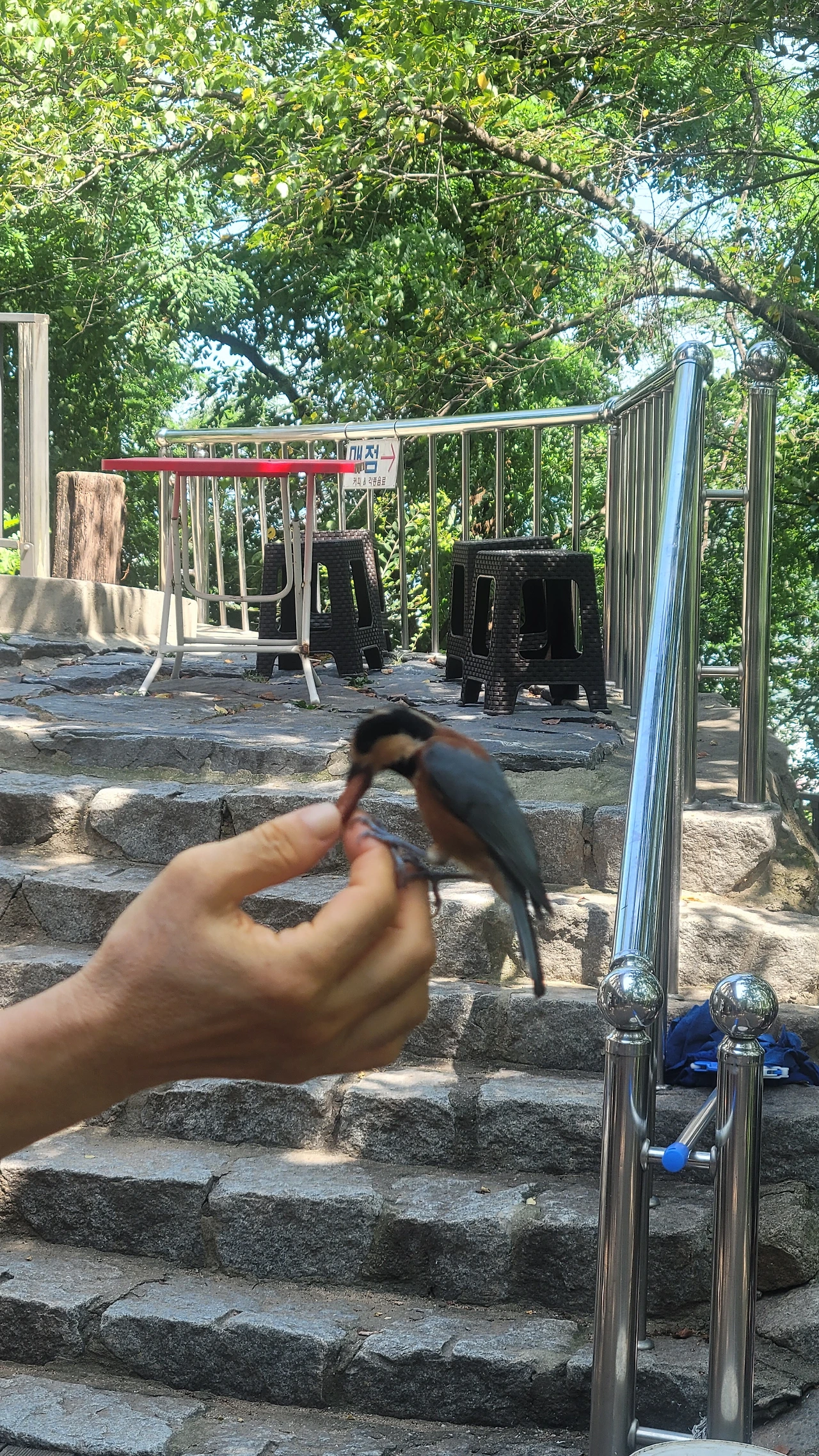 정상에는 도당굿을 하는 한옥이 있고 그곳에 매점이 있다. 바람도 시원한 이곳에서 주인이 직접 만든 식혜를 맛보았다. 더운 데다 배도 고팠는데 은은한 단맛과 시원함이 갈증과 배고픔을 한 번에 날려버린다. 주인 아주머지는 마음이 고운 분으로 새들을 위해 물통과 밥통을 달아놓았다. 더 놀라운 것은 새들이 날아와 아주머니에게 모이를 받아 물고 간다는 것이다. 곤줄박이 한 마리가 찾아와 아몬드 한 알을 물고 가는 광경을 눈앞에서 목격했다. 놀라운 광경에 감동을 맛본다. 나도 따라 해보려 했으나 아무리 기다려도 오지 않아 포기하고 말았다.
