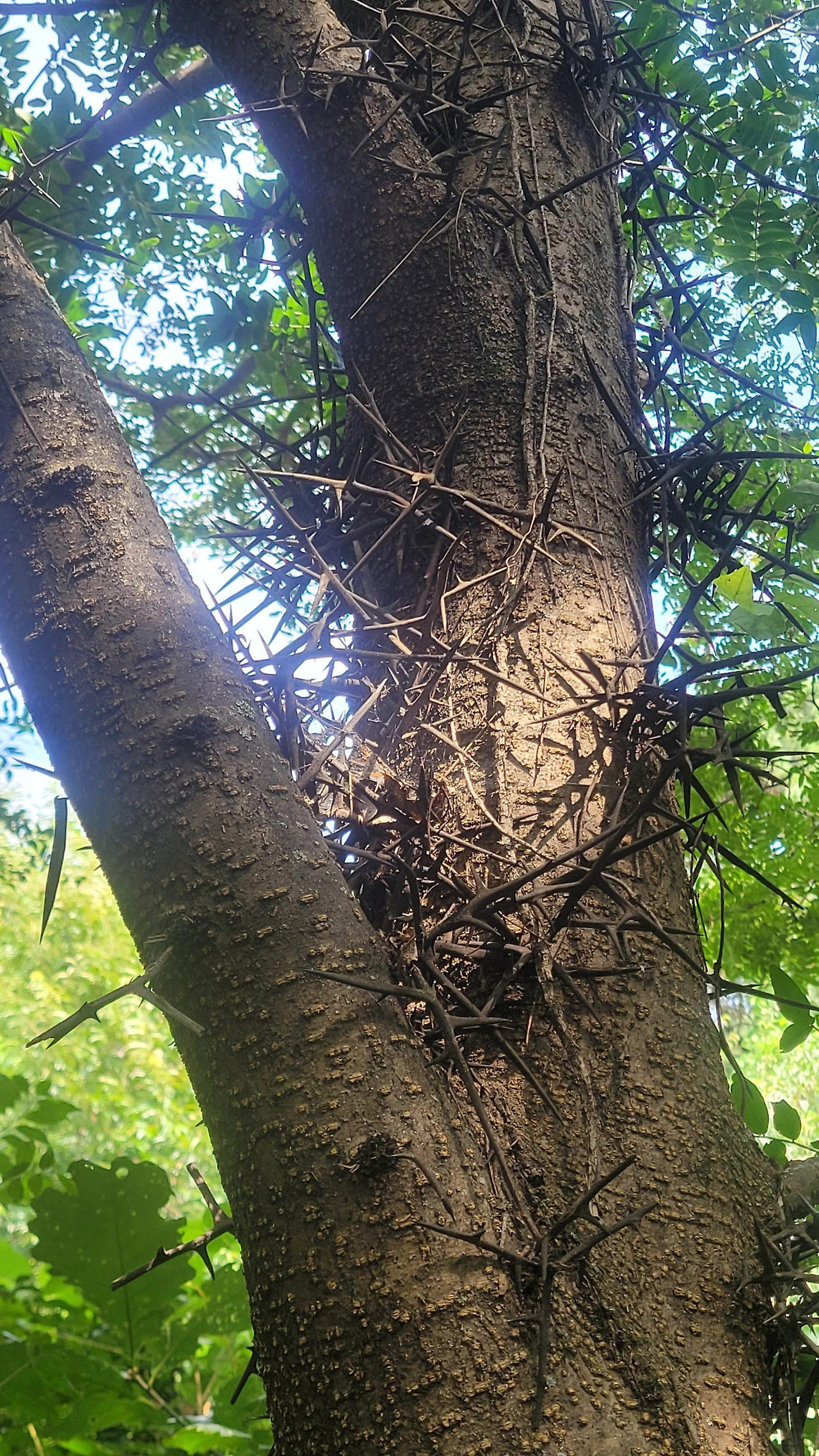숲 탐방의 주제는 주로 나무라 매의 눈으로 숲을 관찰하며 걷는다. 입구에서 특별한 나무를 만났다. 주엽나무로 아까시나무와 비슷하게 생겼는데 특별한 점은 무시무시하게 생긴 가시가 수피에 위협적으로 달린 것이다. 자신을 천적으로부터 보호하기 위해 장착한 무기로 거목으로 자라면 자연스럽게 가시가 없어진다고 한다. 콩과 식물이 그렇듯 가을에 콩꼬투리가 달리는 데 크기도 길이도 모양도 아주 독특하다. 거의 30센티미터를 훌쩍 넘게 배배 꼬인 커다란 꼬투리가 맺힌다. 꼬투리 안에는 사람이 먹을 수 있는 부분도 있다고 한다.